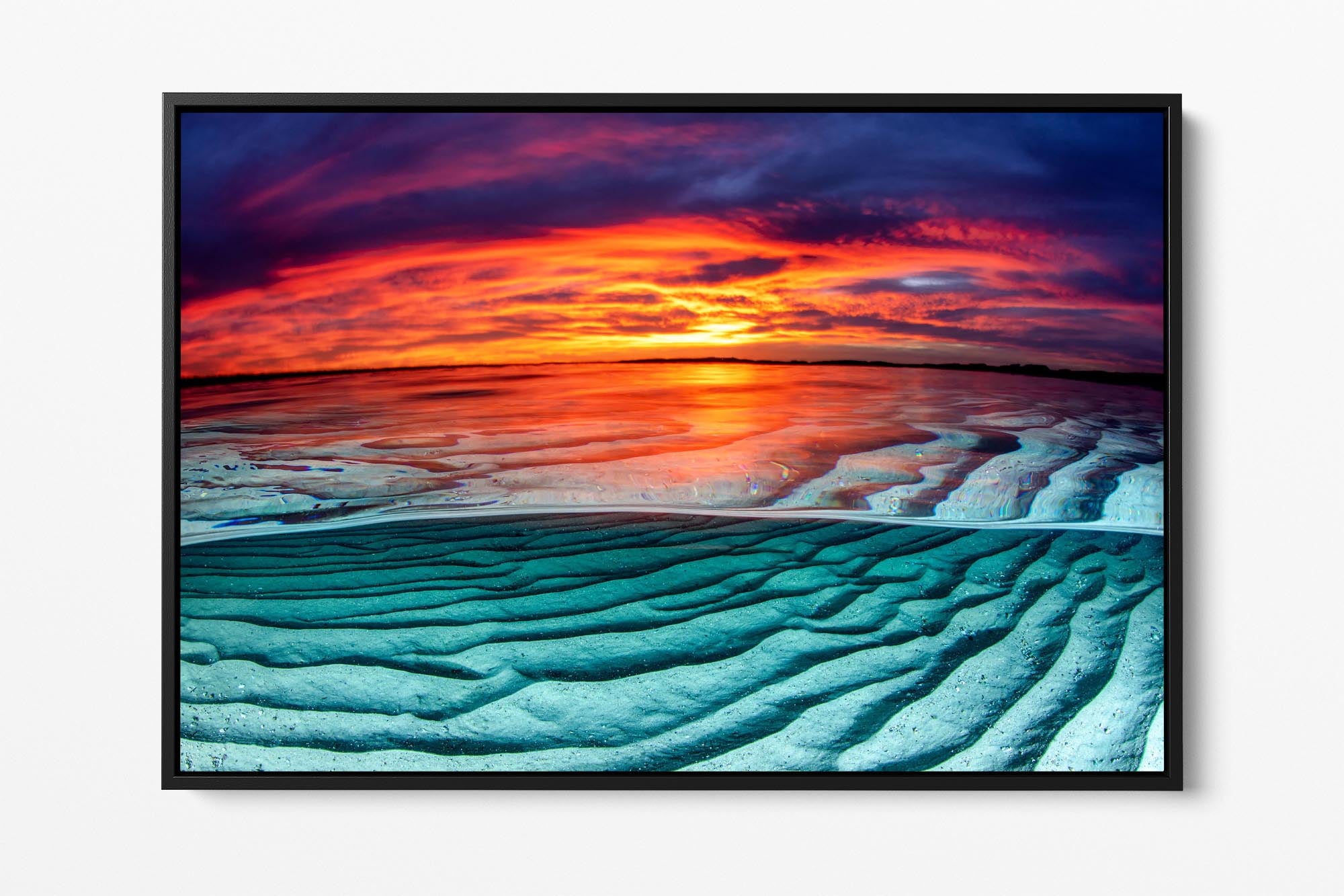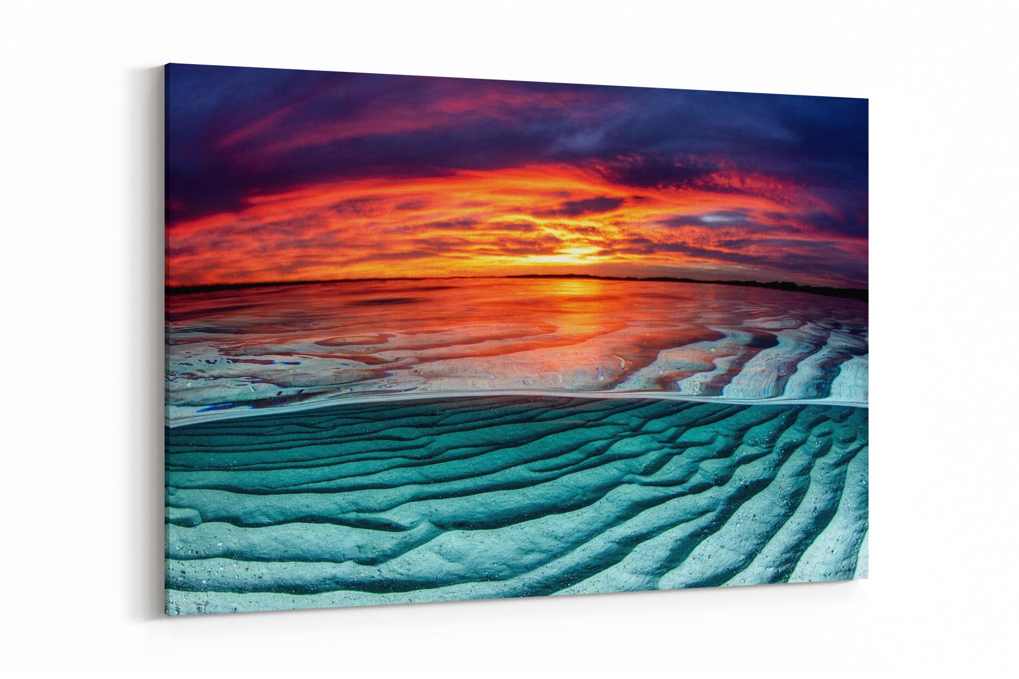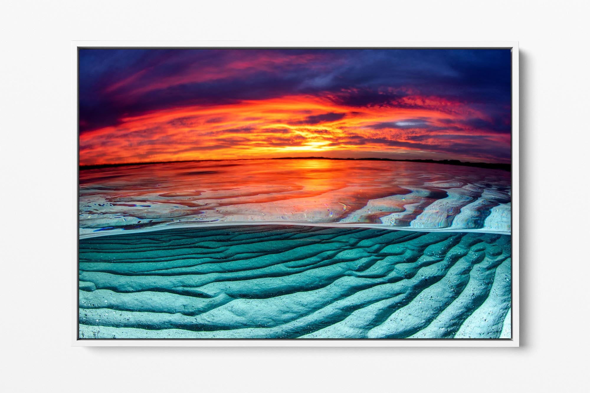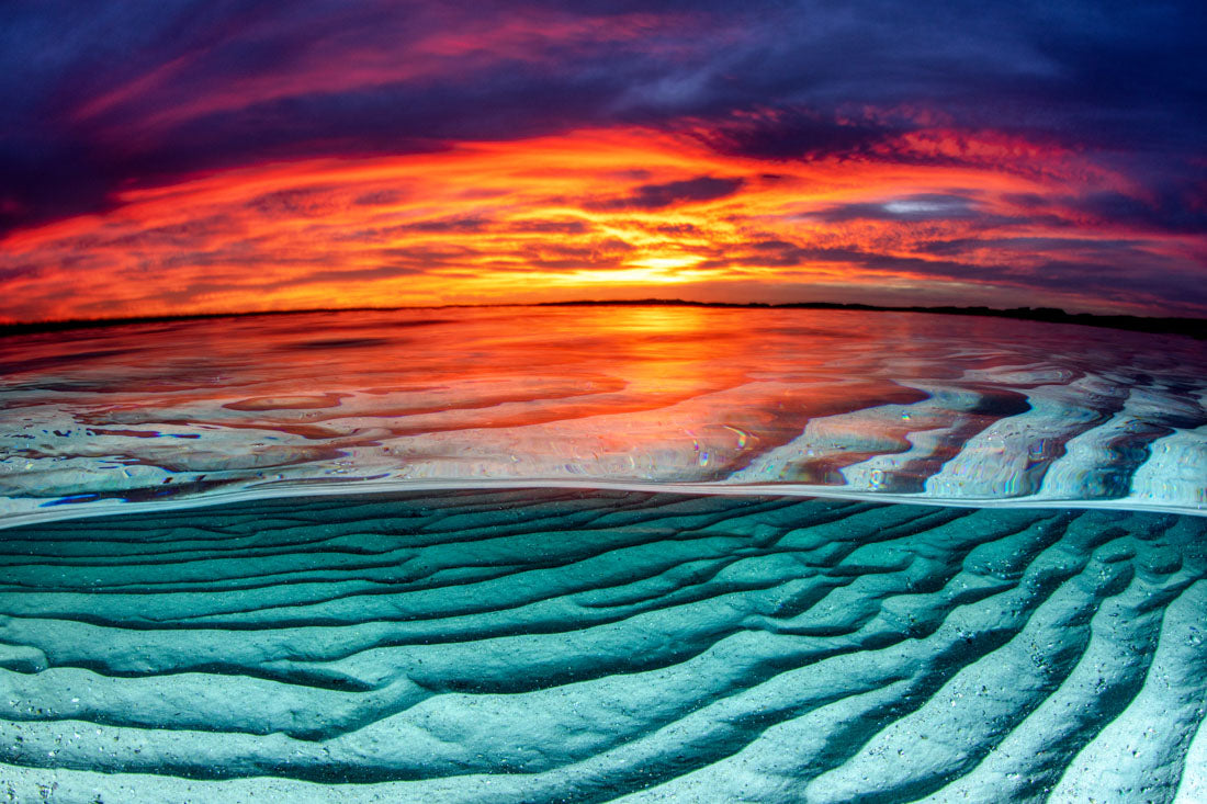 An over under photo go a vivid sunrise as seen from the water at Huskisson Beach, Jervis Bay.