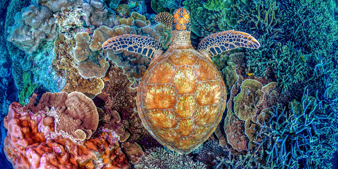 An endangered Green Sea Turtle glides over vibrant and healthy coral gardens on the Great Barrier Reef.