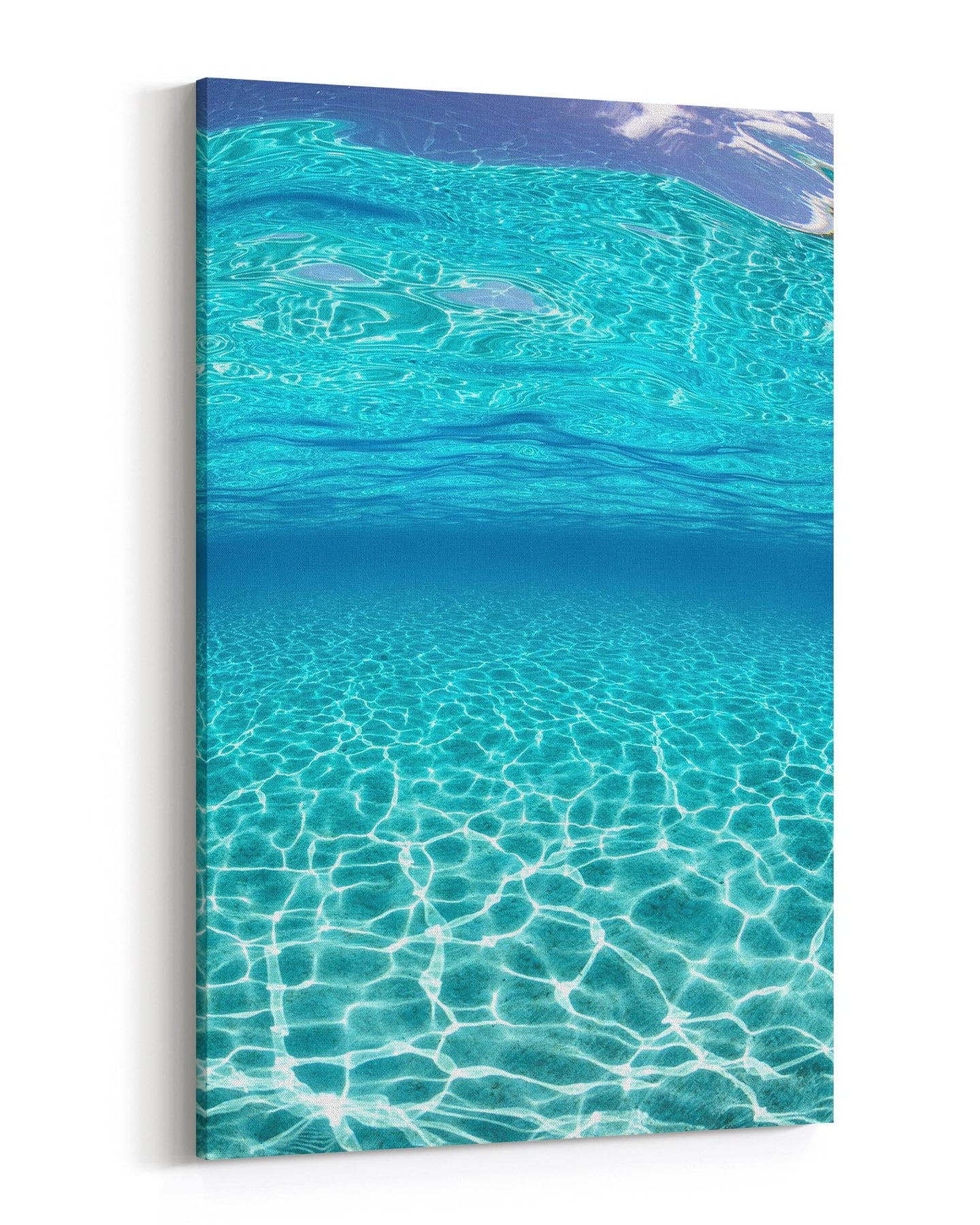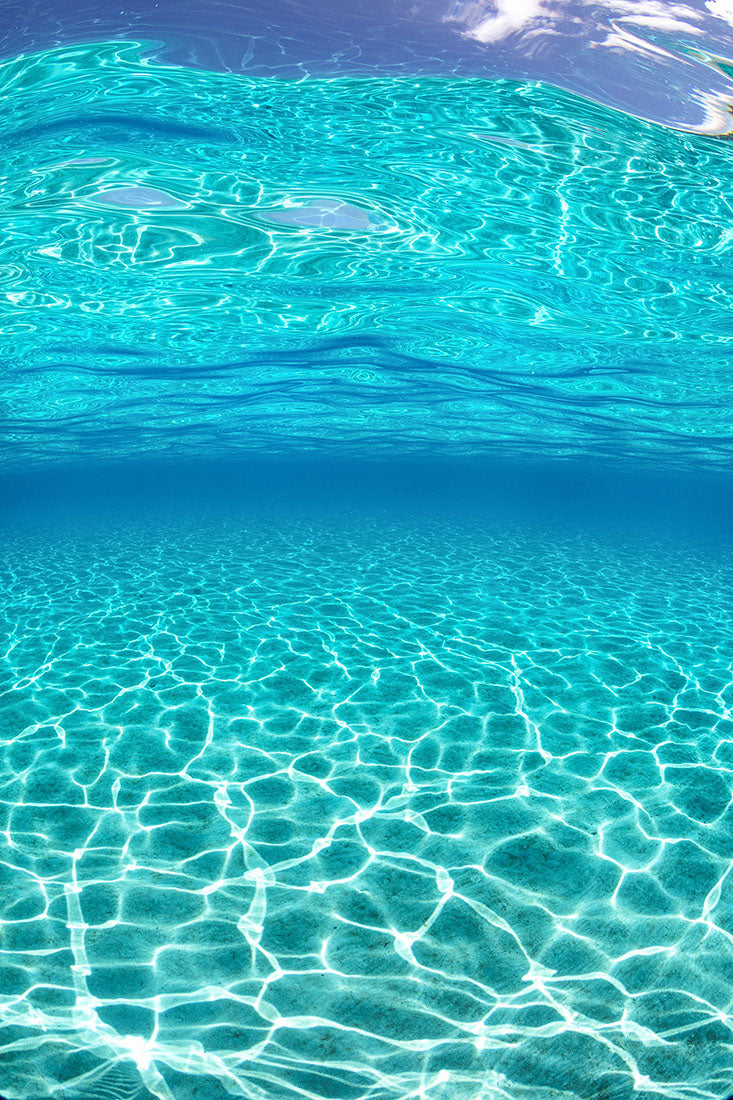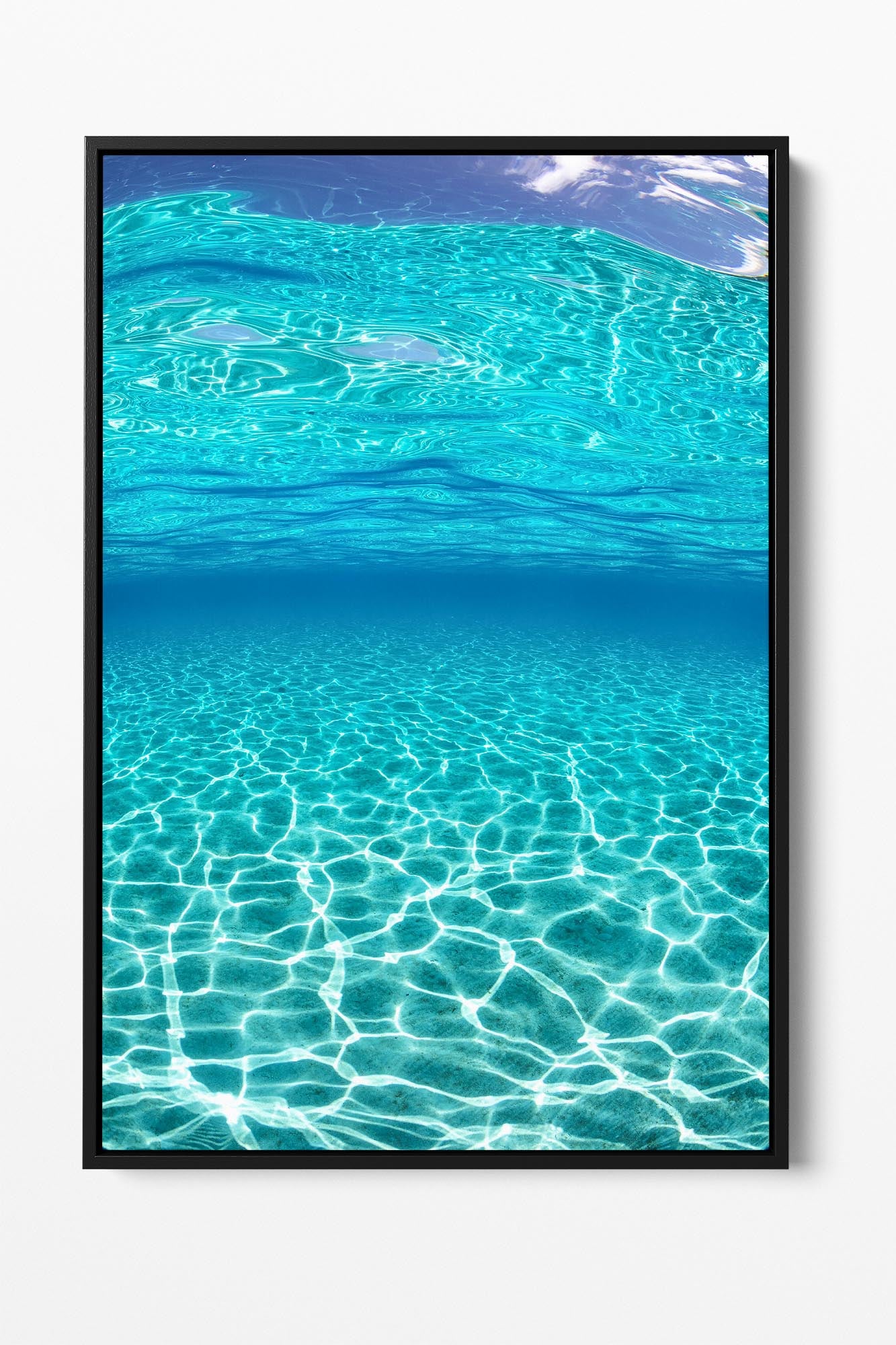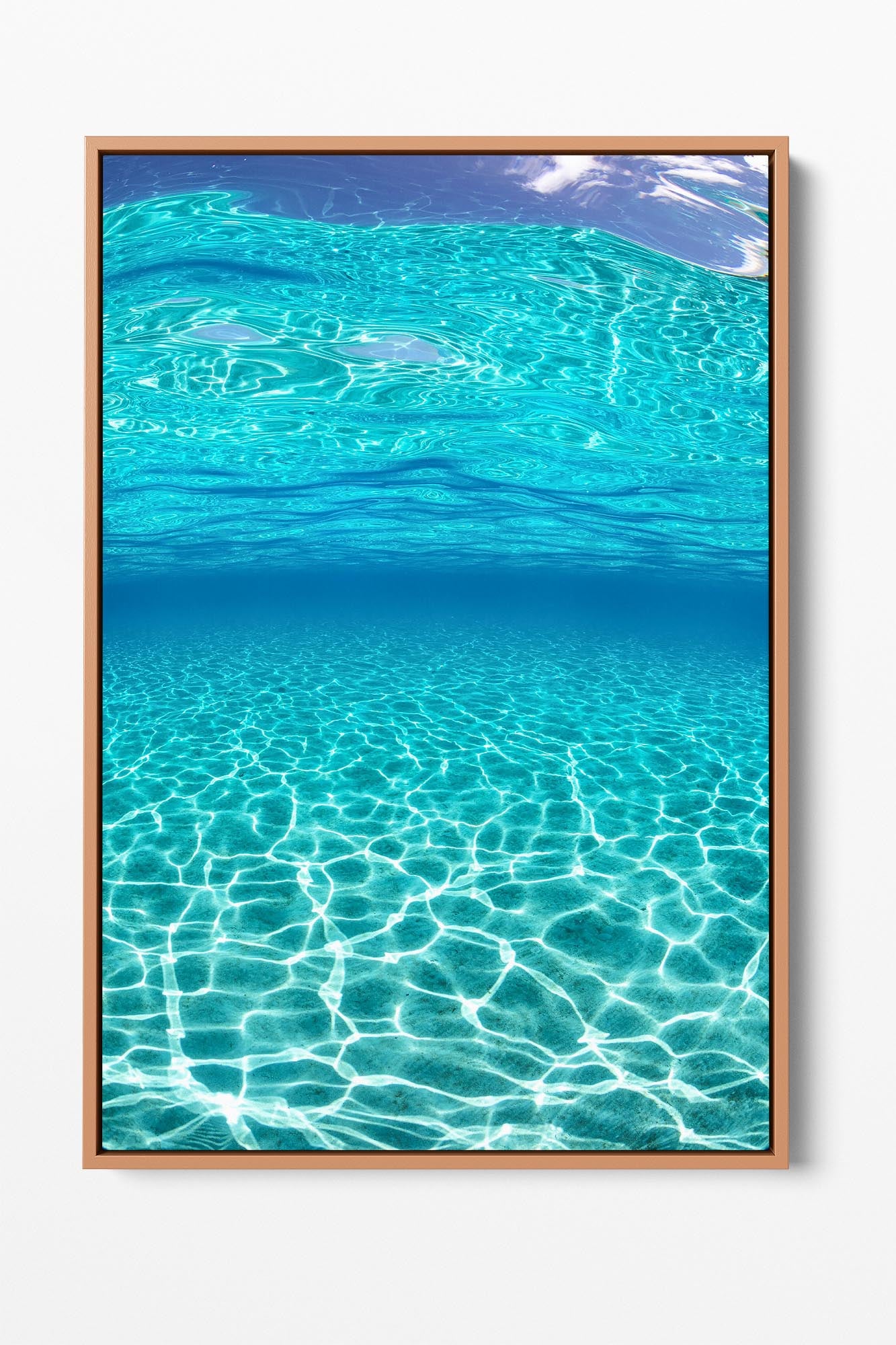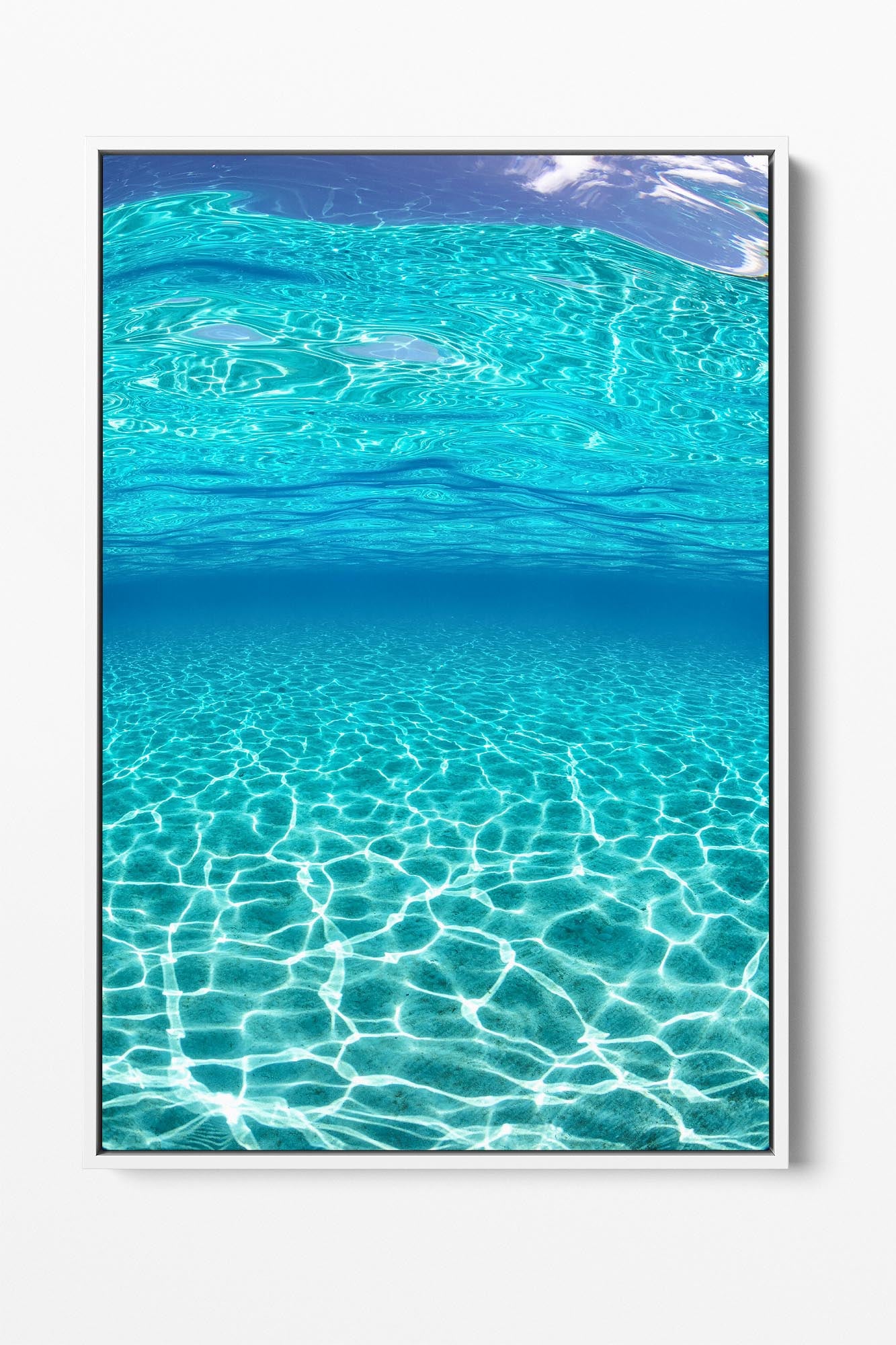 Photo print of light rays dancing upon the sandy sea floor in crystal clear water in the lagoon in Mo'orea, French Polynesia.