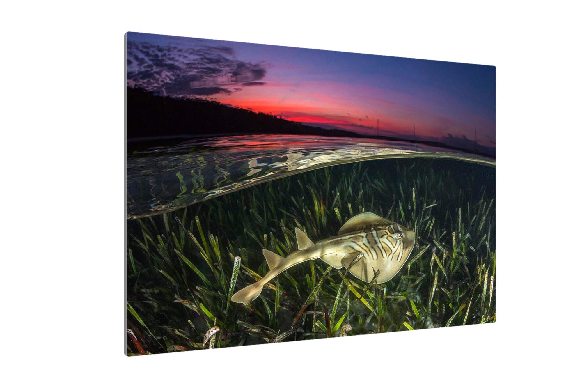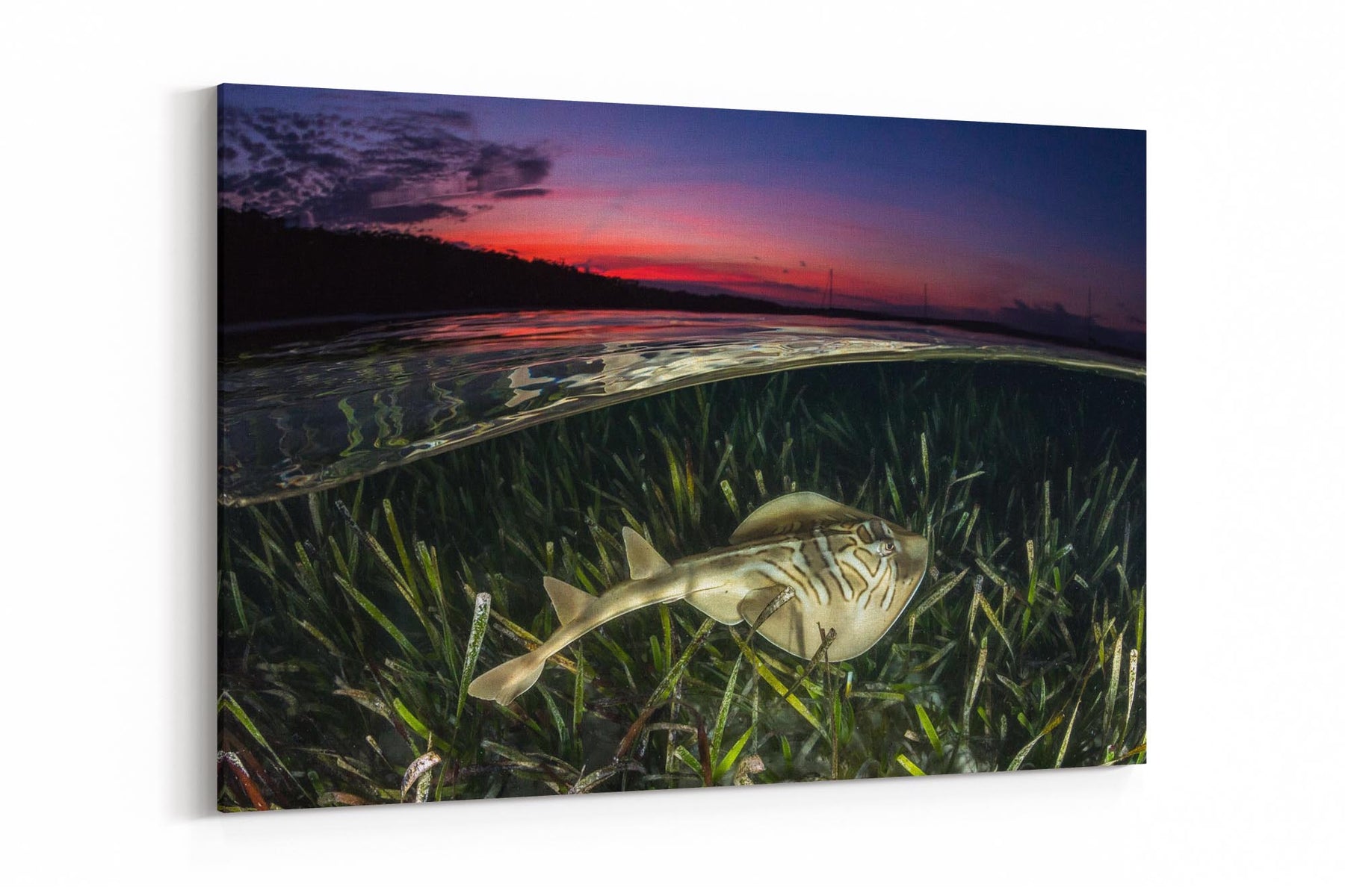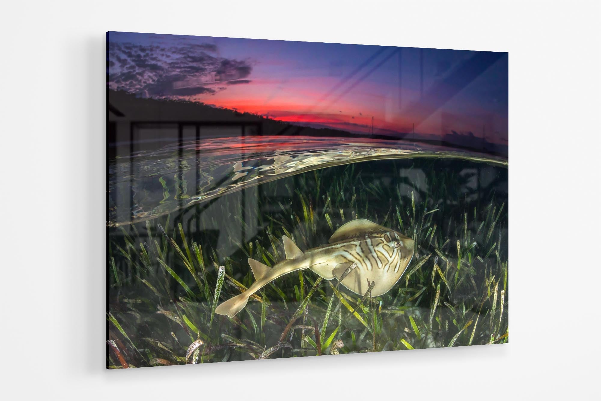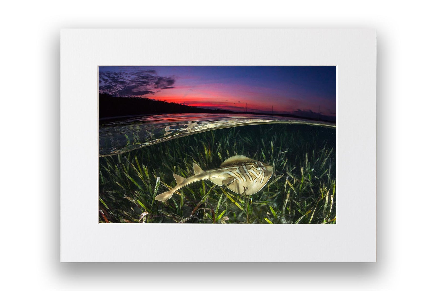 This captivating over-under / split shot print captures an Eastern Fiddler Ray (commonly known as a Banjo Shark) gliding gracefully over seagrass beds in Jervis Bay as the sun sets. The split-level composition blends the warm, fiery tones of the sunset above the water with the cool hues of the shallows below, highlighting the ray’s unique patterns and the ecological richness of its seagrass habitat.