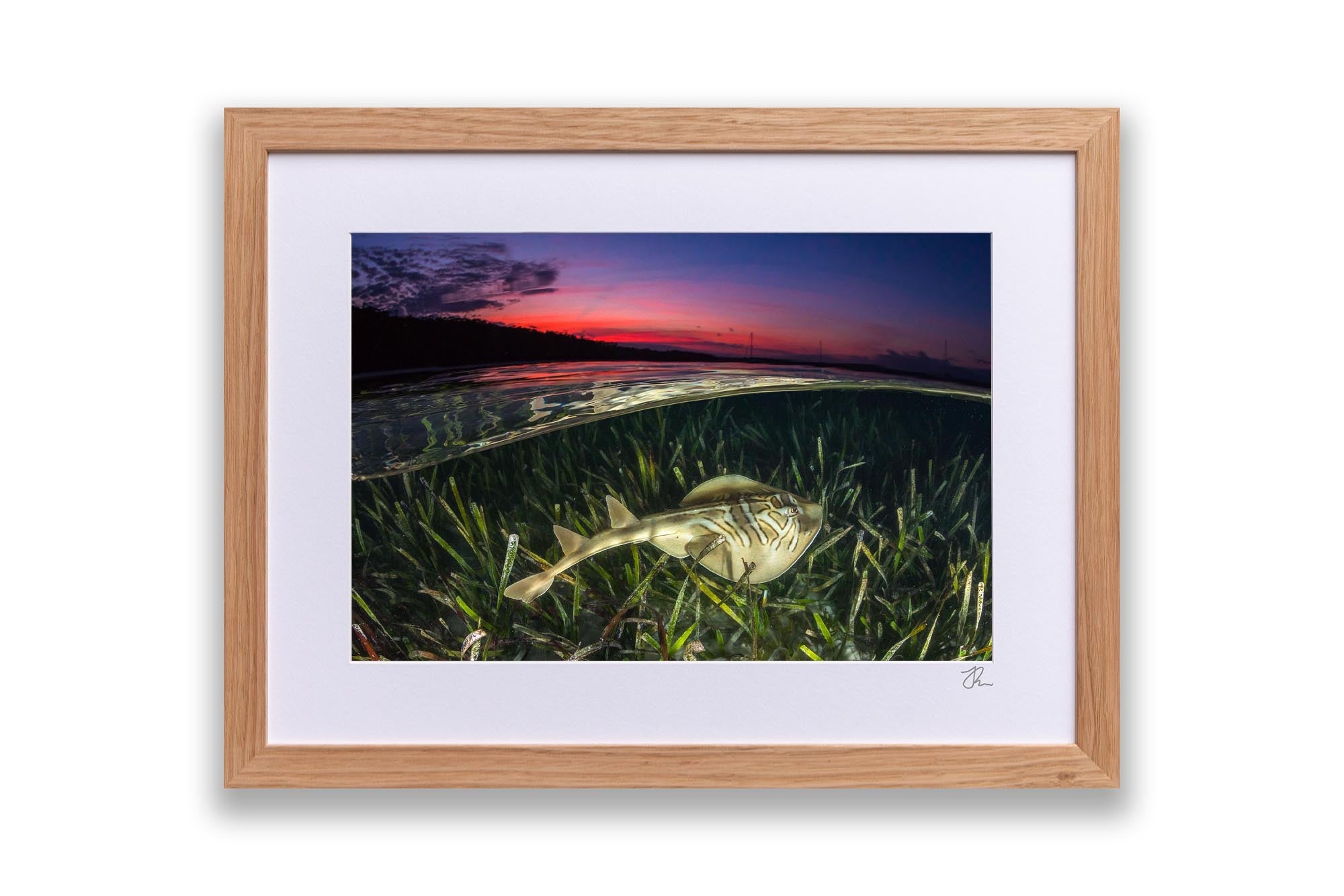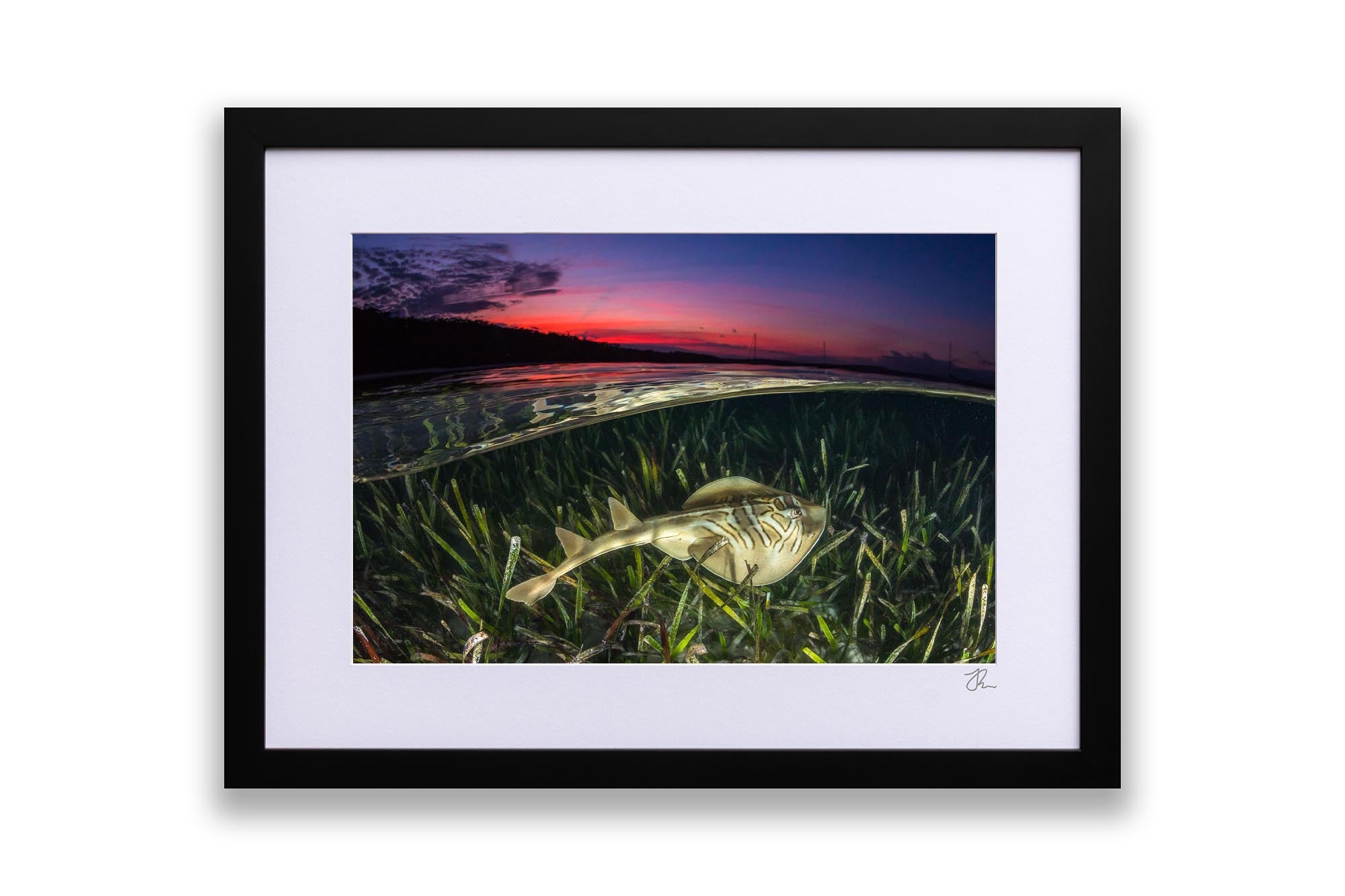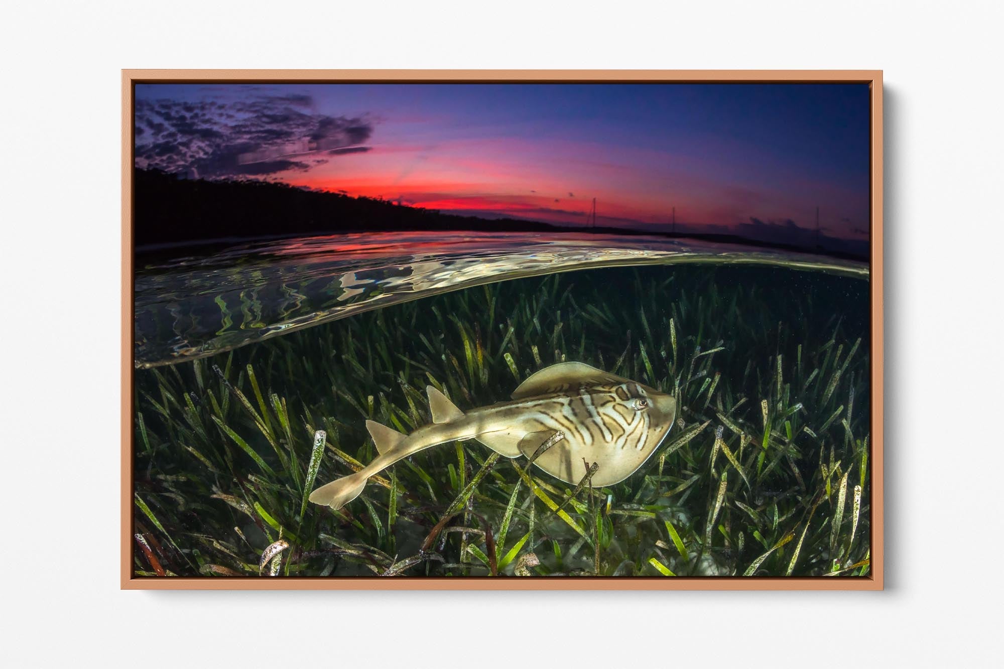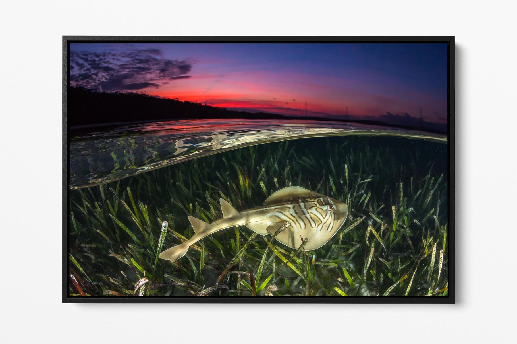 This captivating over-under / split shot print captures an Eastern Fiddler Ray (commonly known as a Banjo Shark) gliding gracefully over seagrass beds in Jervis Bay as the sun sets. The split-level composition blends the warm, fiery tones of the sunset above the water with the cool hues of the shallows below, highlighting the ray’s unique patterns and the ecological richness of its seagrass habitat.