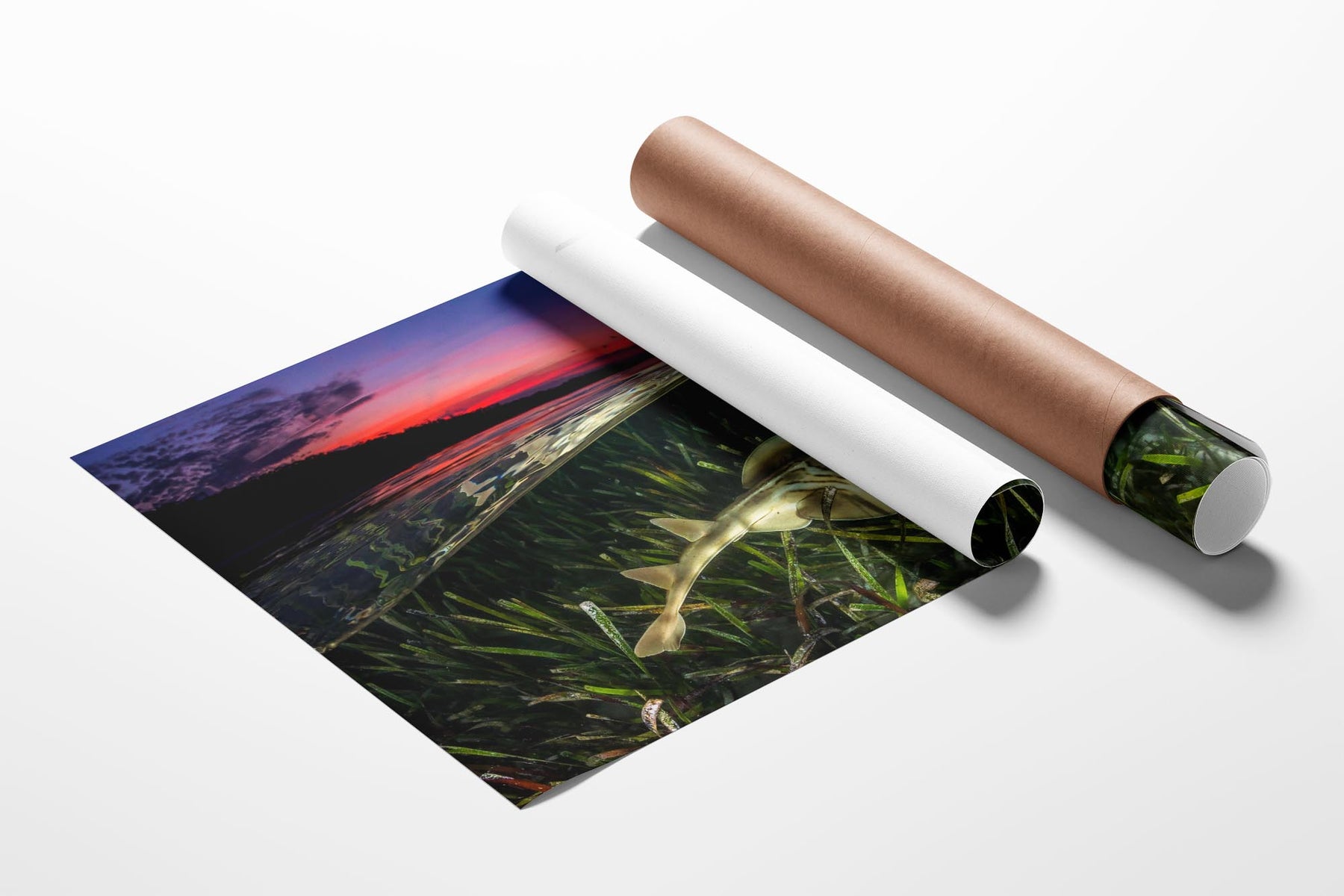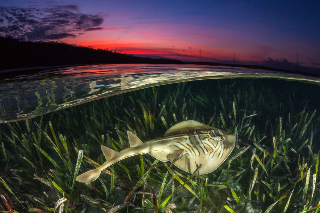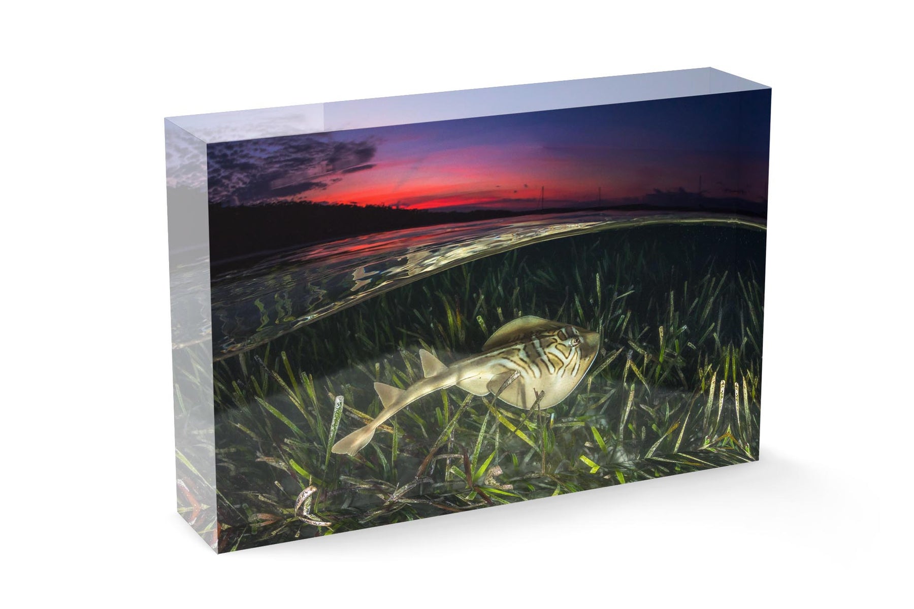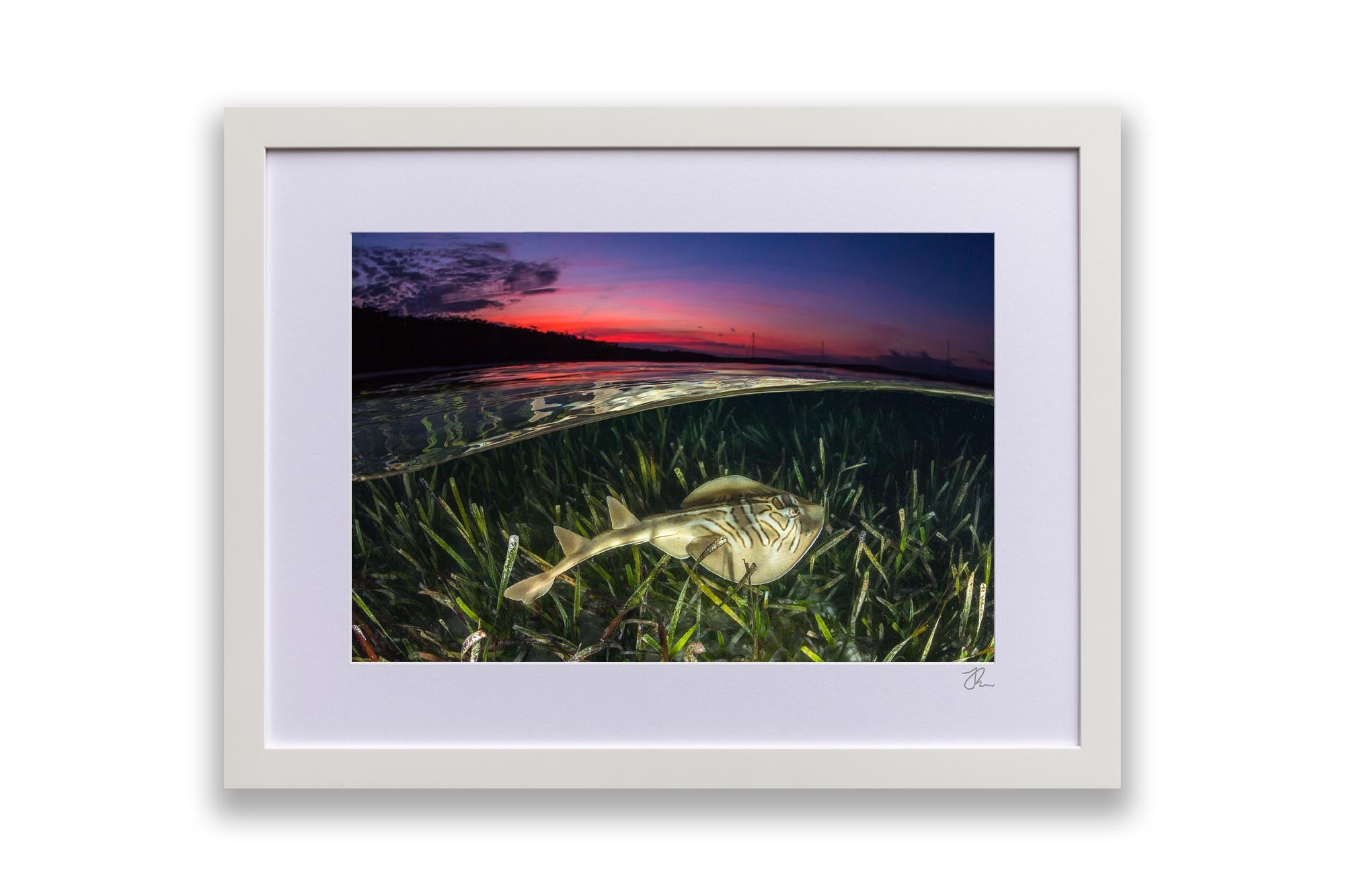 This captivating over-under / split shot print captures an Eastern Fiddler Ray (commonly known as a Banjo Shark) gliding gracefully over seagrass beds in Jervis Bay as the sun sets. The split-level composition blends the warm, fiery tones of the sunset above the water with the cool hues of the shallows below, highlighting the ray’s unique patterns and the ecological richness of its seagrass habitat.
