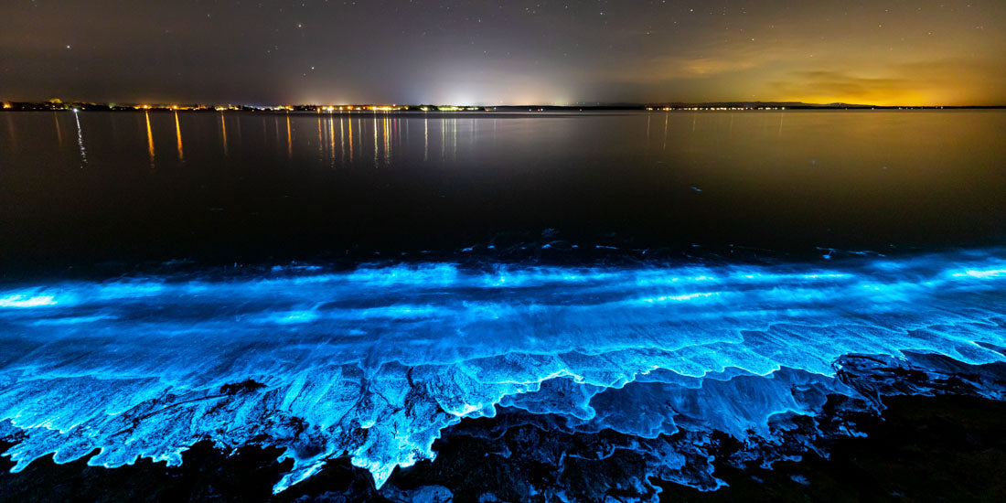 Bioluminescent algae lighting up the shoreline a bight blue in Jervis Bay.