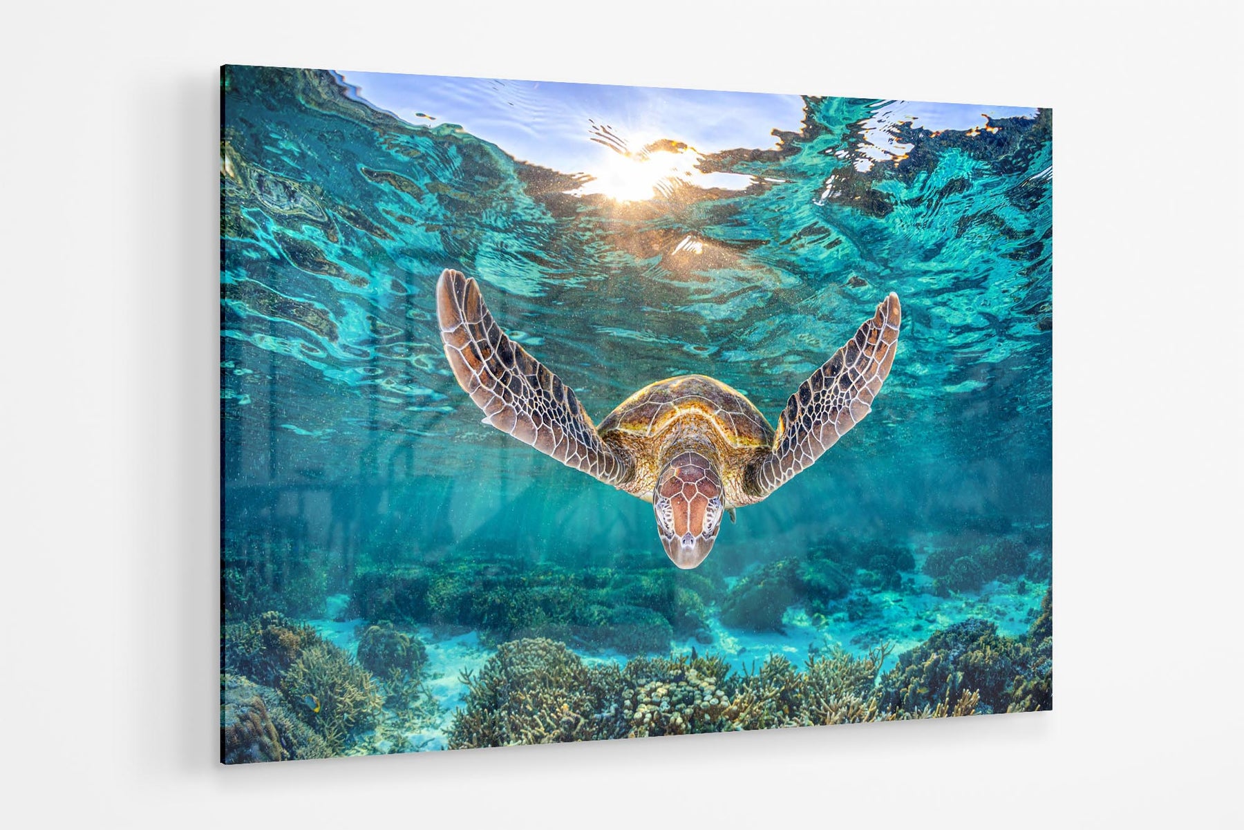 This captivating underwater photography print captures an endangered Green Sea Turtle gliding gracefully through the crystal-clear waters of Lady Elliot Island’s lagoon, part of the UNESCO World Heritage-listed Southern Great Barrier Reef. Bathed in the golden hues of afternoon sunlight, the image showcases the turtle’s serene beauty and the vibrant marine ecosystem of one of Australia’s most iconic snorkelling destinations.