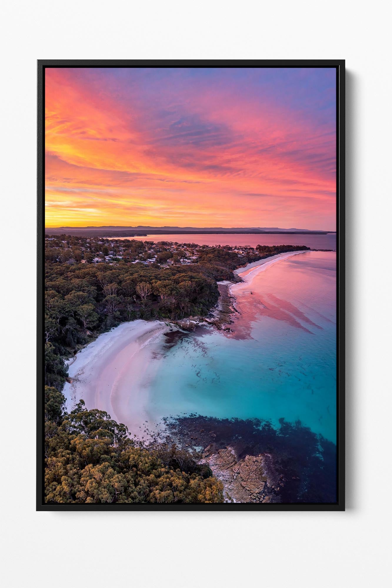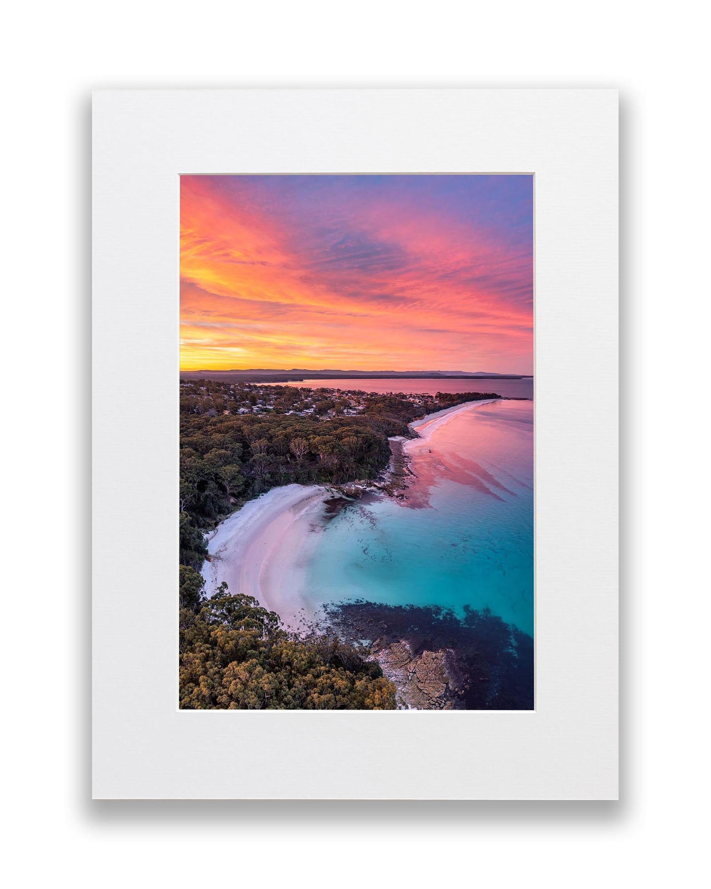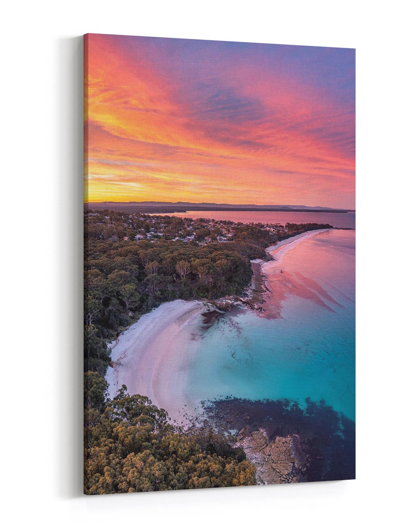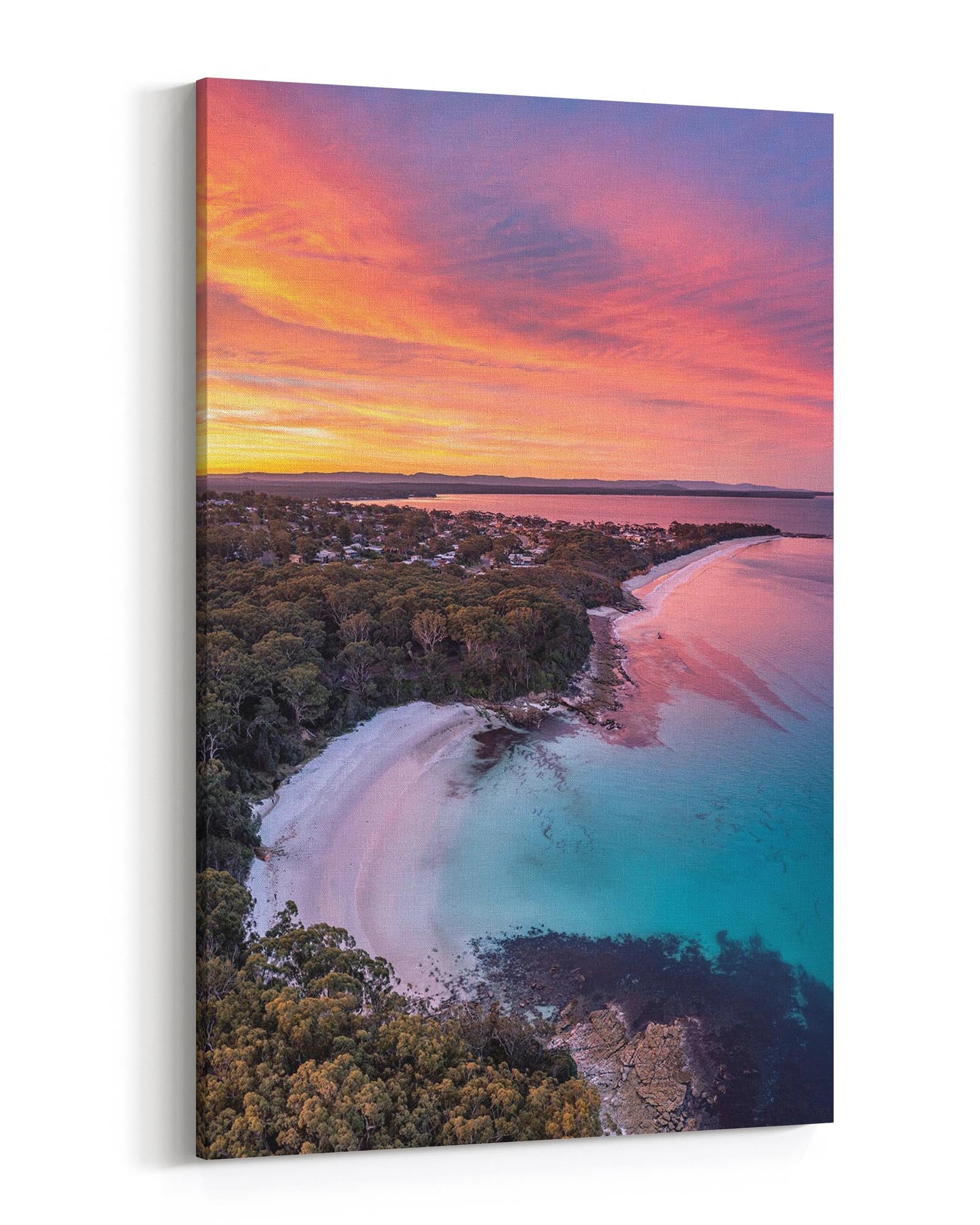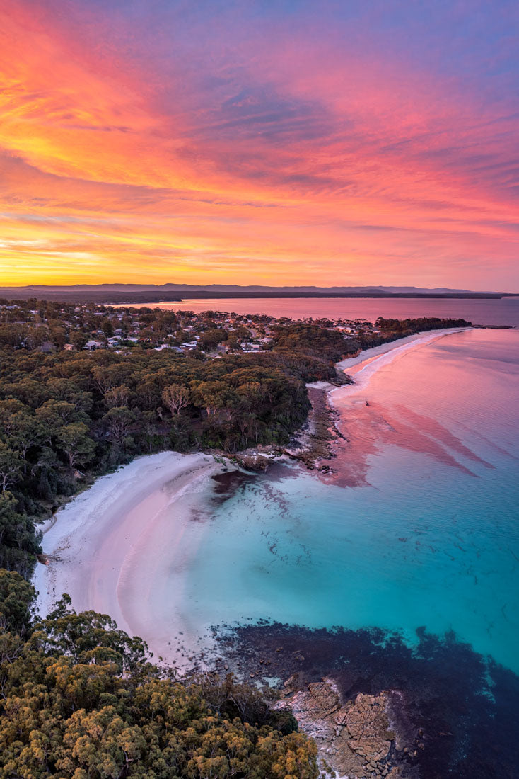 A birds eye view of a vivid sunset over Blenheim Beach, Jervis Bay.