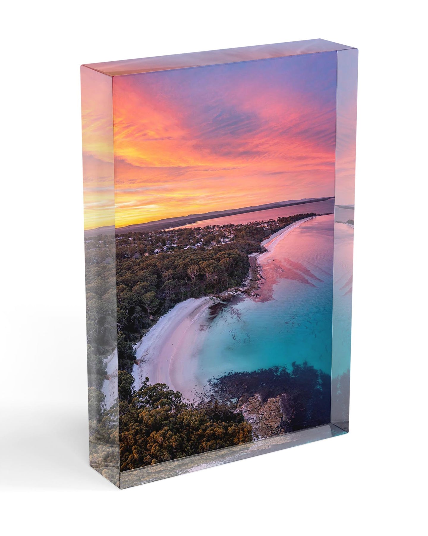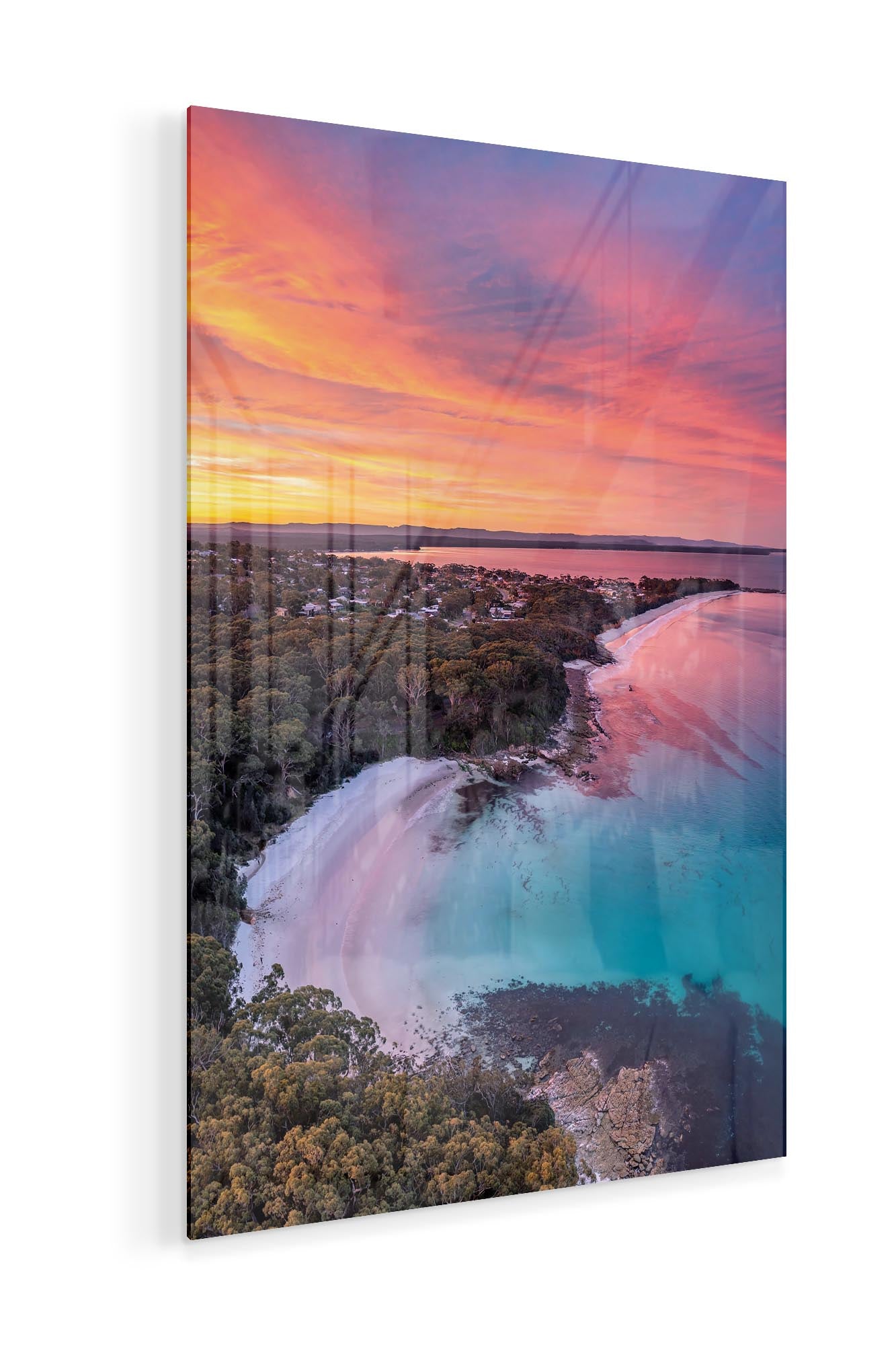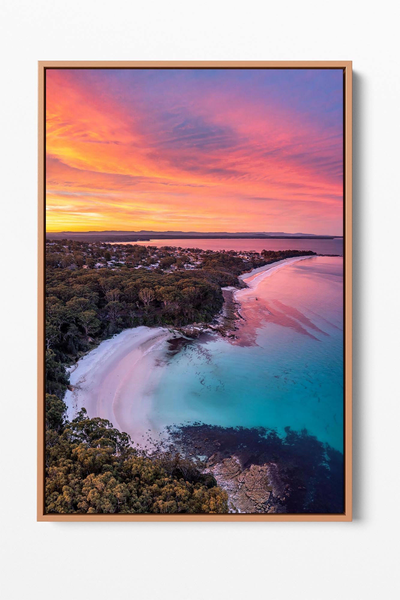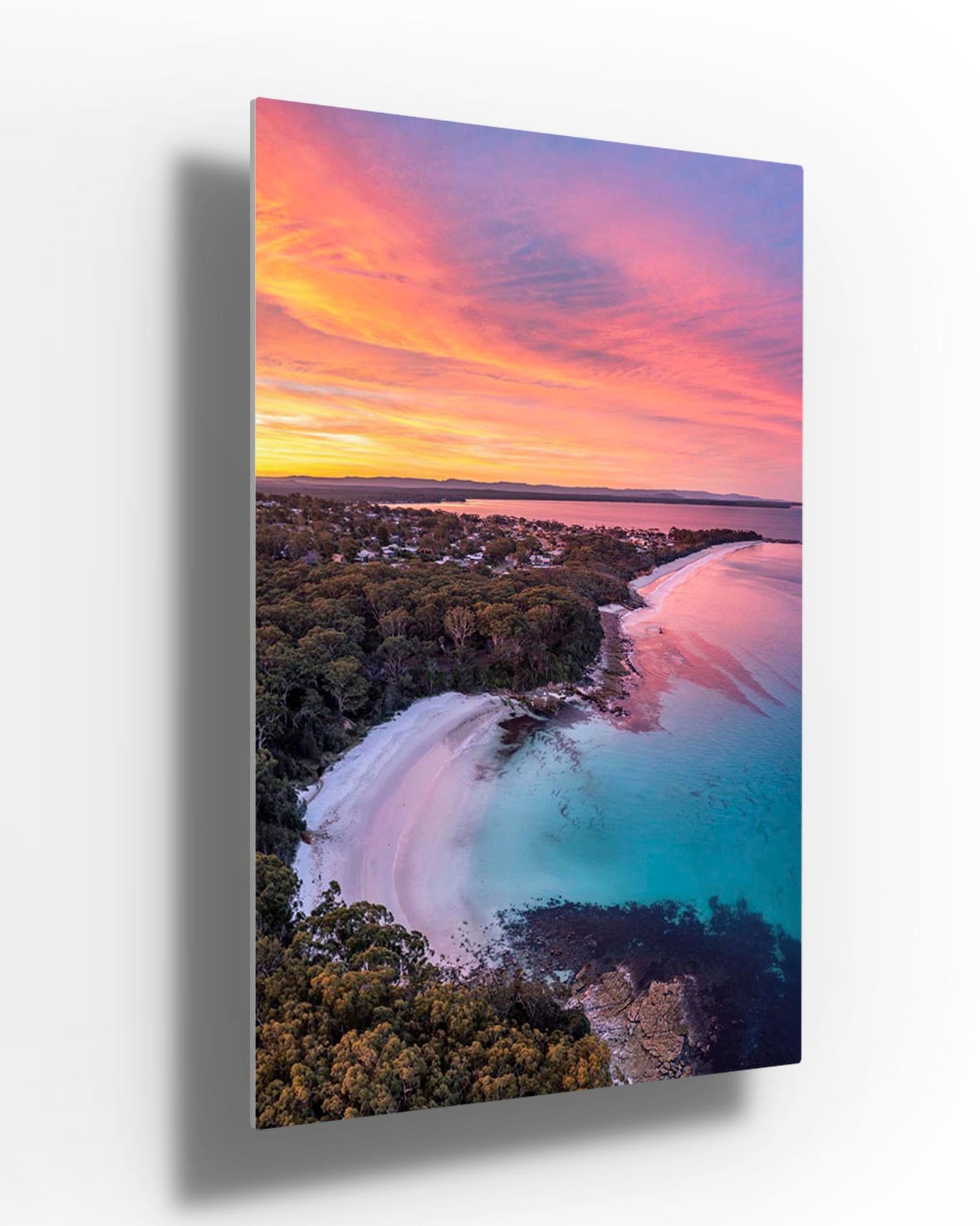 A birds eye view of a vivid sunset over Blenheim Beach, Jervis Bay.