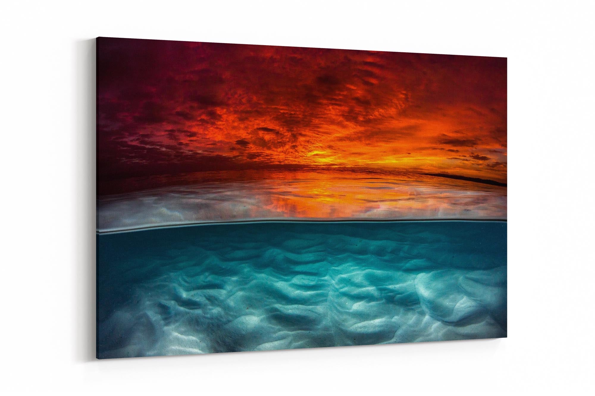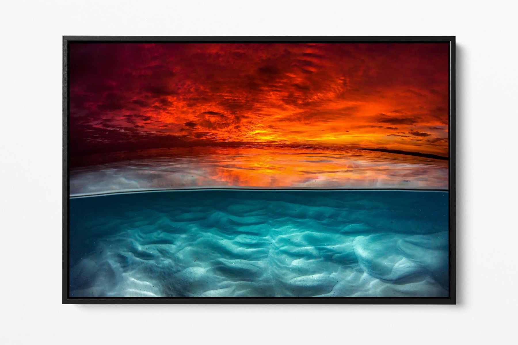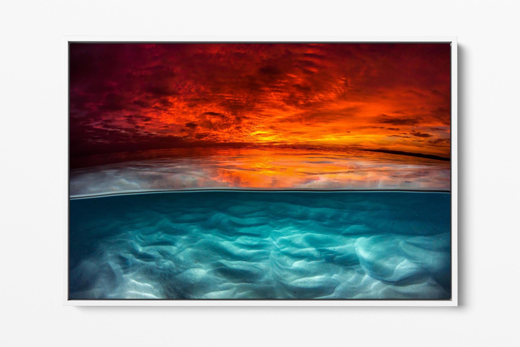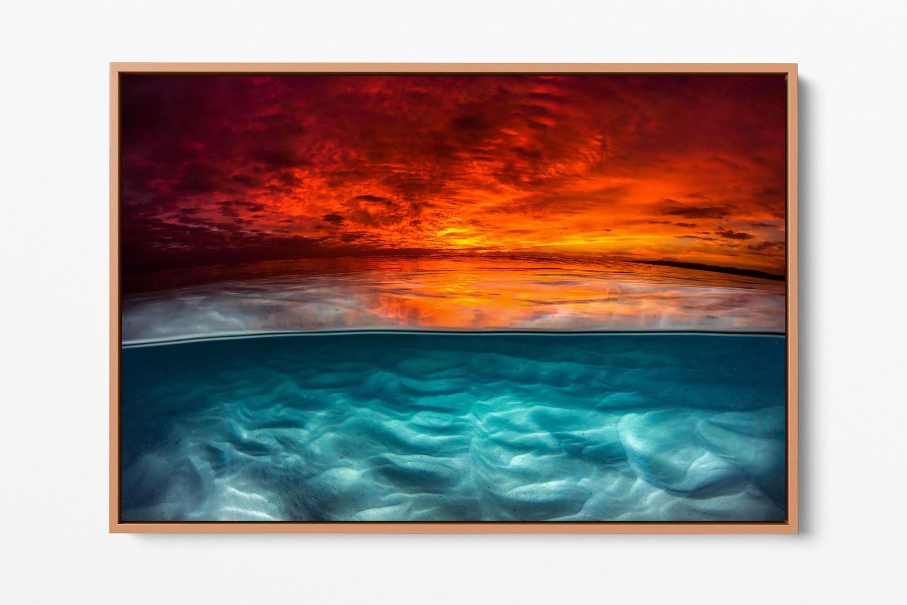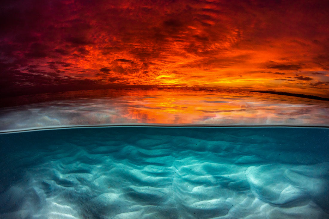 An over under photo of a vivid sunrise as seen from the water at Hyams Beach, Jervis Bay.