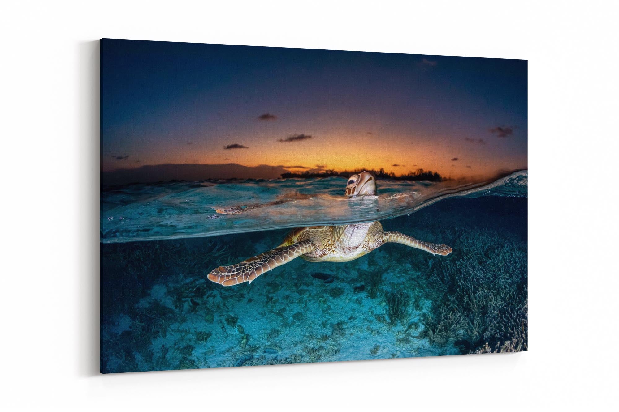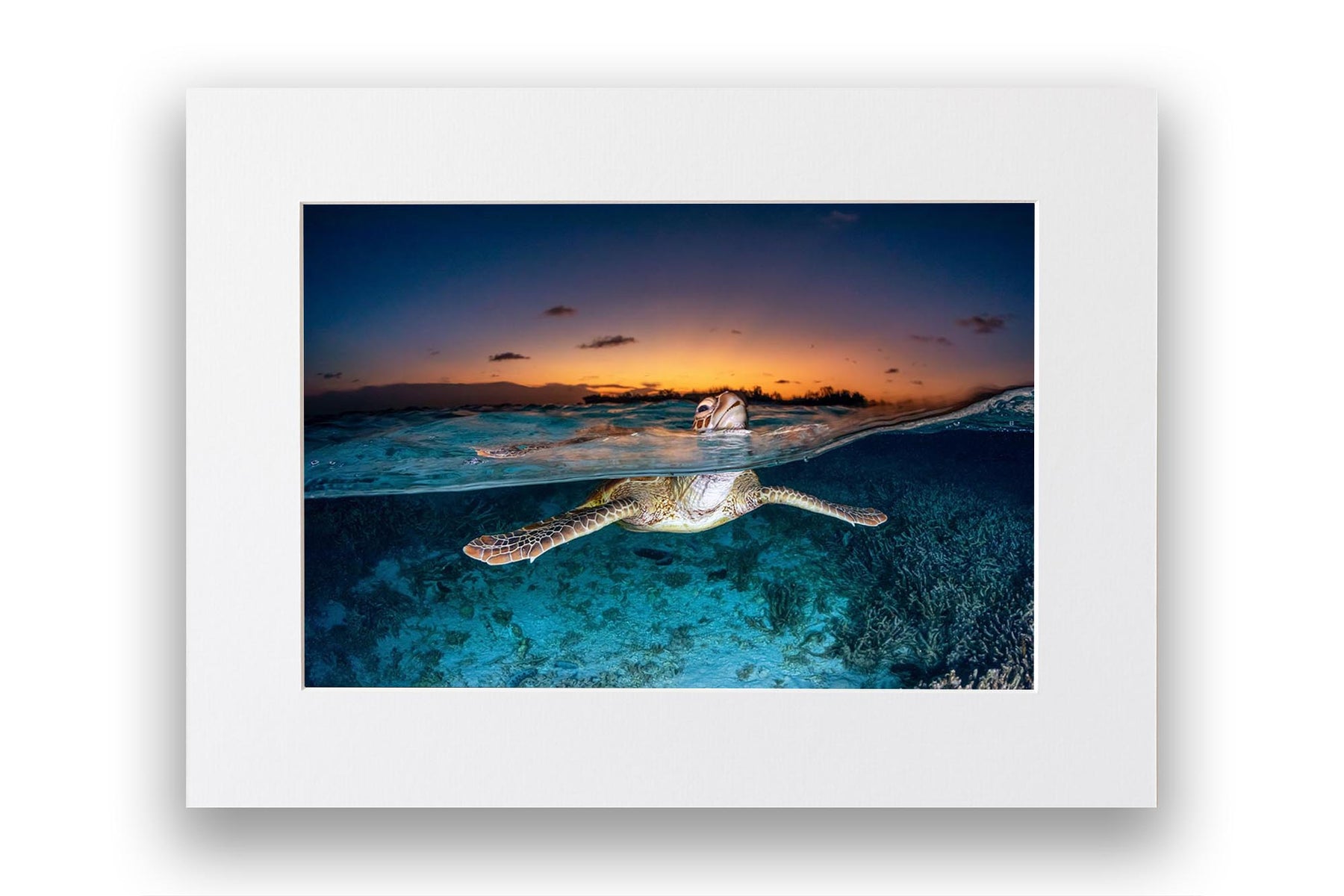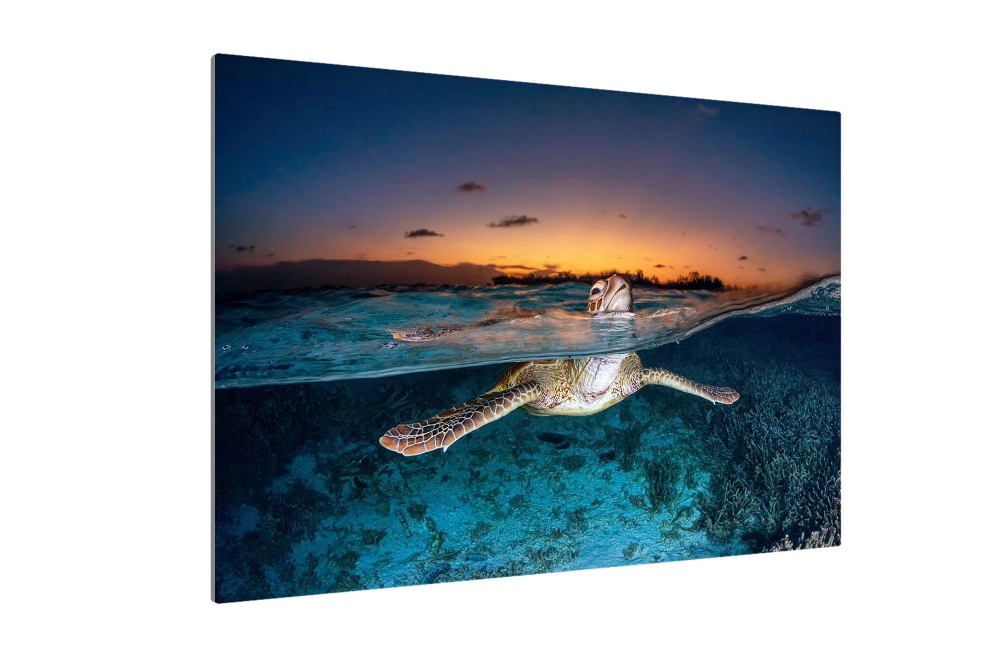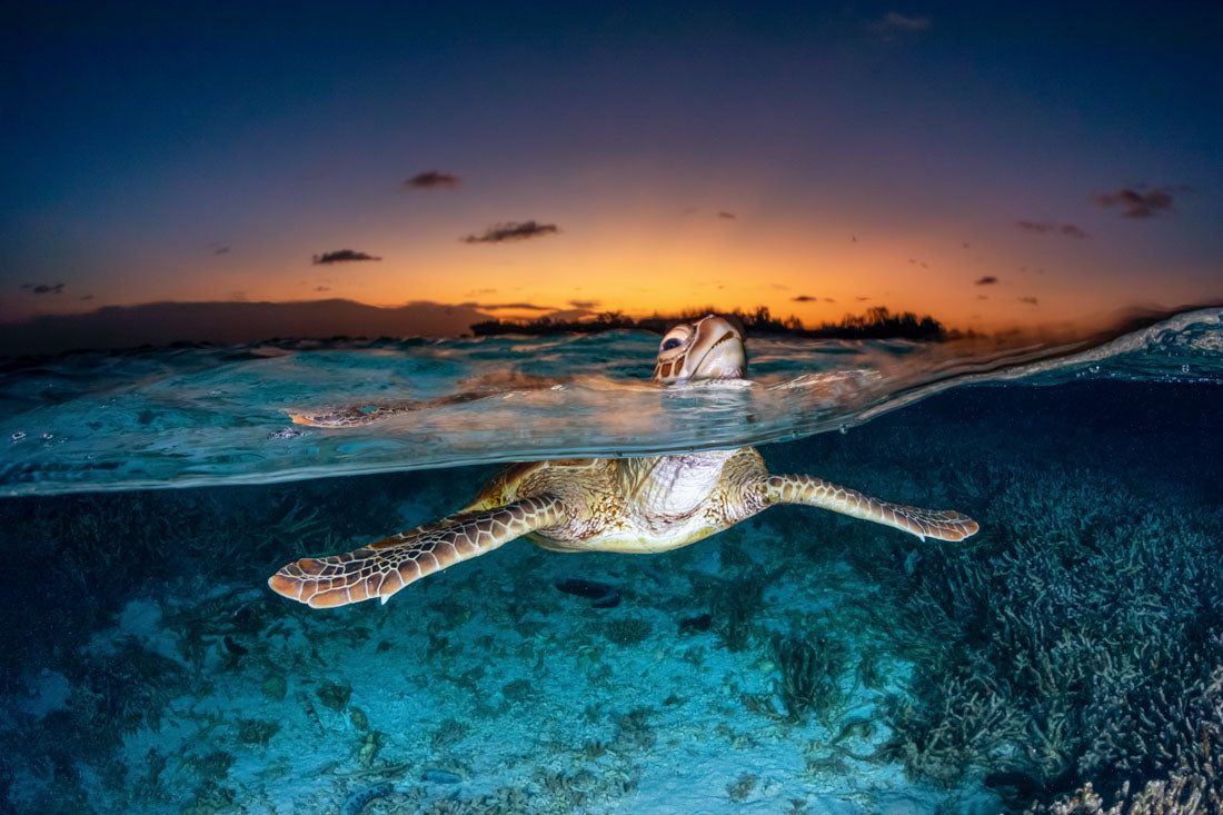Green Sea Turtle (Chelonia mydas) Sunset Split Shot Print – Lady Elliot Island, Southern Great Barrier Reef, Queensland