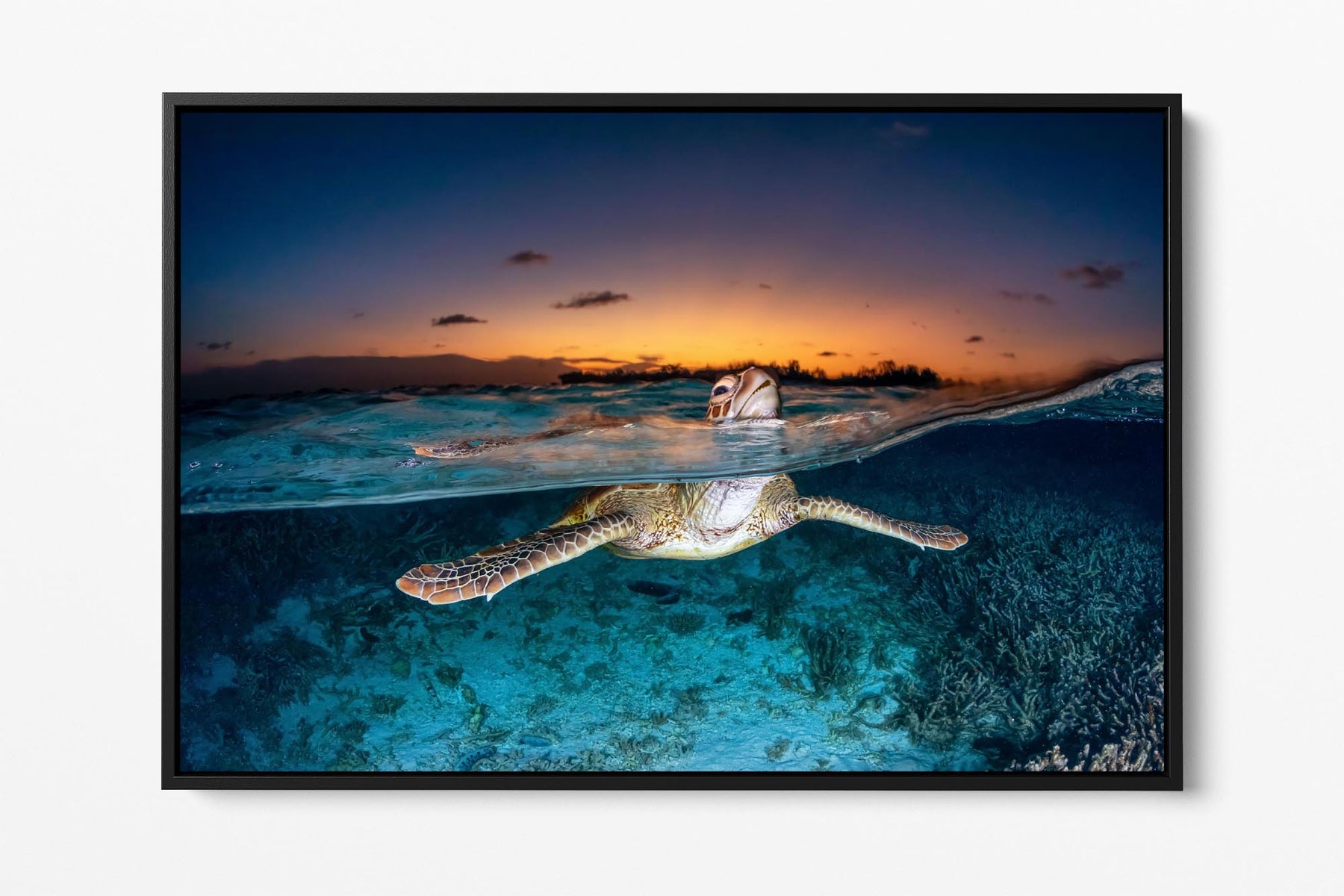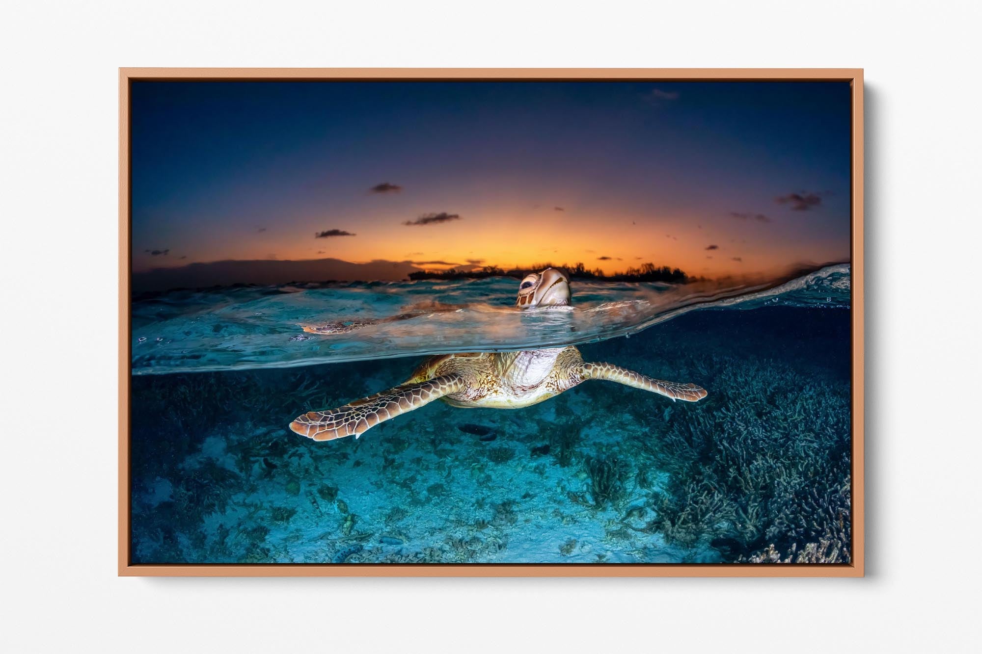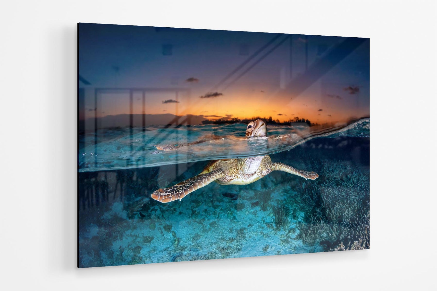 Green Sea Turtle (Chelonia mydas) Sunset Split Shot Print – Lady Elliot Island, Southern Great Barrier Reef, Queensland