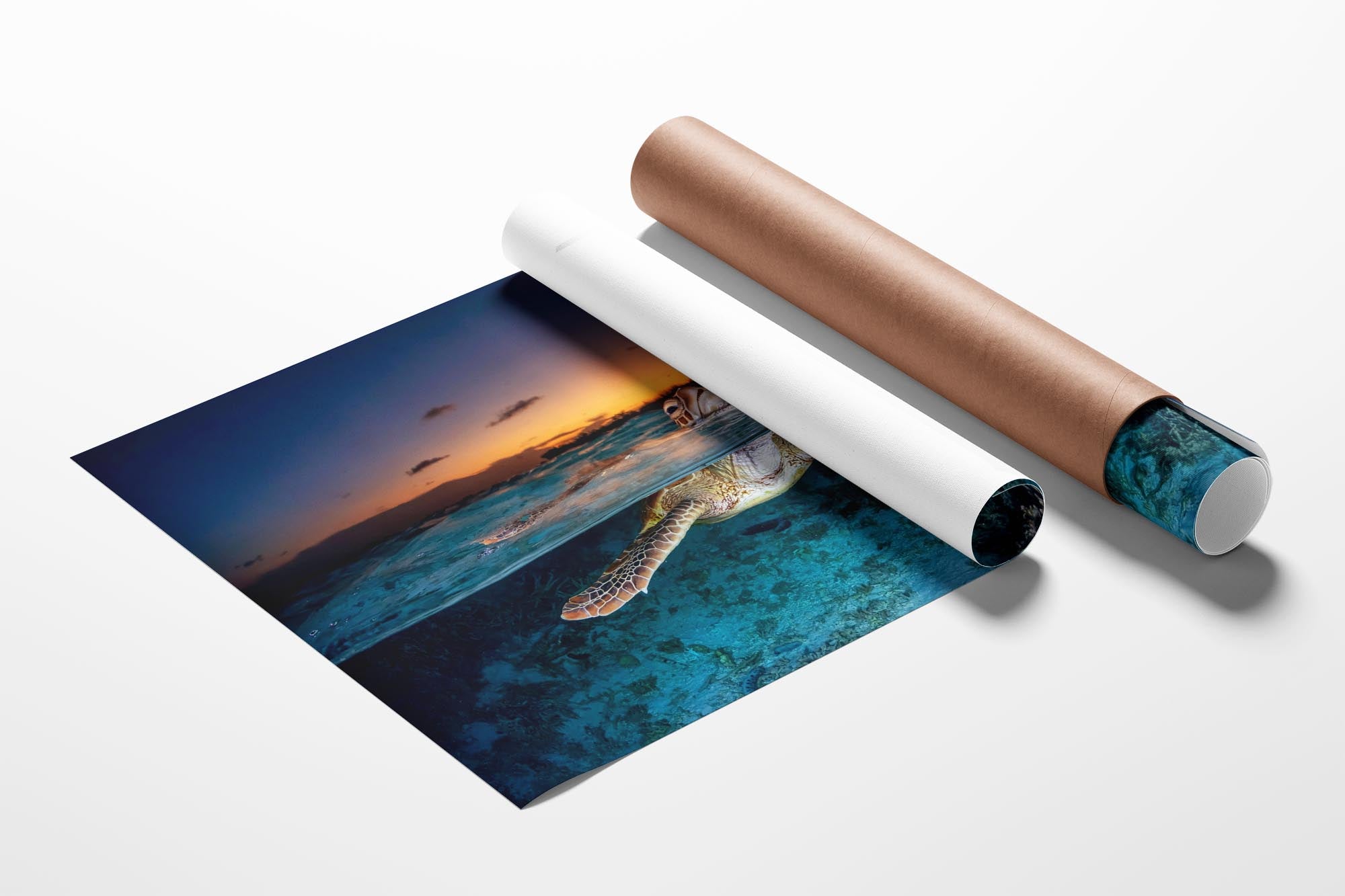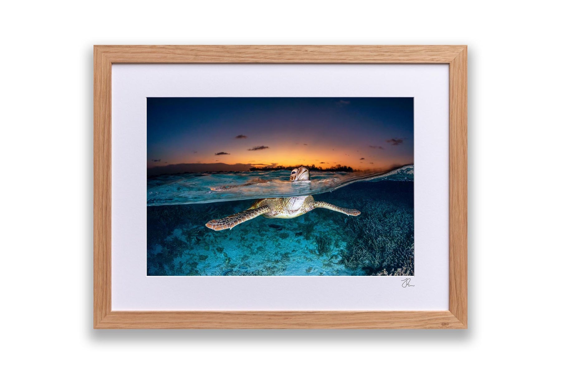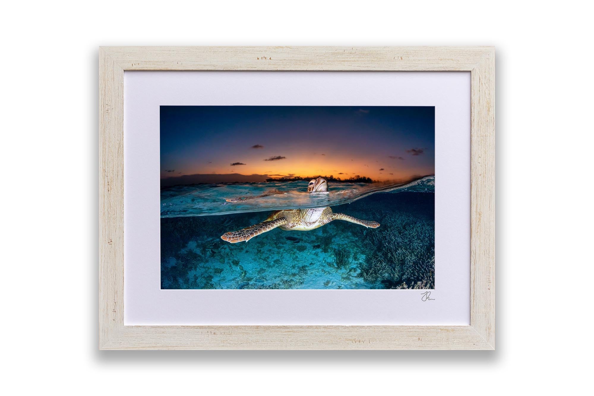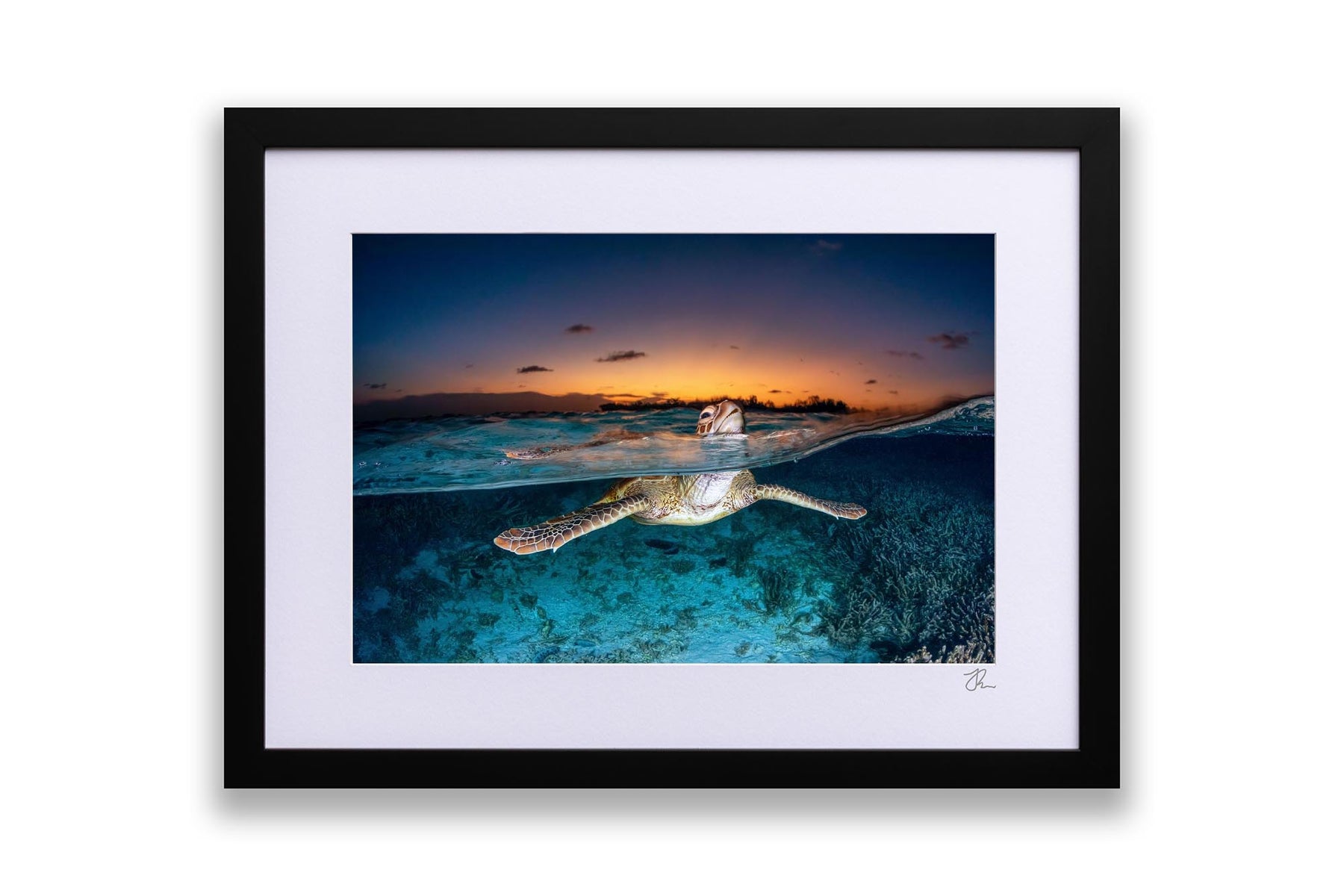 Green Sea Turtle (Chelonia mydas) Sunset Split Shot Print – Lady Elliot Island, Southern Great Barrier Reef, Queensland