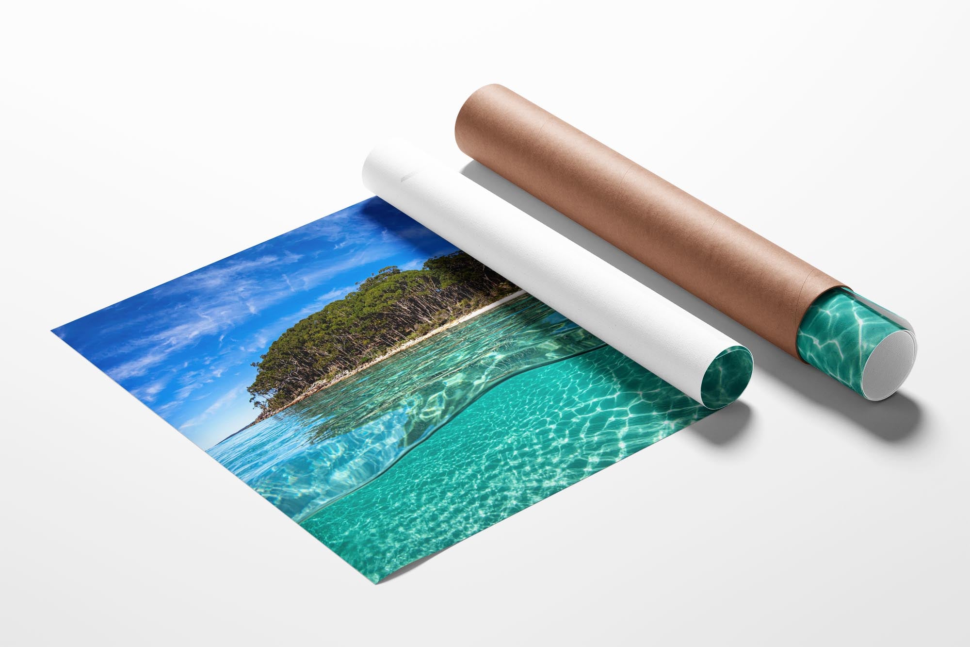 Discover the mesmerising beauty of Greenfield Beach with this stunning over-under photo print, showcasing the crystal-clear waters of Jervis Bay, where the pristine ocean meets the bright white sands and lush Australian bushland. Perfect for ocean lovers and art enthusiasts, this print captures the unique charm of Vincentia’s pristine coastline, making it a captivating addition to any home or office.