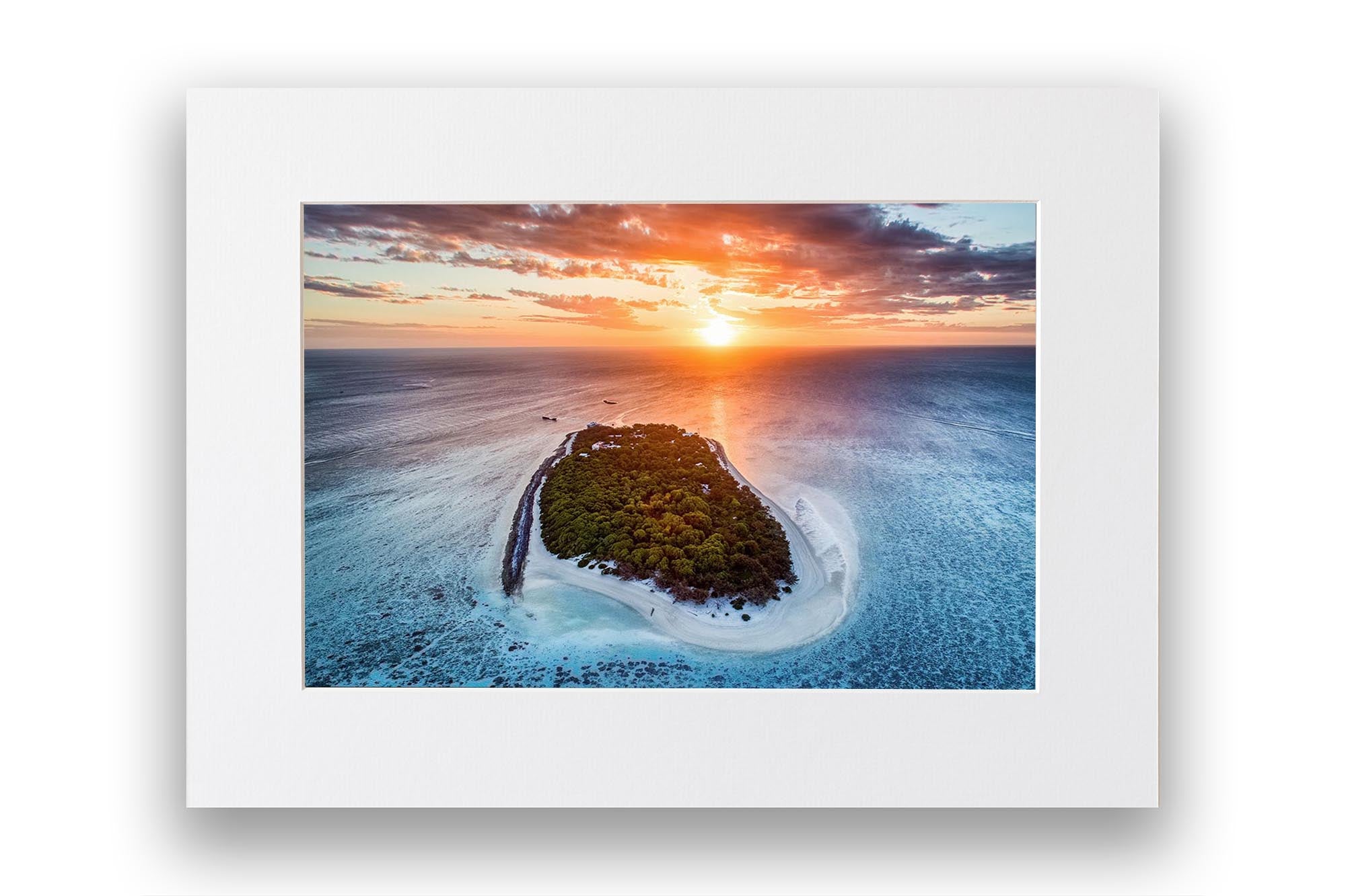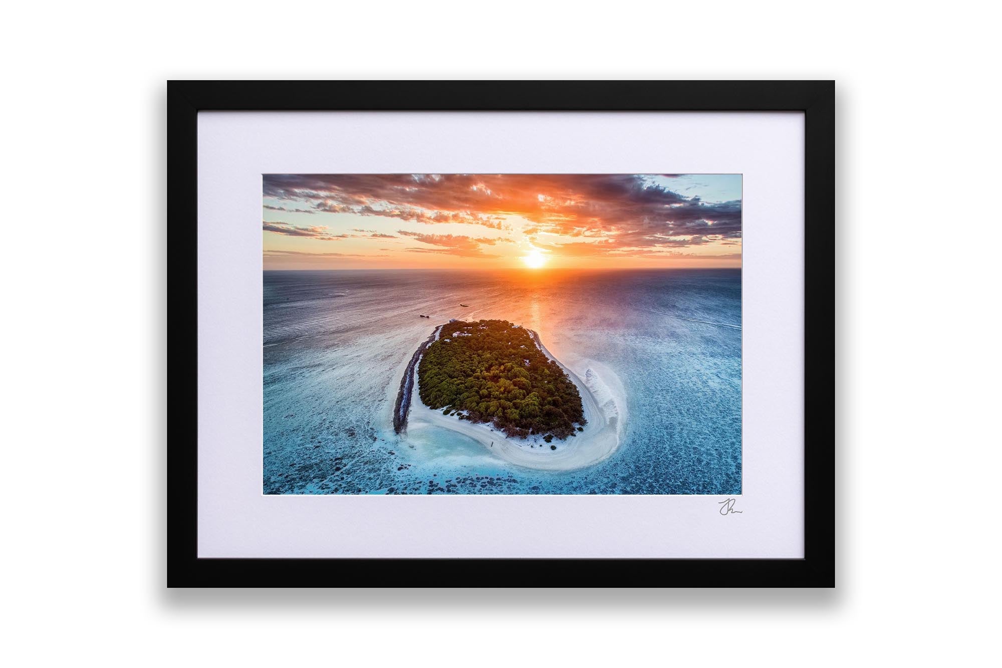 Immerse yourself in the untouched beauty of Heron Island, a pristine coral cay on Queensland’s Southern Great Barrier Reef, with this fine art photo print capturing a vivid sunset over its turquoise lagoon. As the sun dips below the horizon, fiery hues ignite the sky, casting a golden glow over the island’s coral reefs, sandy shores, and the Pacific Ocean’s endless expanse, a breathtaking tribute to one of Australia’s most ecologically rich marine sanctuaries.
