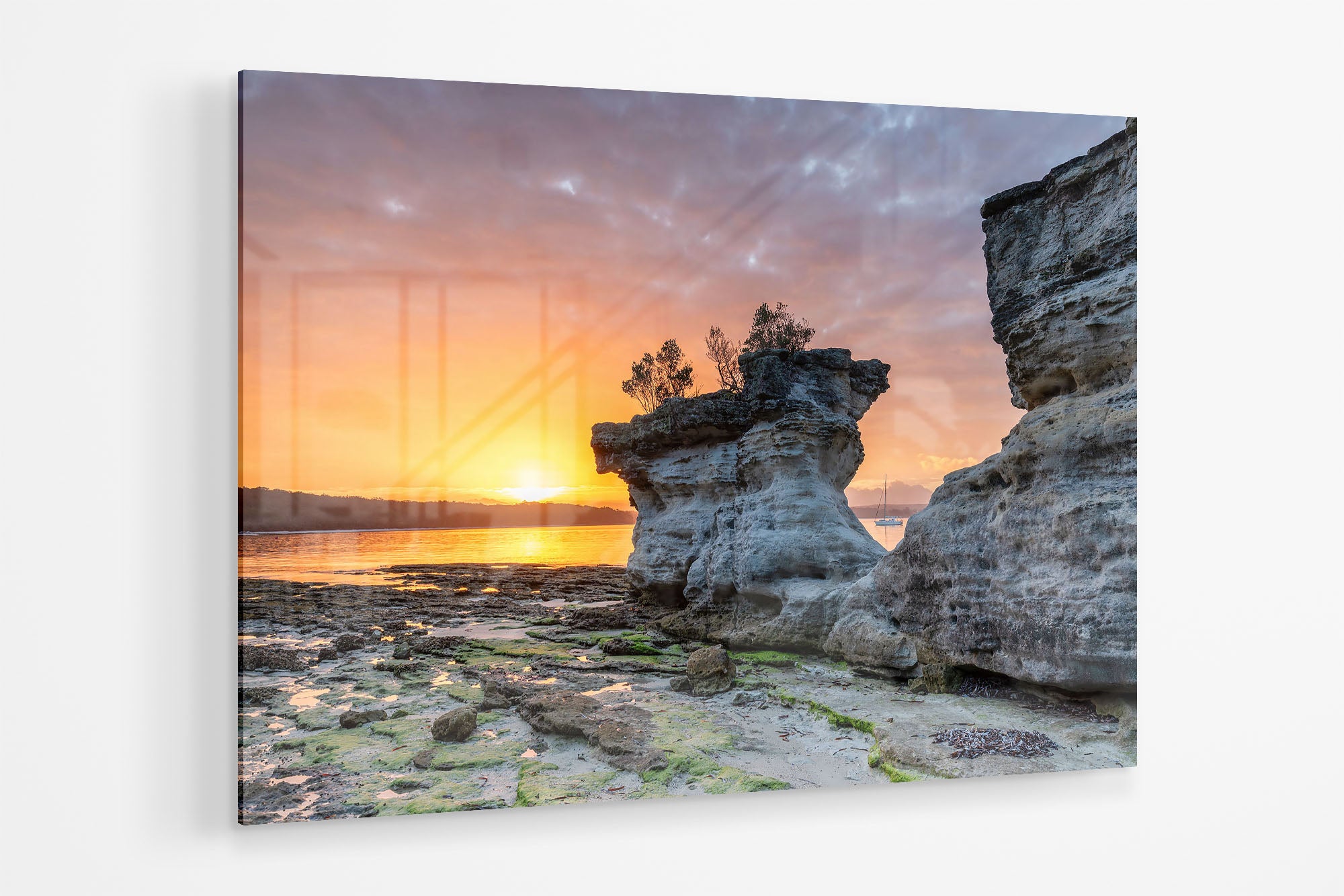 The metallic print is backed with white 2mm Dibond to add rigidity and uses a timber sub frame to float it from the wall. A timber wall mount bracket is provided with each acrylic panel. This timber bracket must first be fixed to the wall and then the acrylic panel will sit ontop of the bracket giving the acrylic panel a free floating off the wall apperance.
