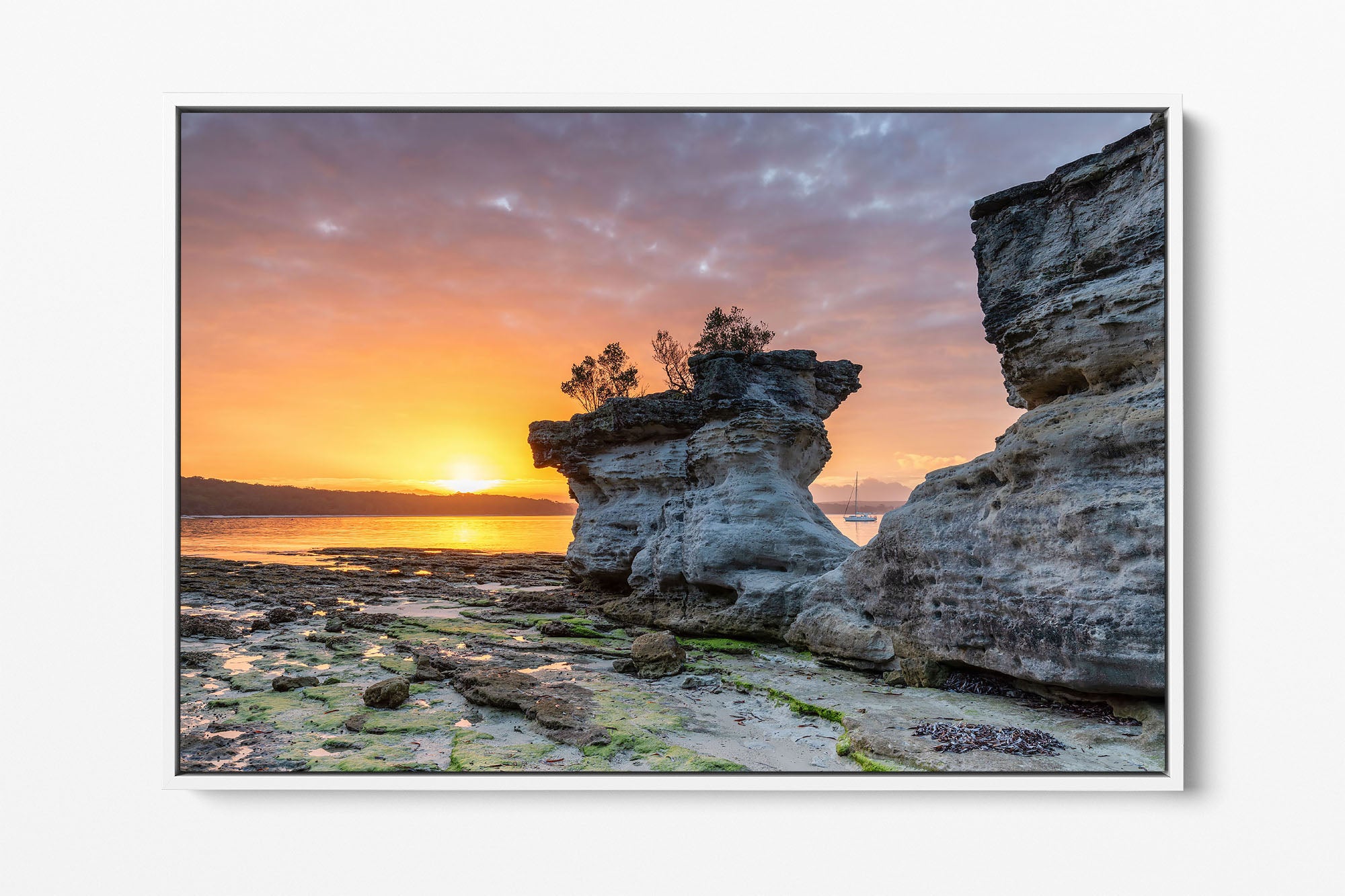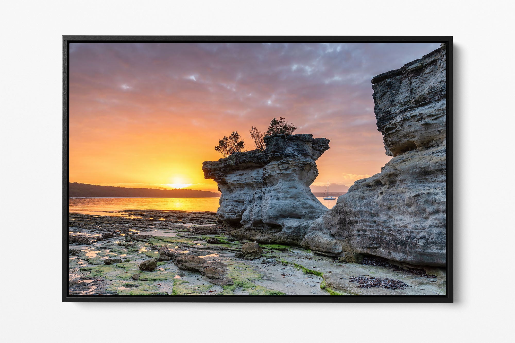The fine art canvas come stretched around an internal timber frame however there is the option to add a float frame to the exterior of the fine art canvas. Float frames are available in white, black and Tasmanian oak and are a great way to add more depth and contrast to our fine art canvas range.