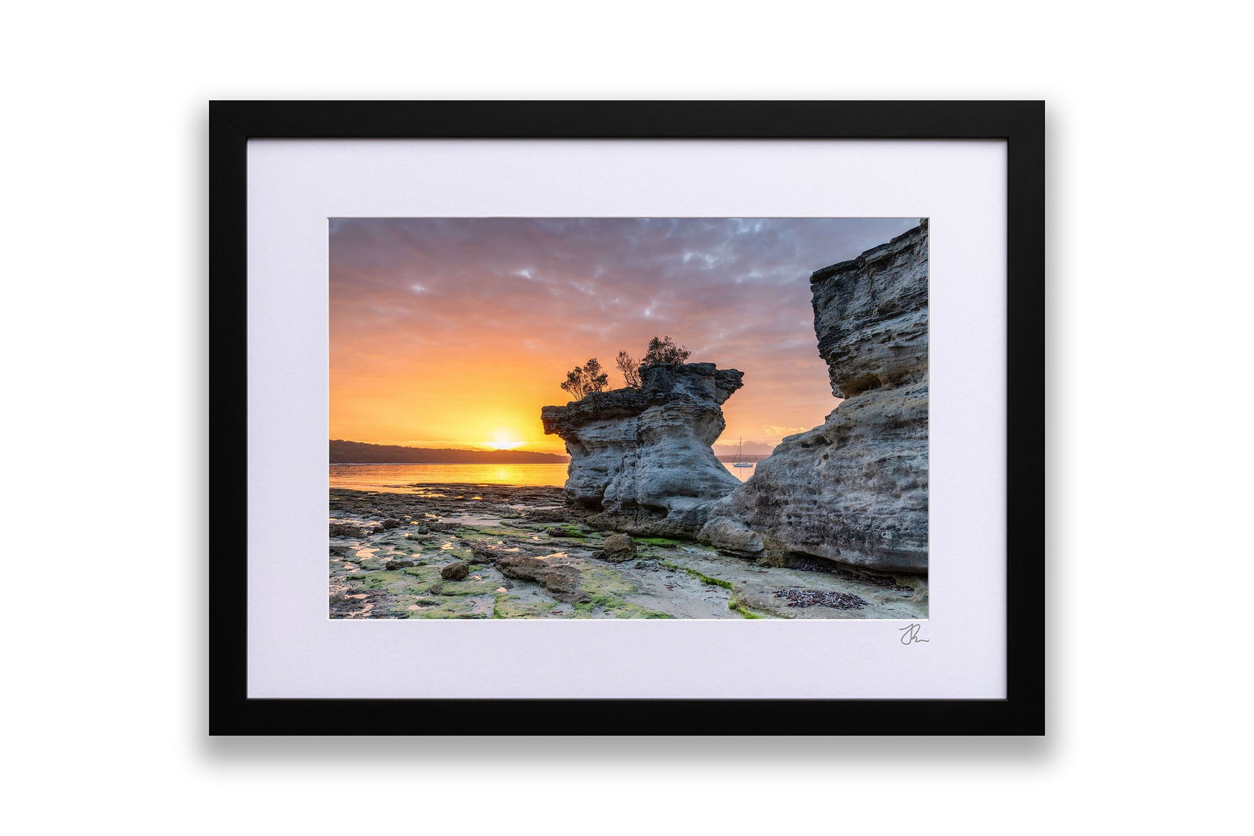 All of our framed prints come with a white mat board surrounding the print.