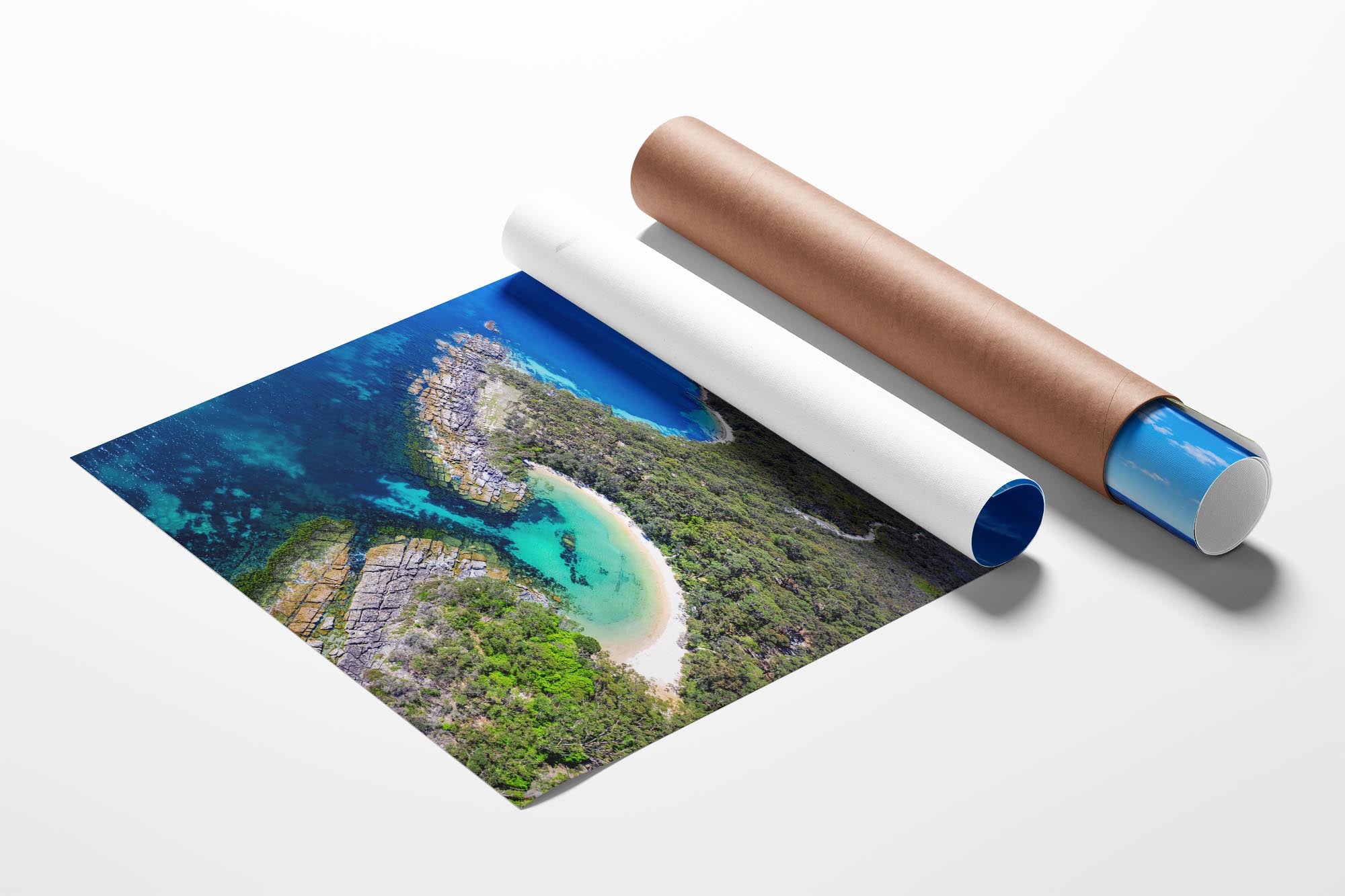 Discover the breathtaking beauty of Honeymoon Bay, Jervis Bay, with this stunning aerial view photo print. Nestled along the New South Wales South Coast, Honeymoon Bay is one of the region’s most picturesque beaches, renowned for its crystal-clear waters, white sand and lush surroundings. This breathtaking print captures the bay’s serene charm from above, showcasing its vibrant turquoise waters and idyllic coastline.