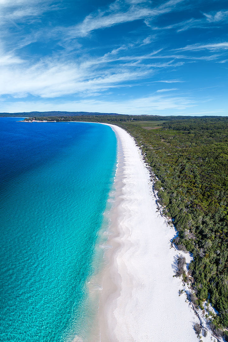 Soar above the world-famous shores of Hyams Beach in this breathtaking aerial photograph, showcasing its dazzling white sands meeting the crystal-clear turquoise waters of Jervis Bay. This stunning perspective reveals the perfect curves of one of Australia's most beautiful beaches along the NSW South Coast, where the vibrant ocean blends seamlessly with the pristine shoreline.