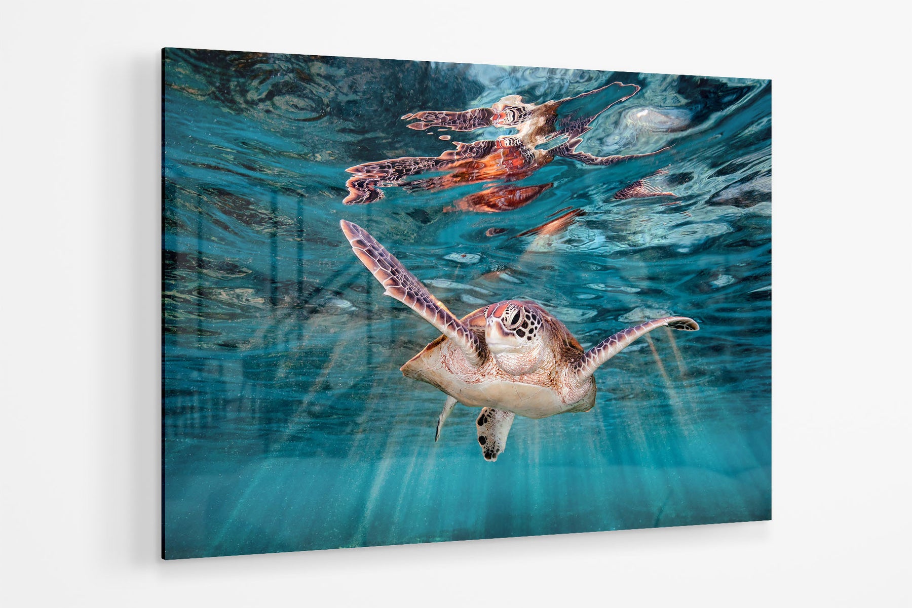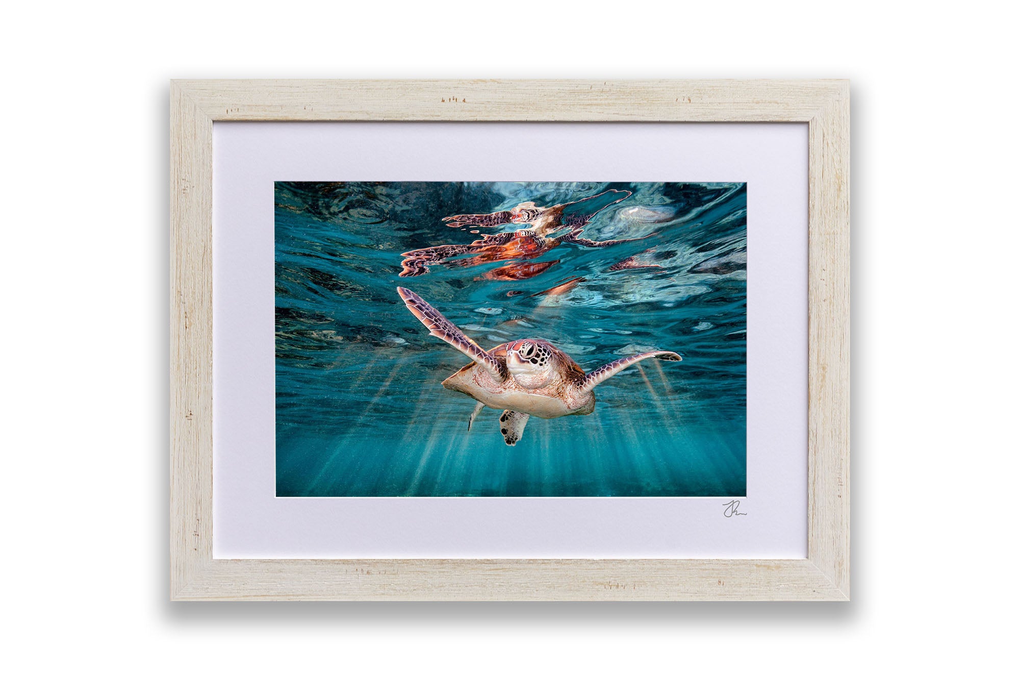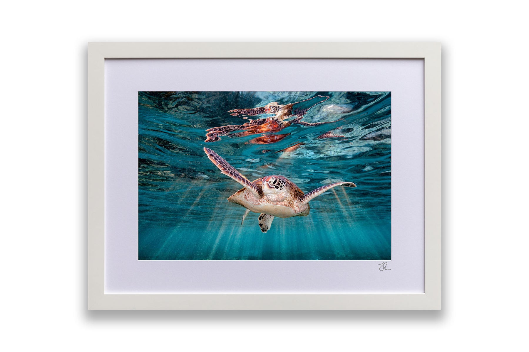 Witness the serene beauty of a Green Sea Turtle effortlessly gliding through sunlit waters in this breathtaking underwater photograph. Captured in the crystal-clear lagoon of Lady Elliot Island on Queensland's Southern Great Barrier Reef, the golden afternoon light transforms this marine encounter into a radiant display of nature's tranquility.