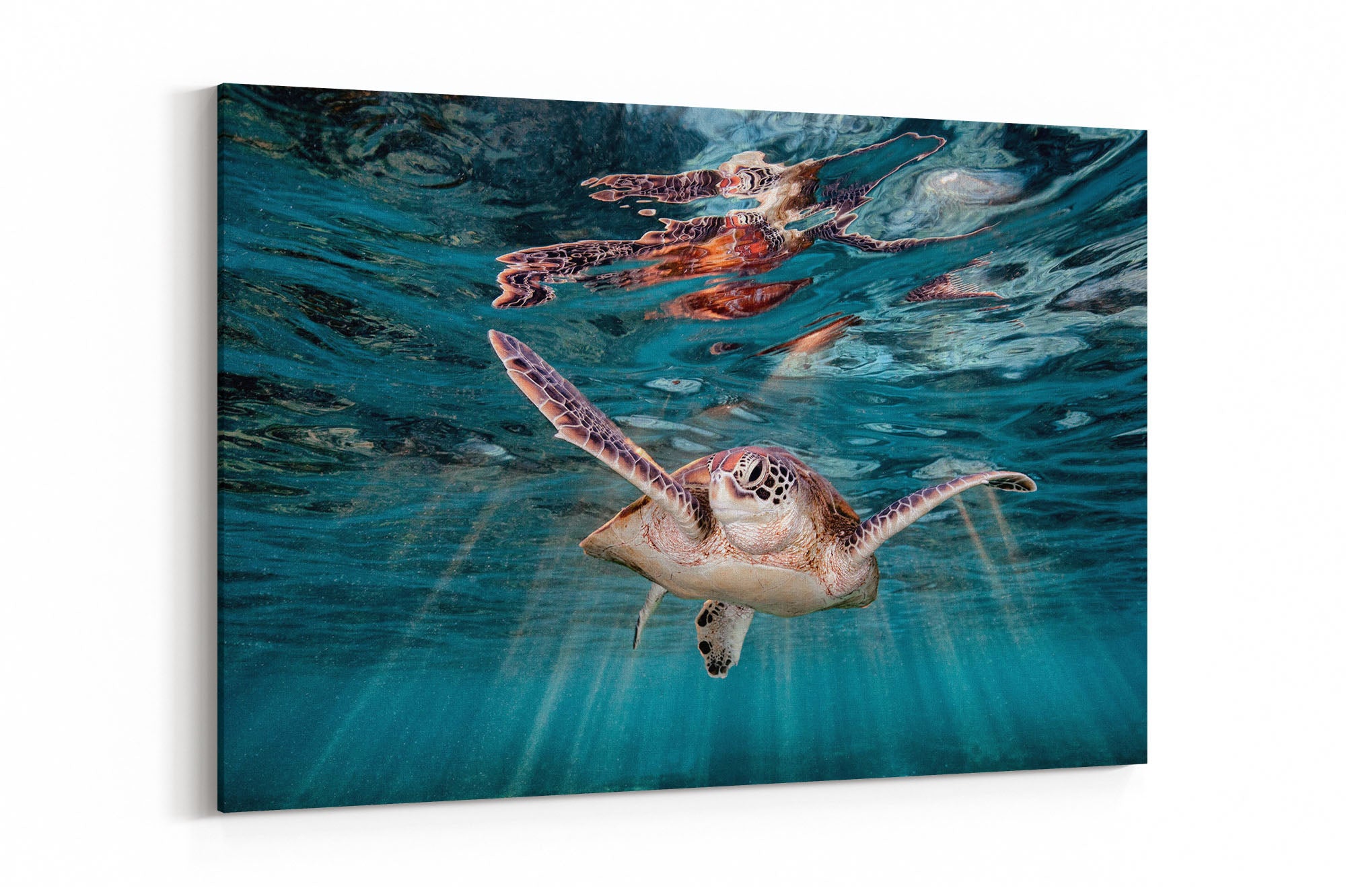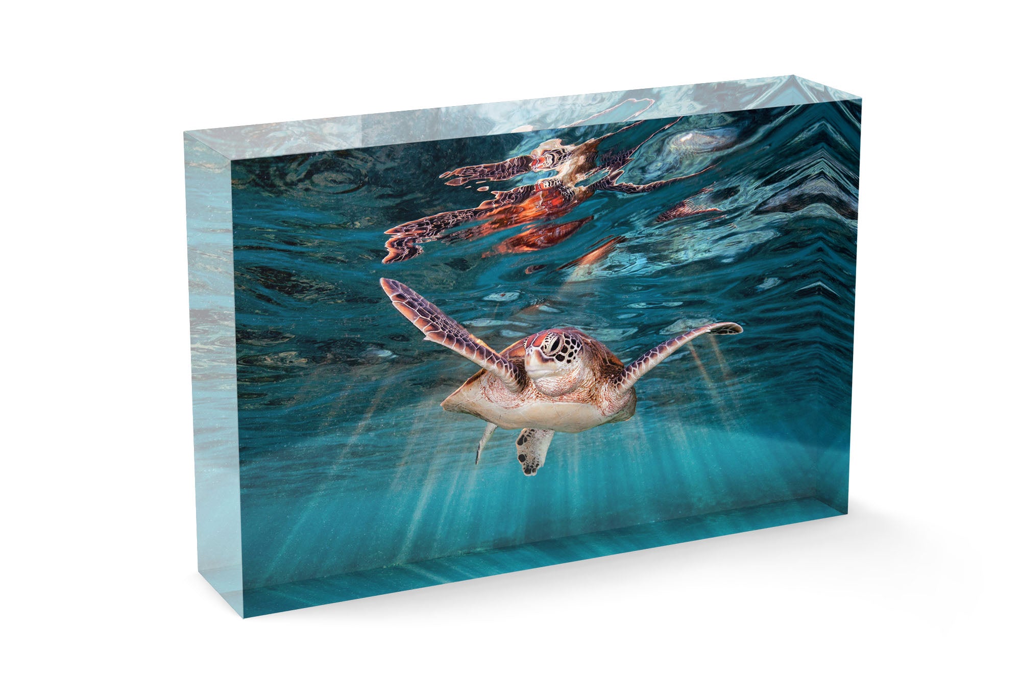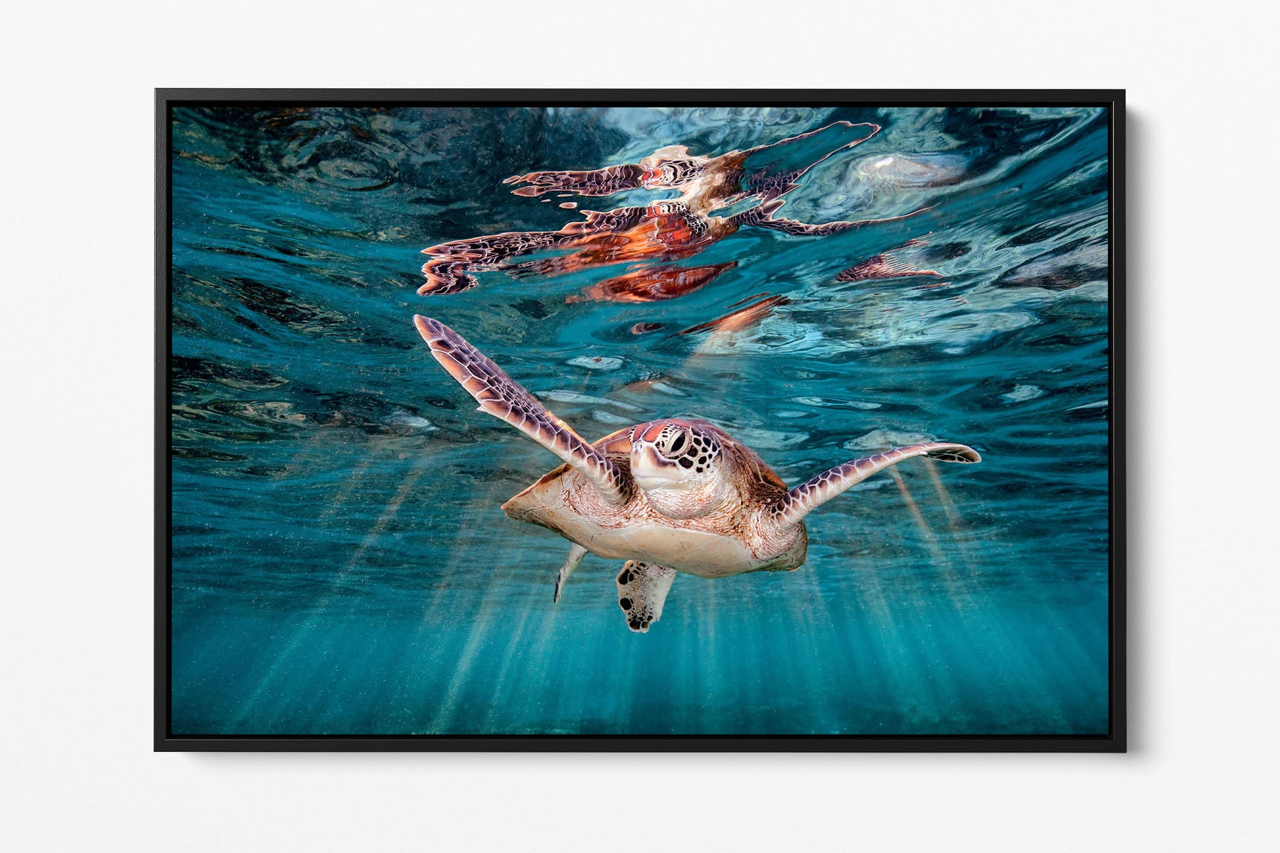 Witness the serene beauty of a Green Sea Turtle effortlessly gliding through sunlit waters in this breathtaking underwater photograph. Captured in the crystal-clear lagoon of Lady Elliot Island on Queensland's Southern Great Barrier Reef, the golden afternoon light transforms this marine encounter into a radiant display of nature's tranquility.