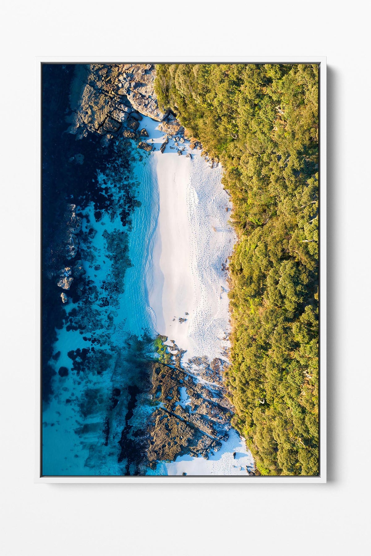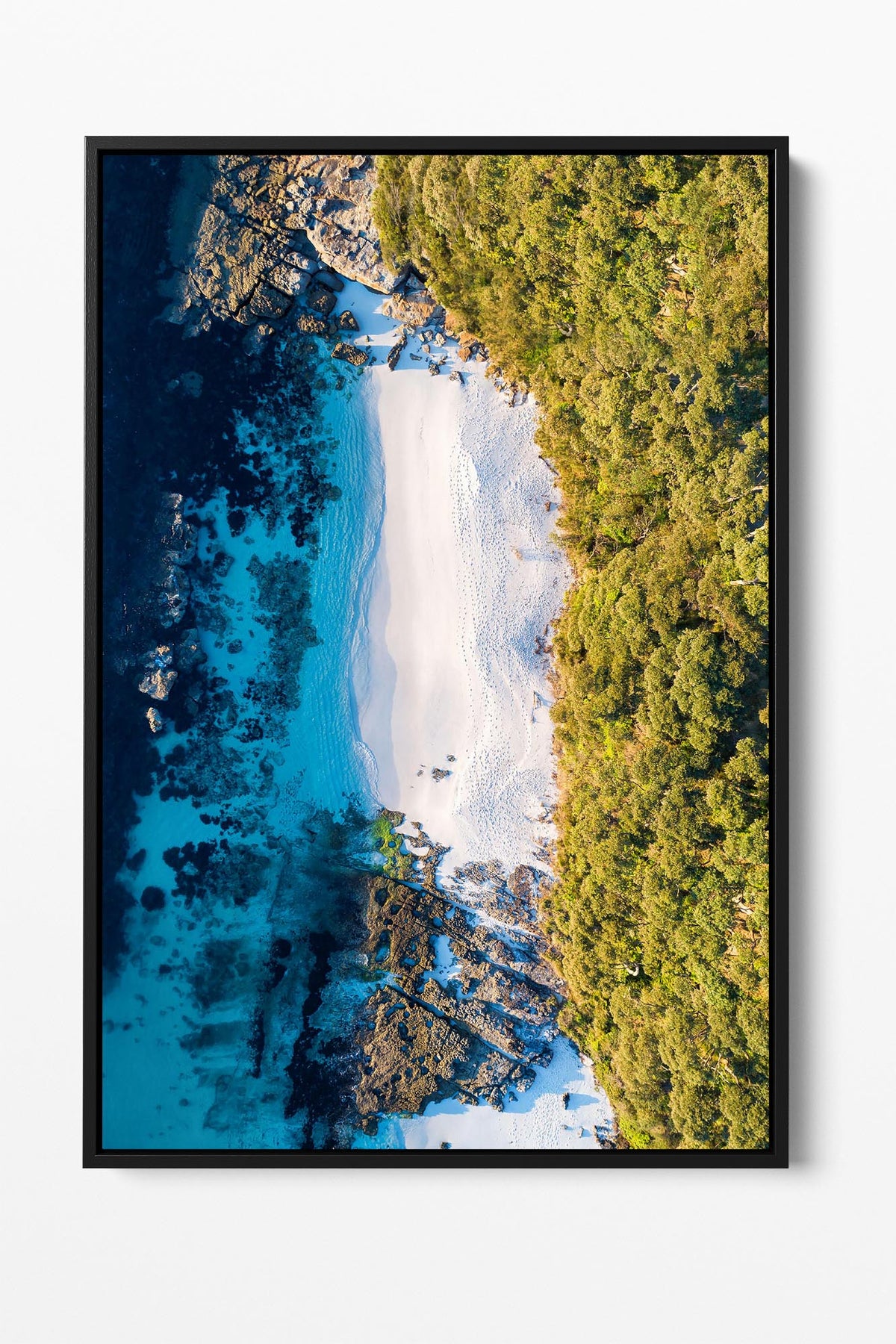 The fine art canvas come stretched around an internal timber frame however there is the option to add a float frame to the exterior of the fine art canvas. Float frames are available in white, black and Tasmanian oak and are a great way to add more depth and contrast to our fine art canvas range.