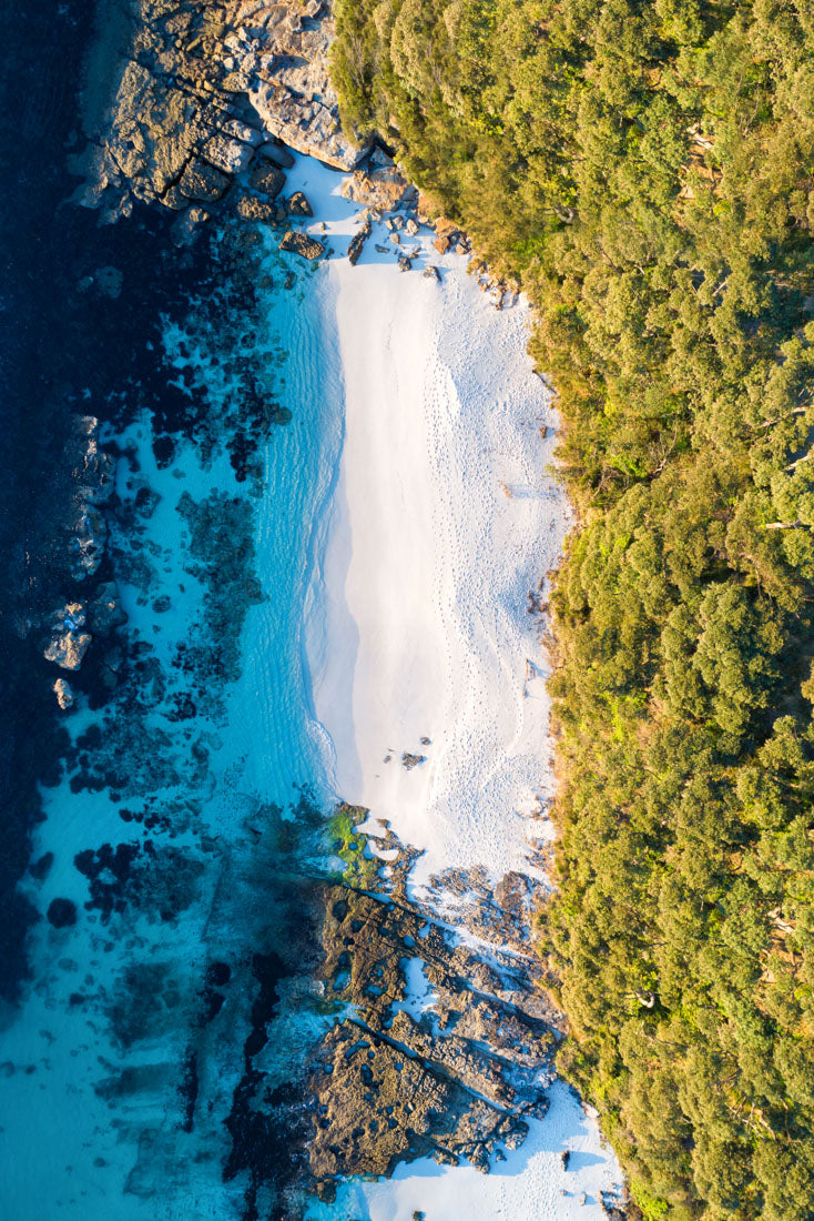 A birds eye view of little Hyams Beach where the bush meets bright white sand and crystal clear water.