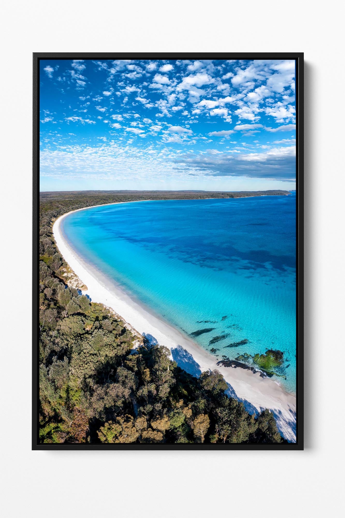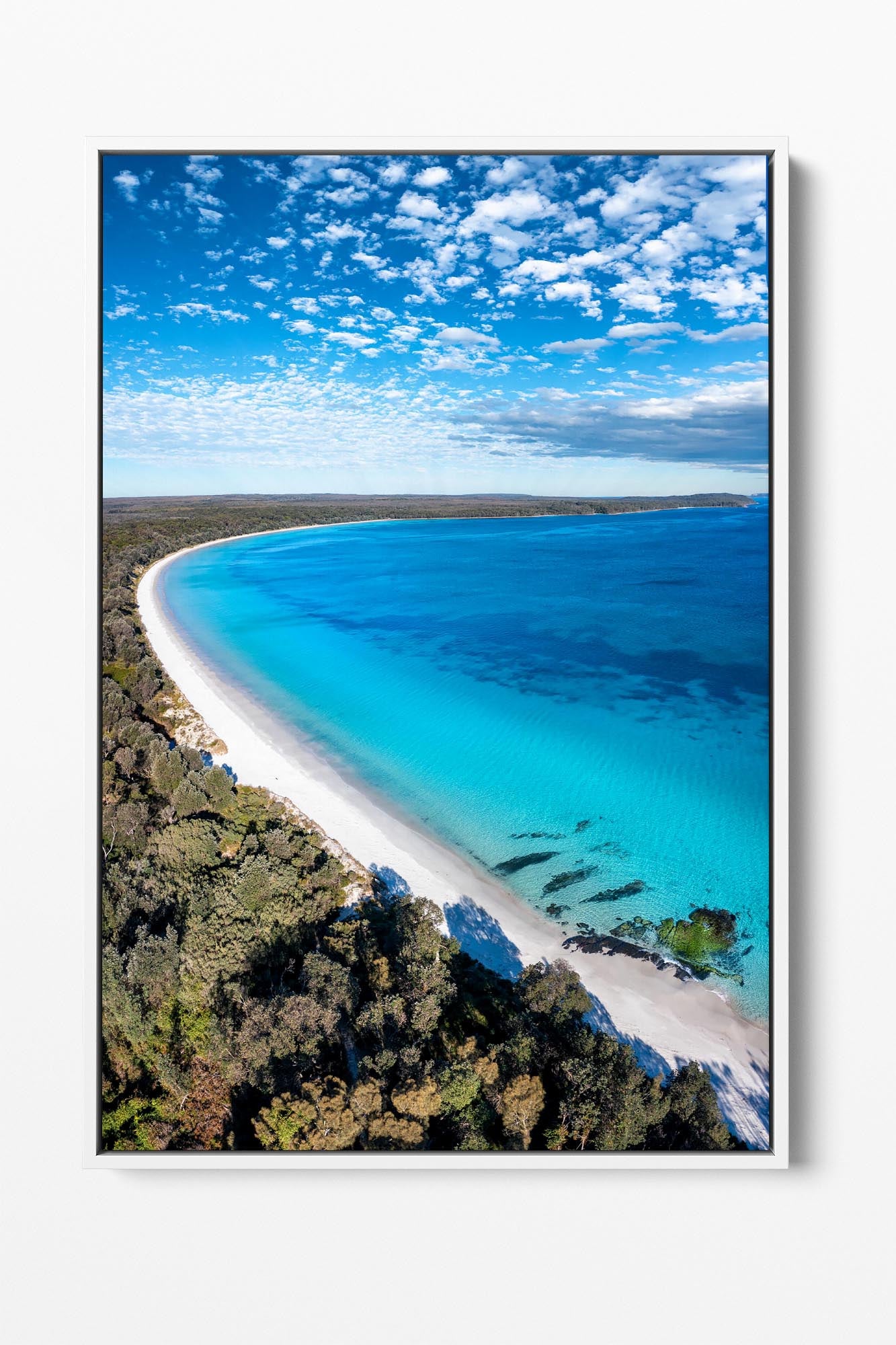The fine art canvas come stretched around an internal timber frame however there is the option to add a float frame to the exterior of the fine art canvas. Float frames are available in white, black and Tasmanian oak and are a great way to add more depth and contrast to our fine art canvas range.