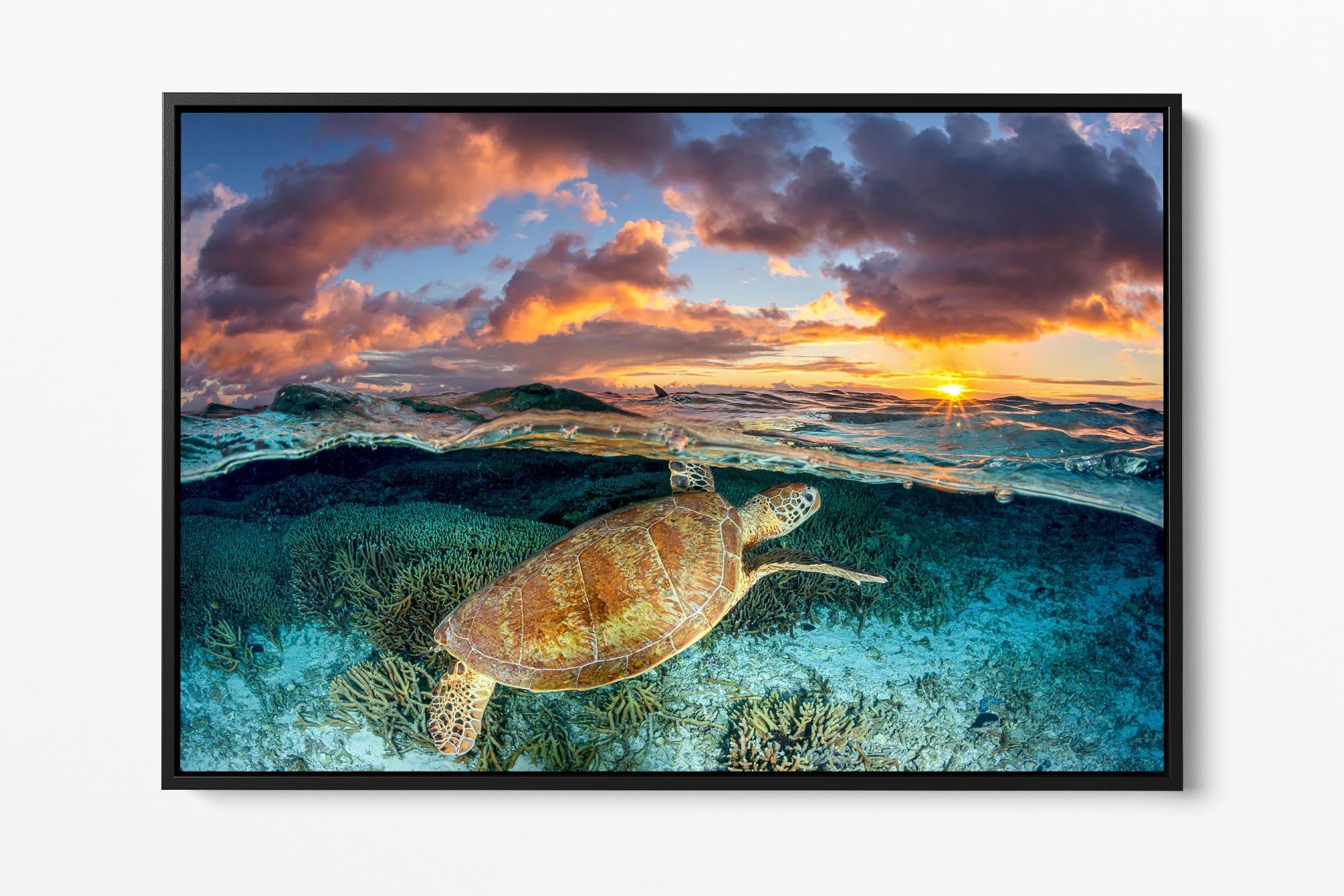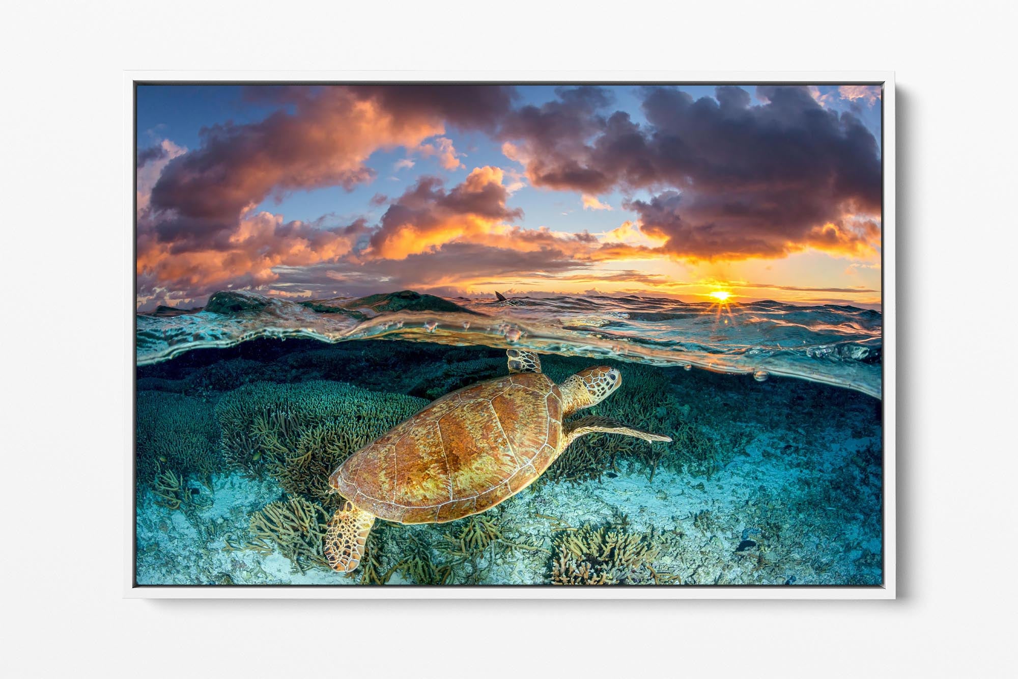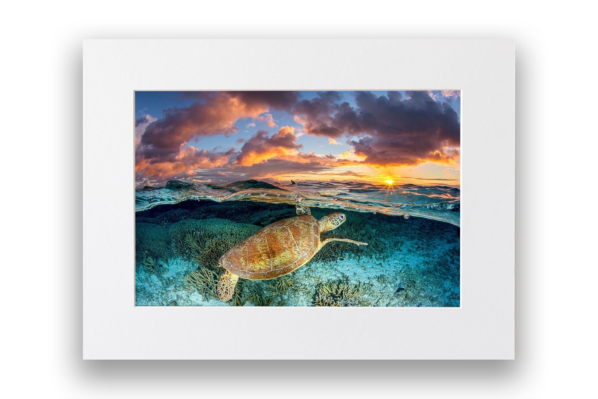 This breathtaking over-under / split shot photography print captures an endangered Green Sea Turtle gliding gracefully over vibrant Acropora coral gardens in the lagoon of Lady Elliot Island on the Southern Great Barrier Reef. The composition masterfully blends the golden hues of sunrise above the water with the crystal-clear turquoise depths below.
