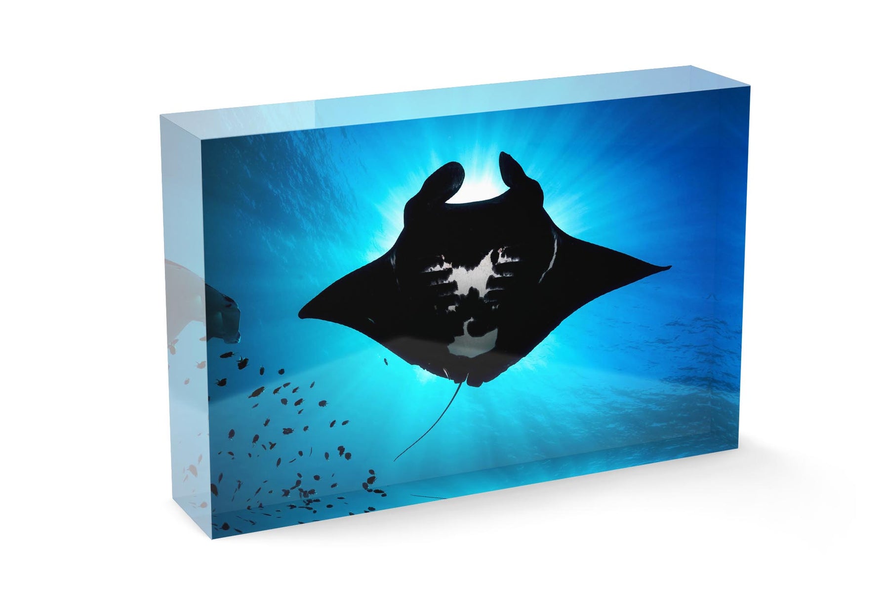 Witness the awe-inspiring beauty of a melanistic Manta Ray in this stunning photo print, capturing the ray eclipsing the sun as it gracefully glides over the reef at the iconic Lighthouse Bommies on Lady Elliot Island, located on the Southern Great Barrier Reef, Queensland. Known as the home of the Manta Ray, Lady Elliot Island is one of the best places in Australia to snorkel and dive with these majestic creatures.
