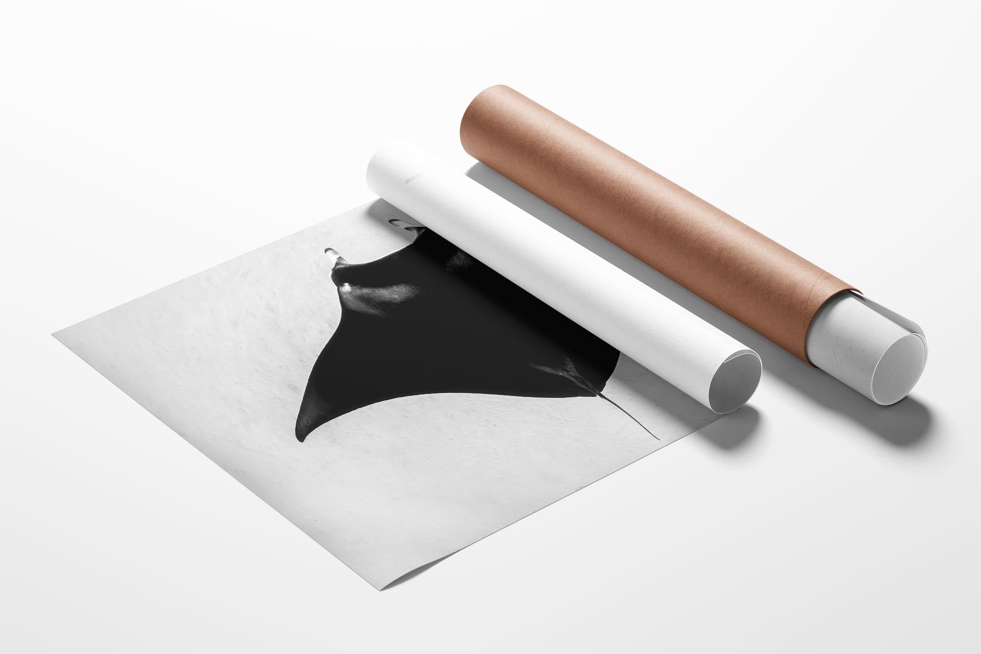 Witness the breathtaking grace of the ocean with this striking black and white underwater photography print, featuring a majestic Manta Ray gliding effortlessly over the sandy sea floor of Lady Elliot Island on the Great Barrier Reef. Expertly captured in timeless monochrome and printed on premium archival paper, this artwork transforms the raw beauty of marine life into a sophisticated statement piece for your space.