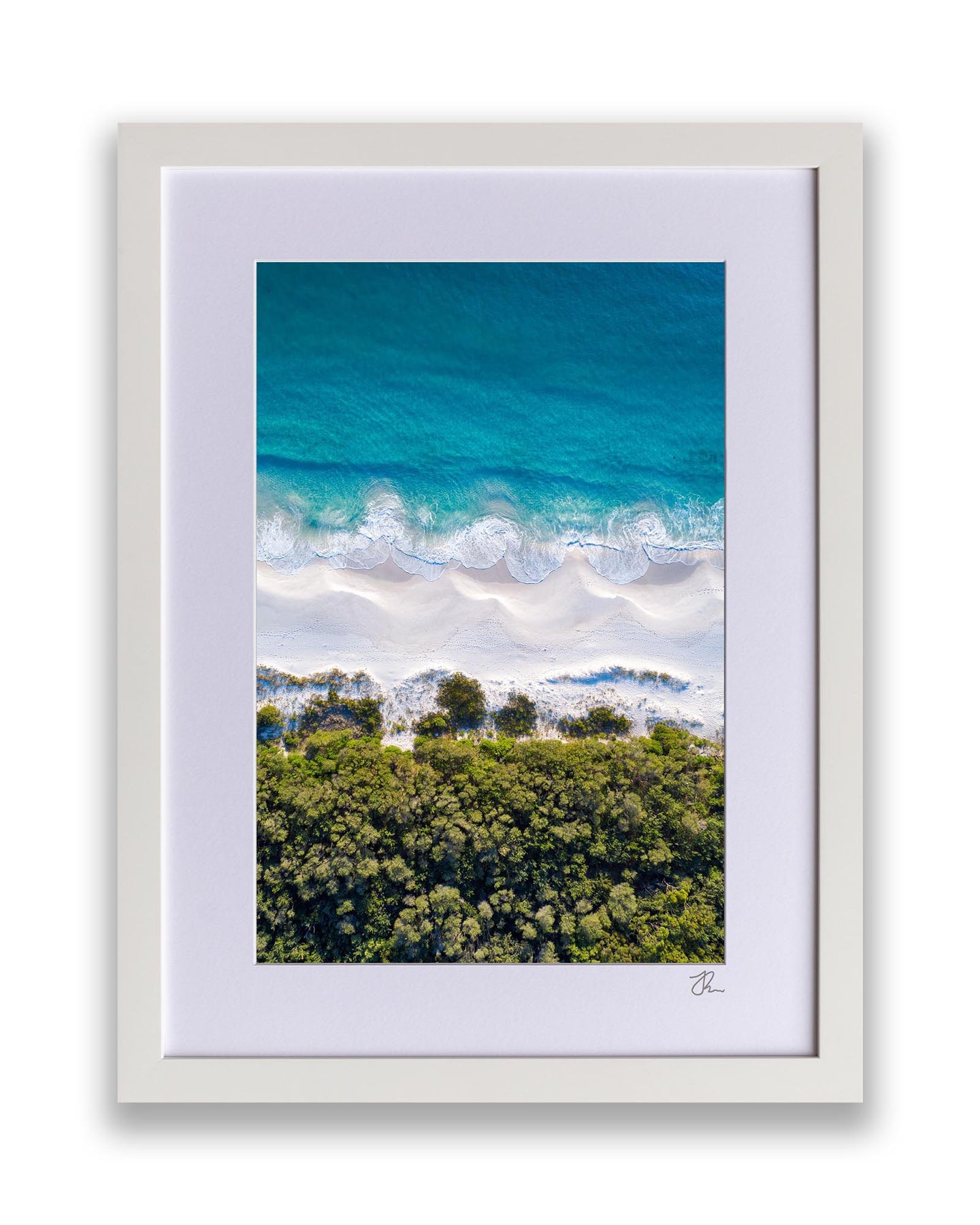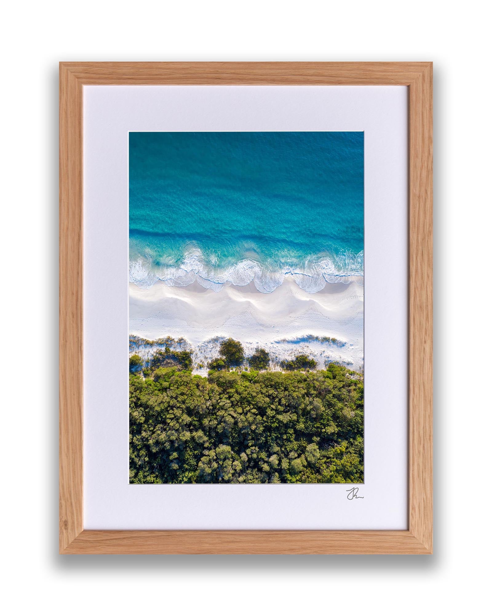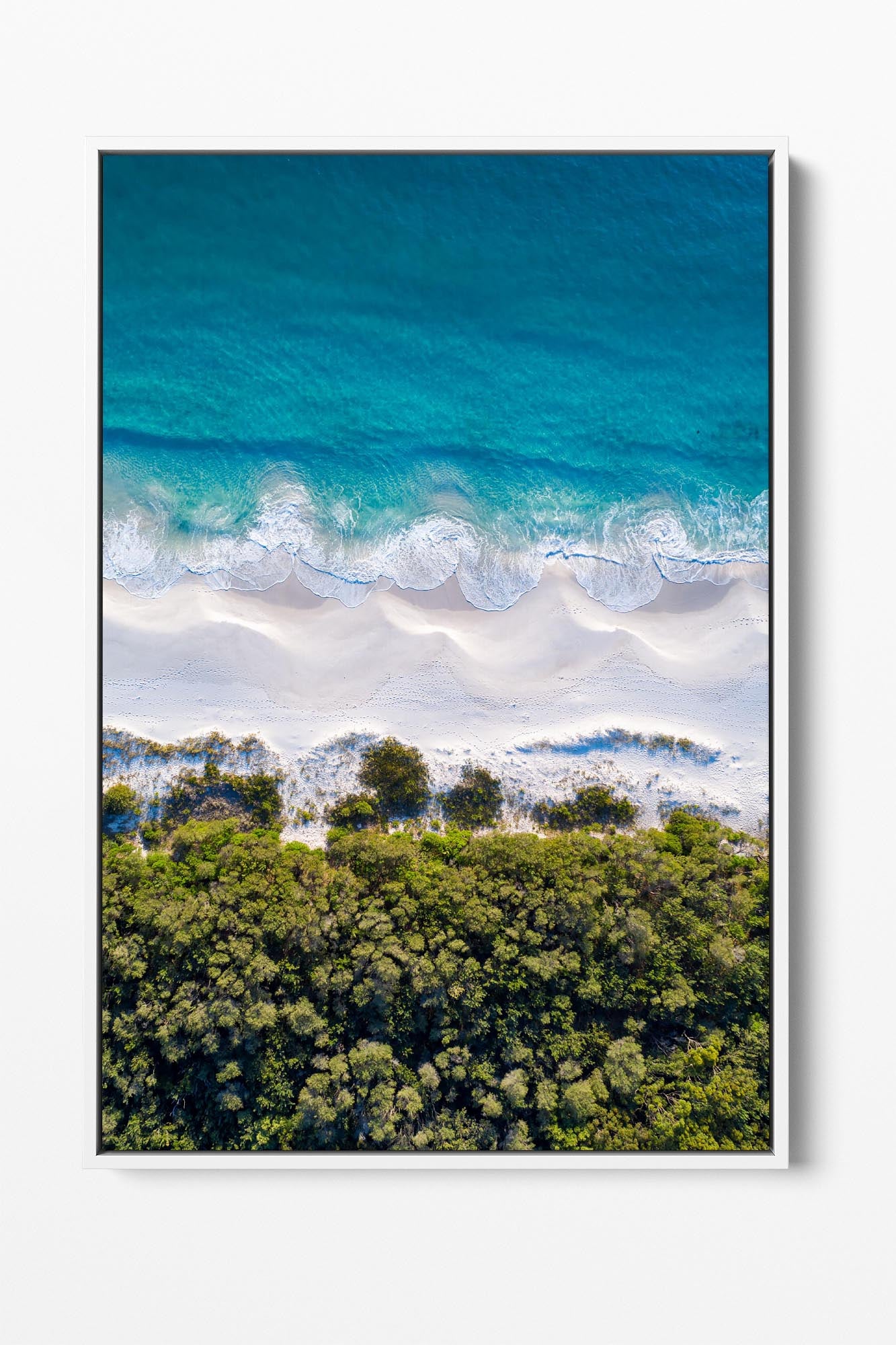 Photo print of an aerial view of Hyams Beach, where the bush meets bright white sand and crystal clear water.