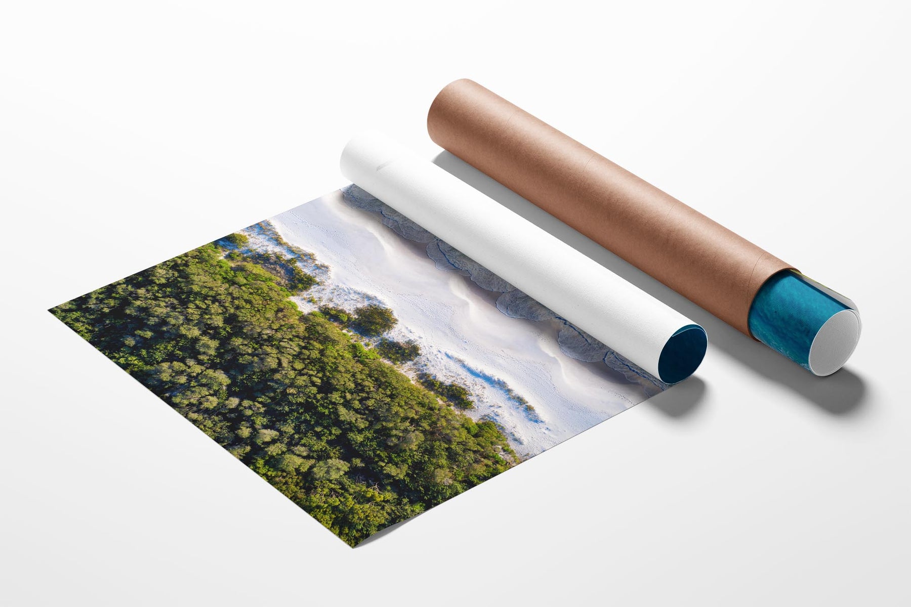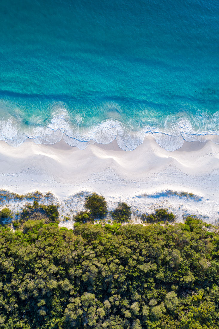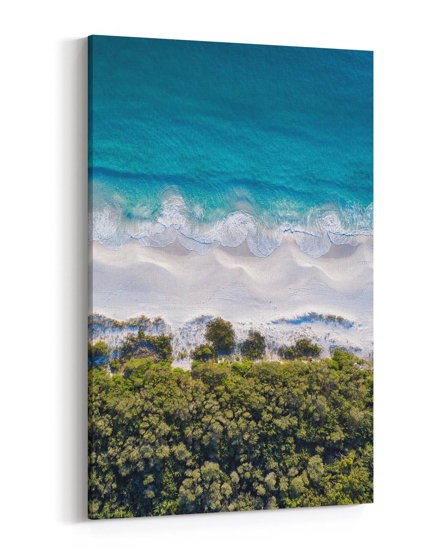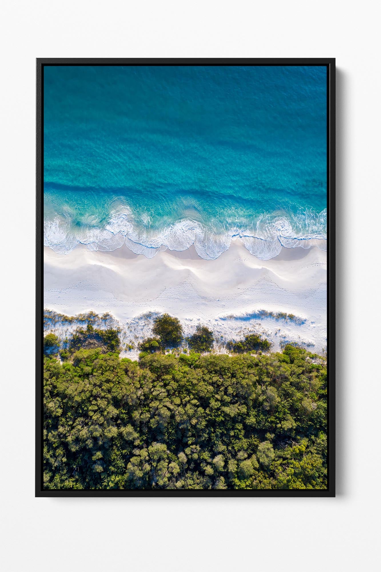 Photo print of an aerial view of Hyams Beach, where the bush meets bright white sand and crystal clear water.