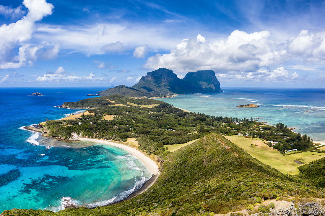 Soar above paradise with this breathtaking aerial photograph showcasing Neds Beach's pristine shoreline, where turquoise lagoon waters meet golden sands with the dramatic peaks of Mount Gower and Mount Lidgbird rising in the distance. This UNESCO World Heritage-listed vista captures Lord Howe Island's untouched beauty in one spectacular frame—a harmonious blend of coastal serenity and volcanic grandeur.