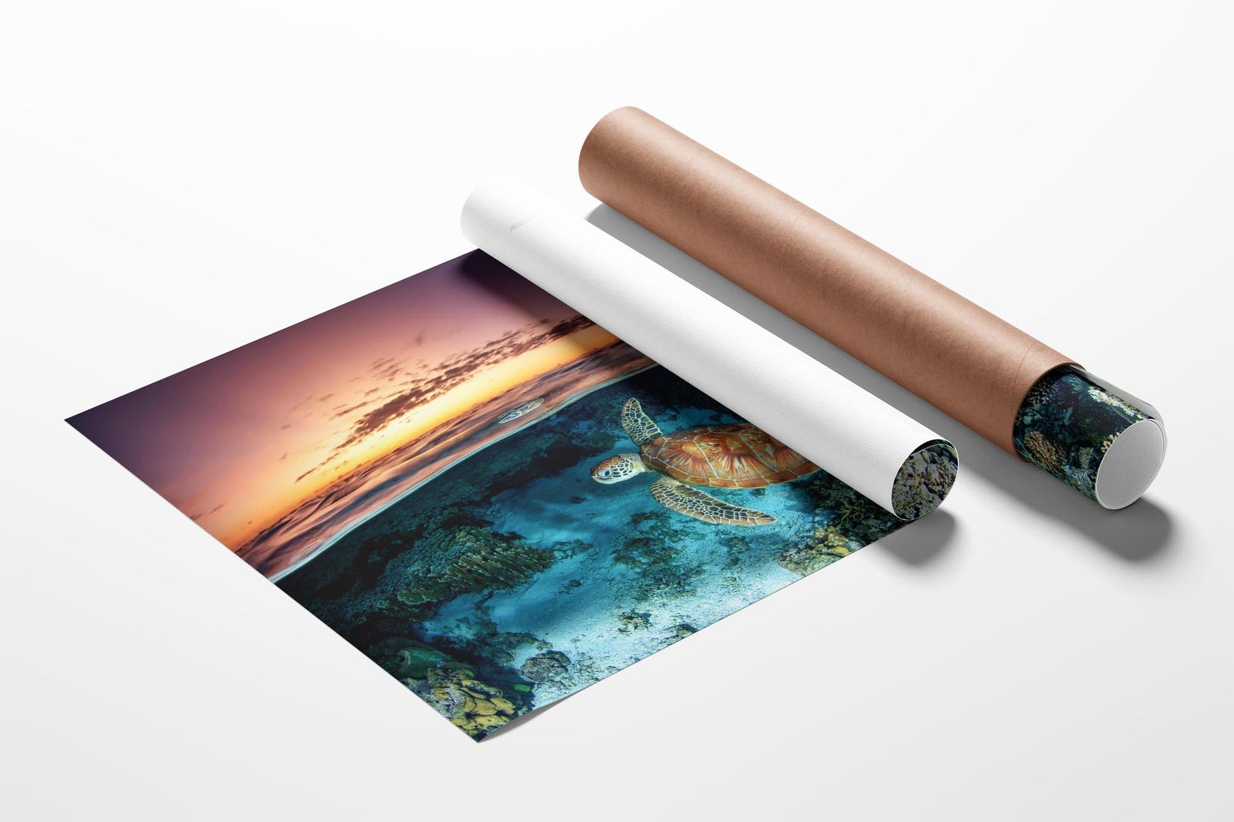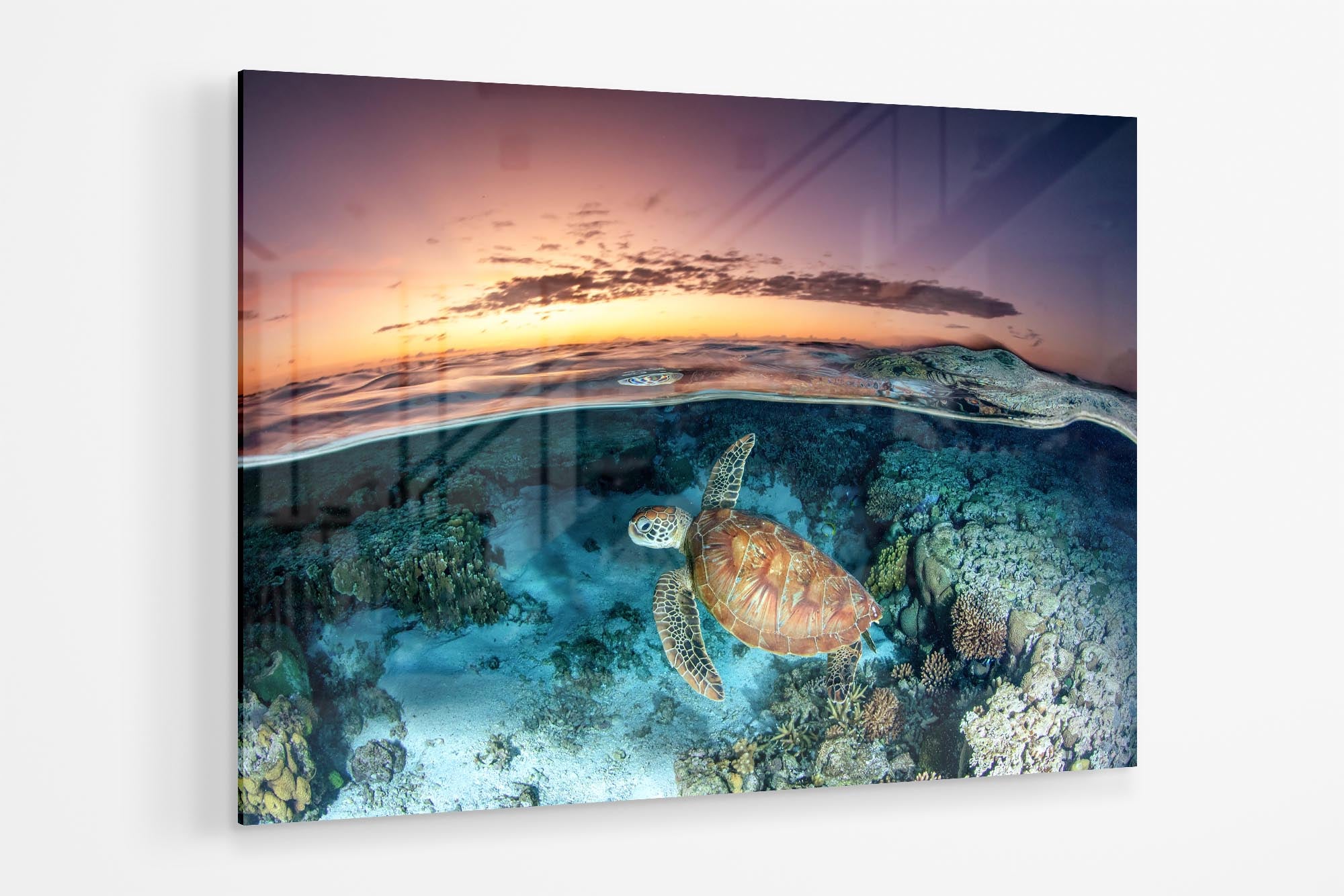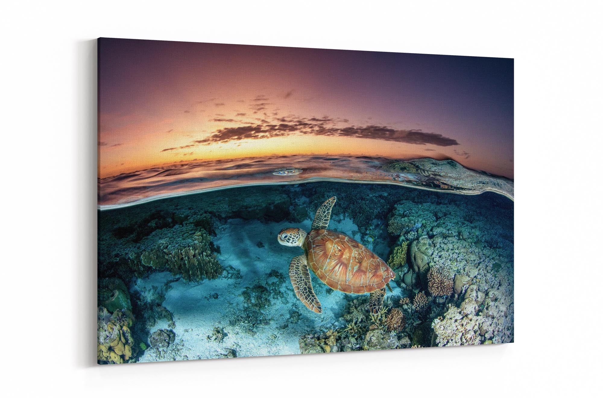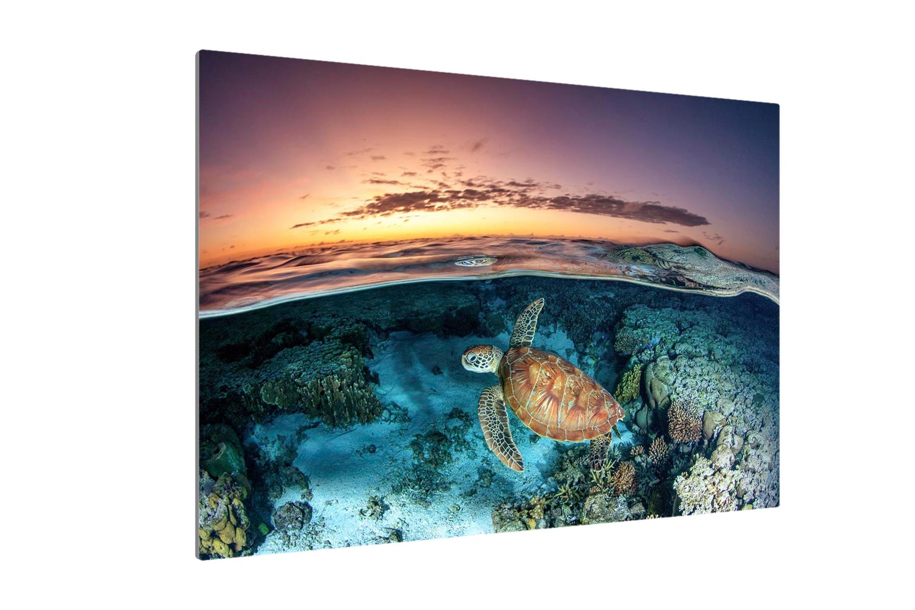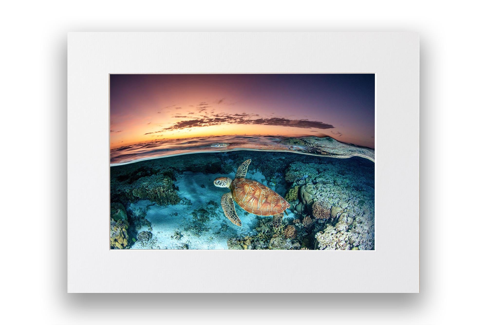 Green Sea Turtle (Chelonia mydas) Sunrise Split-Shot Print – Lady Elliot Island, Southern Great Barrier Reef, Queensland