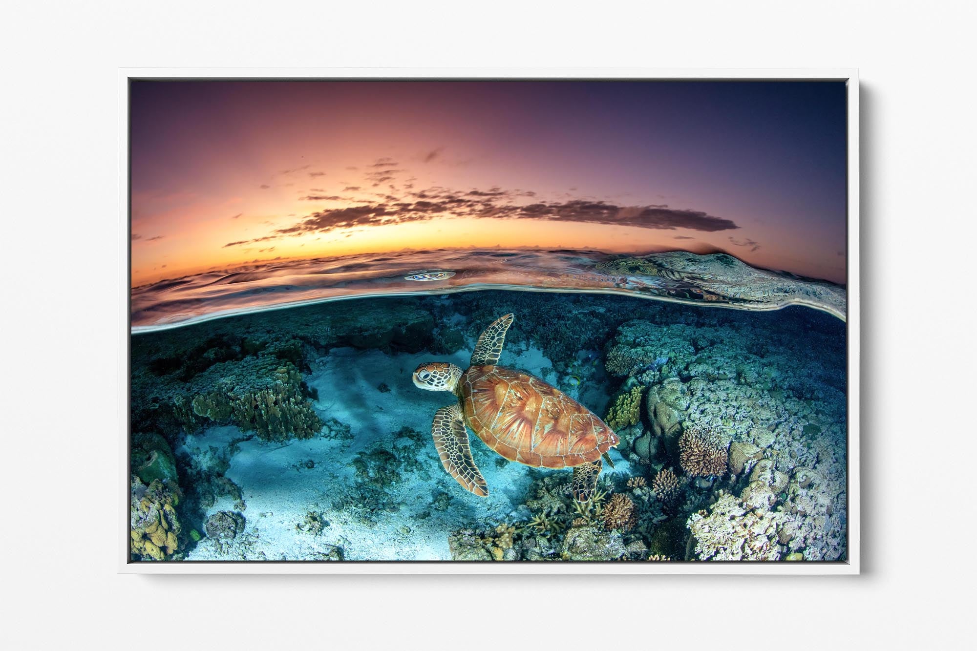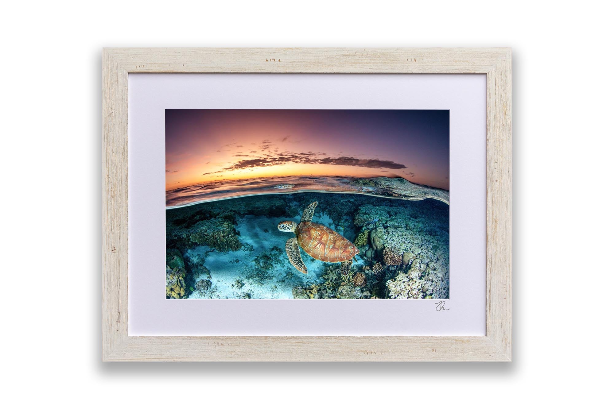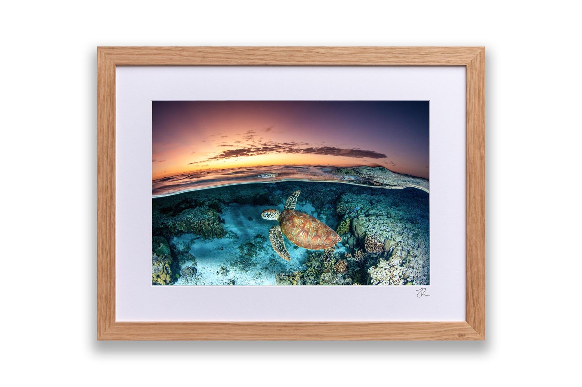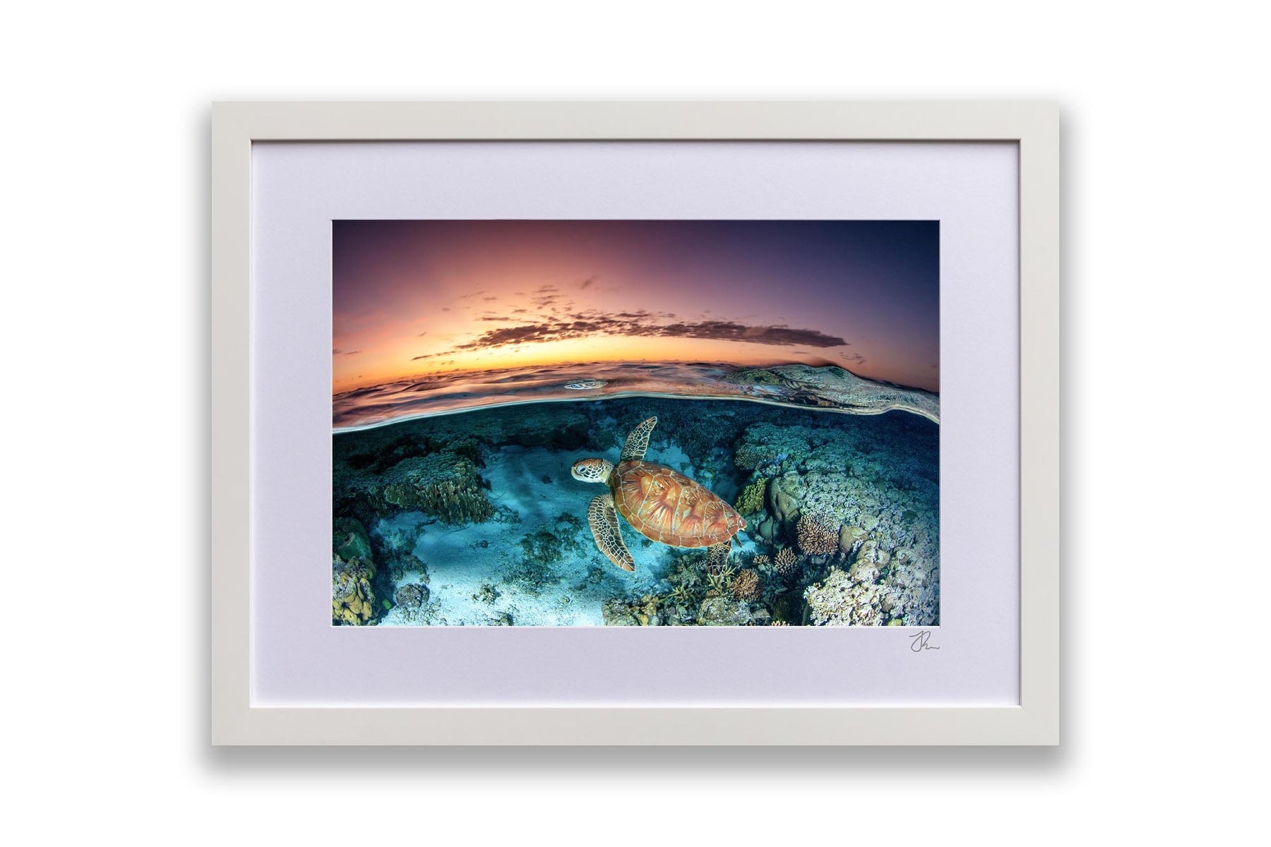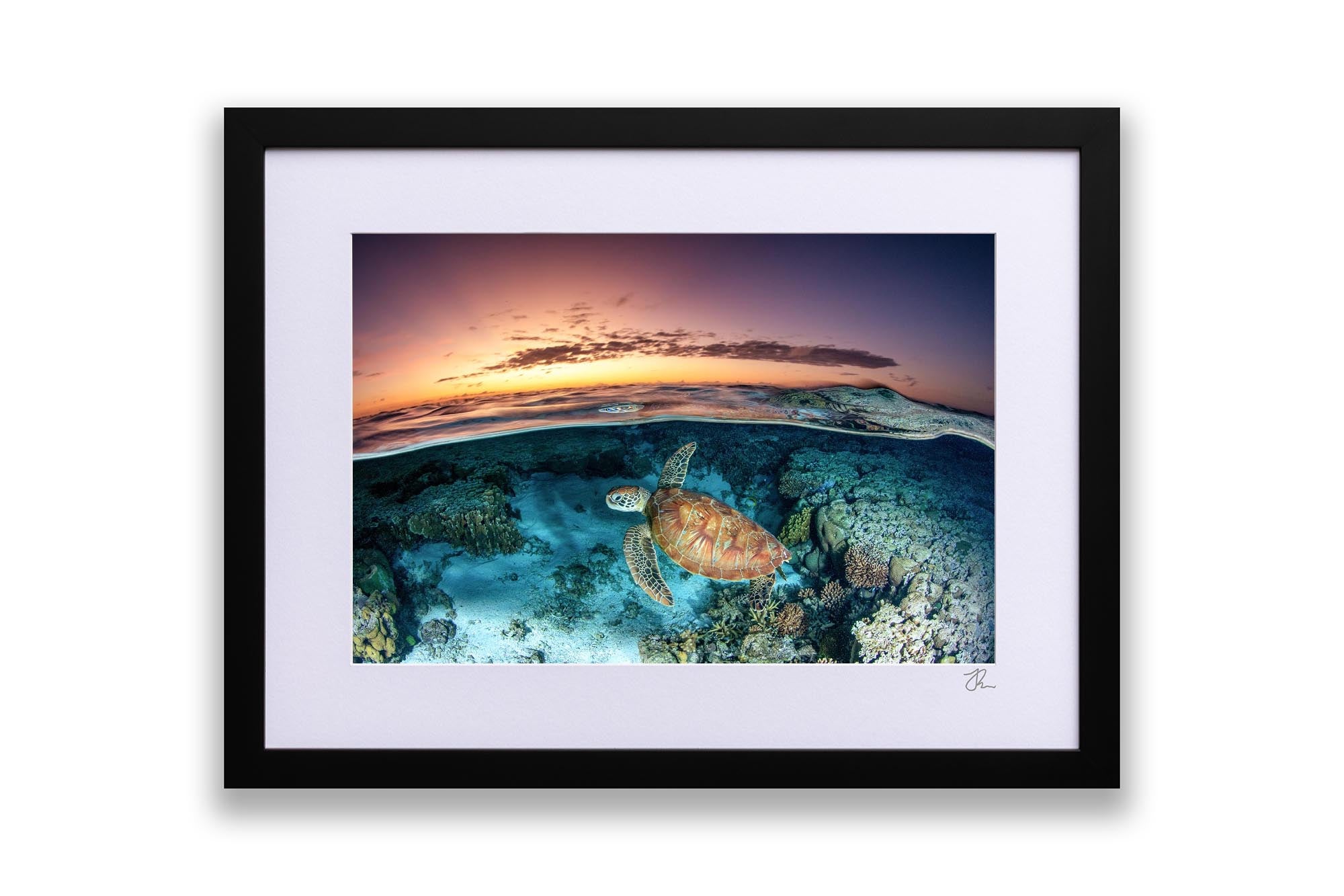 This captivating over-under photography print captures a Green Sea Turtle (Chelonia mydas) gliding gracefully over vibrant coral gardens in the lagoon of Lady Elliot Island, part of Queensland’s UNESCO World Heritage-listed Southern Great Barrier Reef. The split-shot composition artfully balances the turtle’s serene underwater journey with the golden hues of sunrise reflecting on the lagoon’s glassy surface.