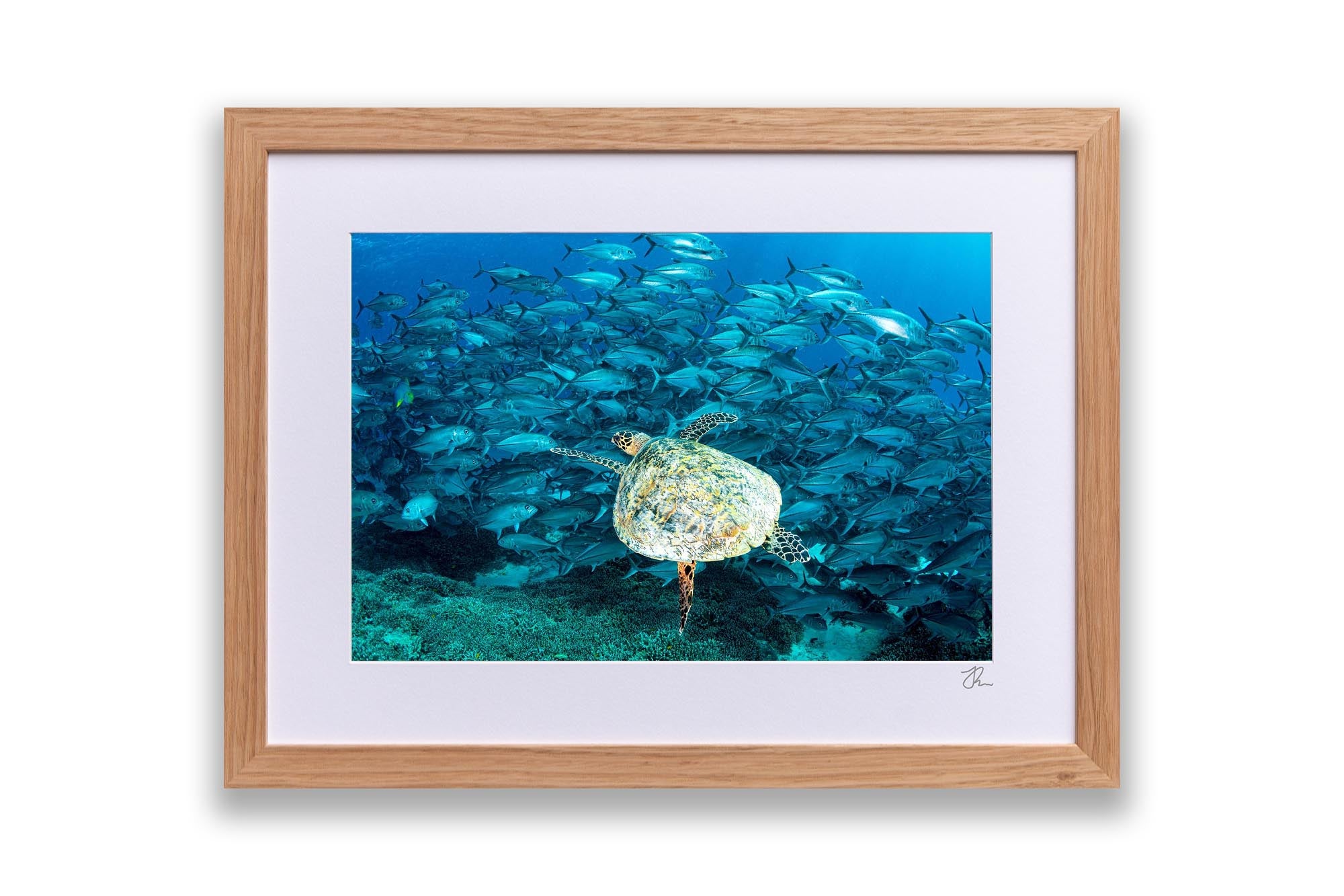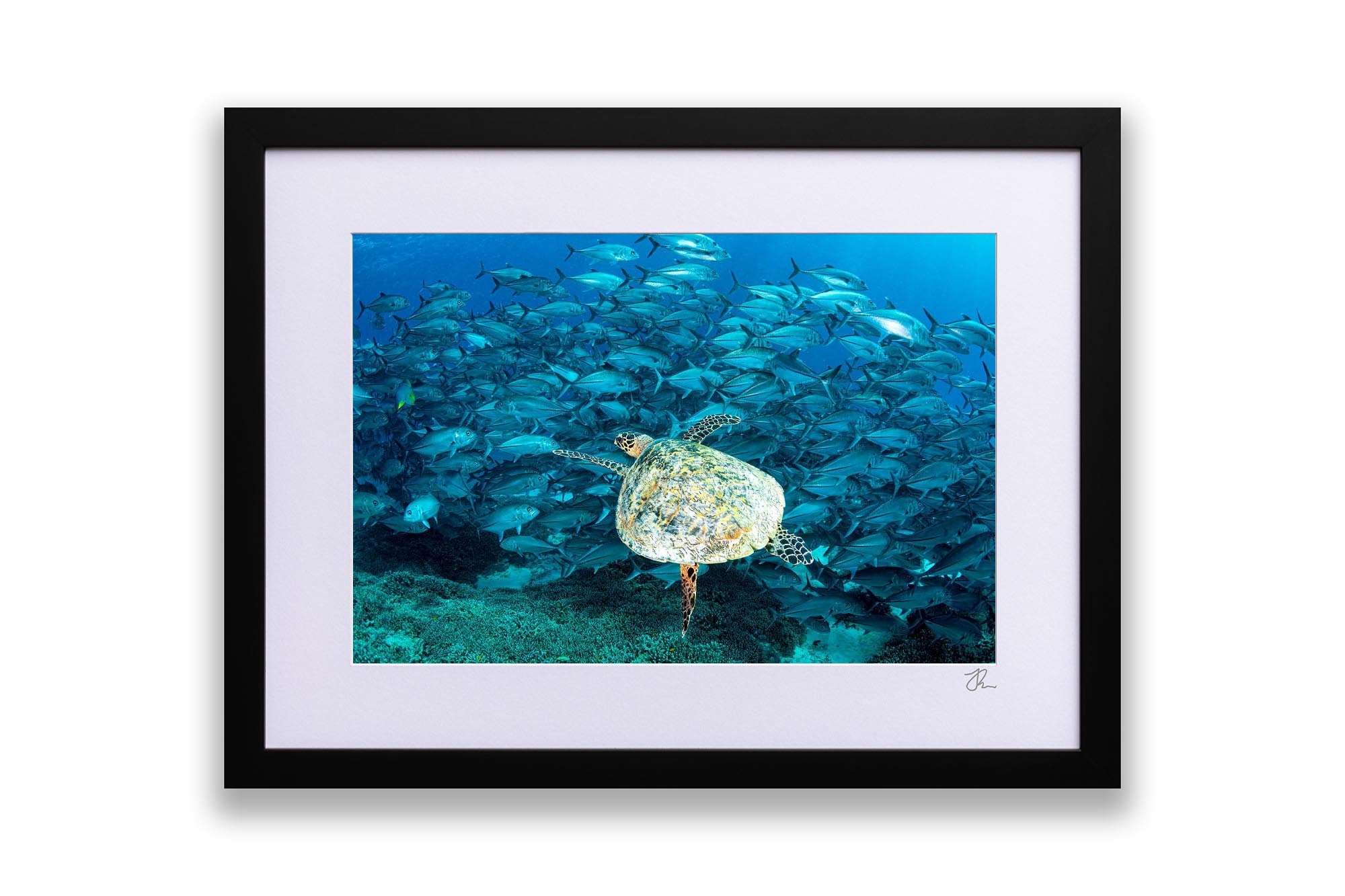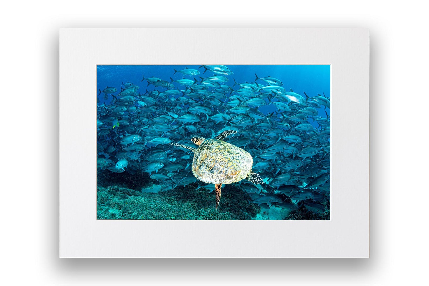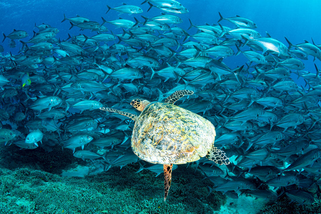 Hawksbill Sea Turtle & Big Eye Trevally School Print – Lady Elliot Island, Southern Great Barrier Reef, Australia