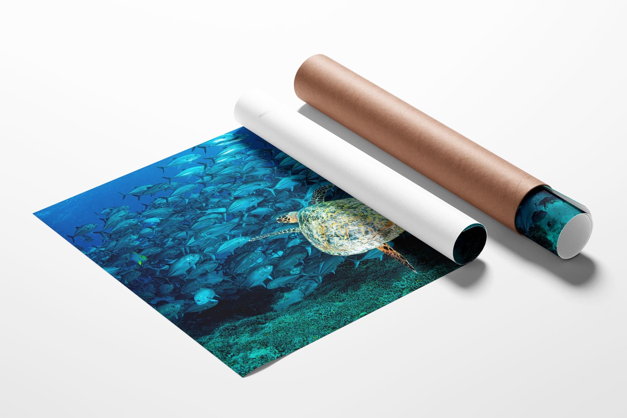 This captivating underwater photography print captures an endangered Hawksbill Sea Turtle swimming gracefully over vibrant coral reefs, surrounded by a dynamic school of Big Eye Trevally, on Lady Elliot Island on the Southern Great Barrier Reef. The image celebrates the harmony of marine life, showcasing the turtle’s intricate shell patterns and the shimmering energy of the trevally school against the reef’s pristine turquoise backdrop—a testament to Australia’s unparalleled marine biodiversity.