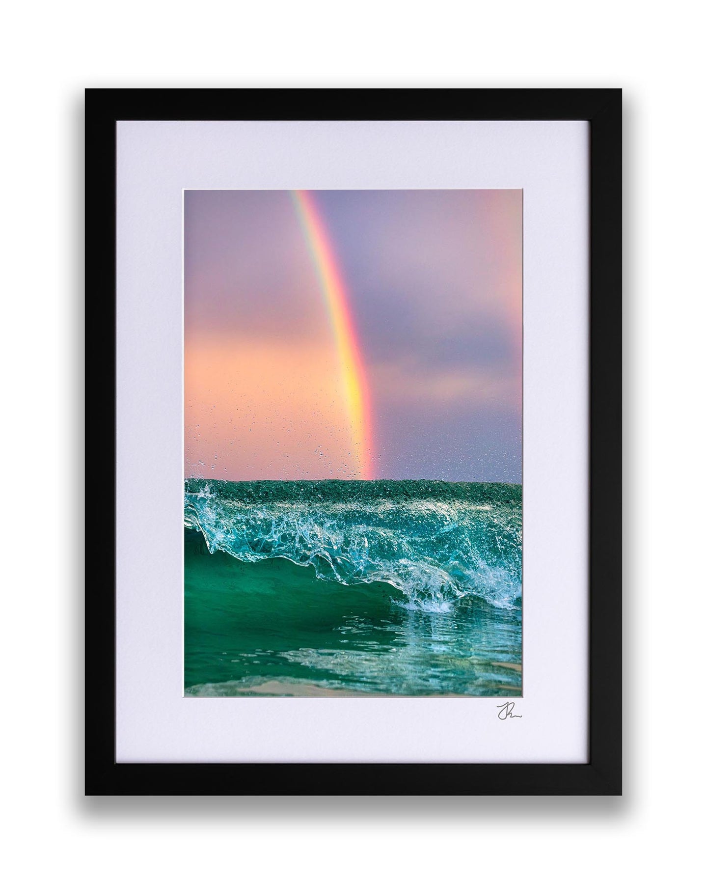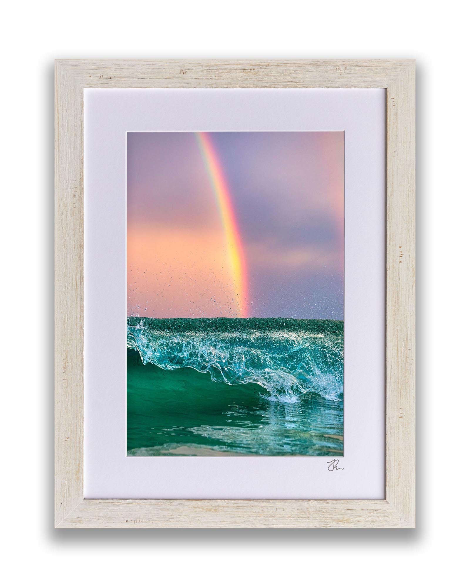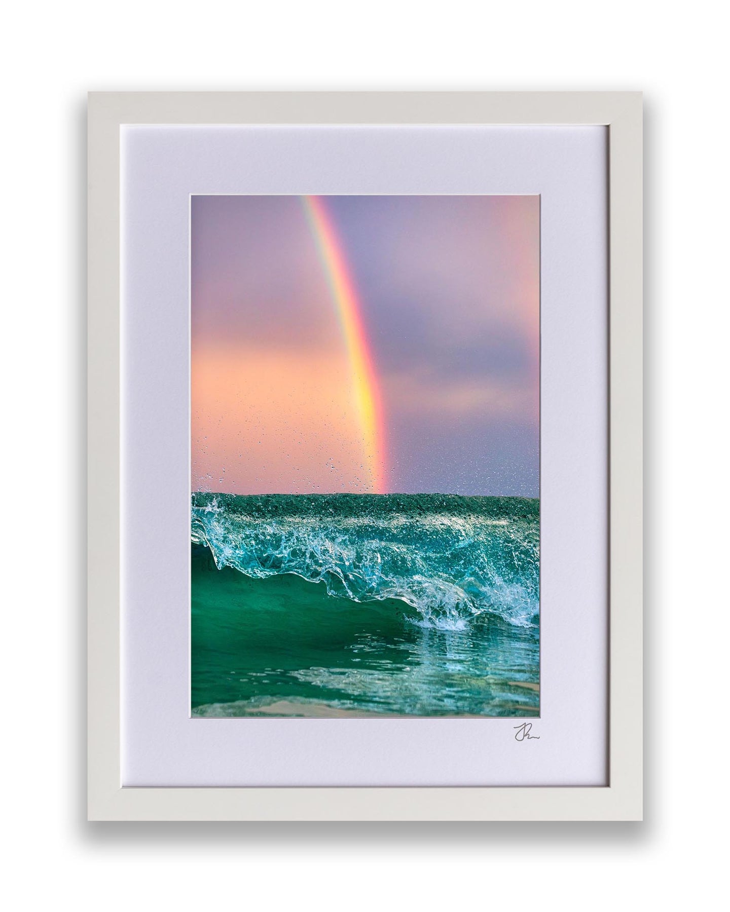 Photo print of waves crashing upon the shoreline at Huskisson Beach in Jervis Bay as a beautiful rainbow shines overhead.