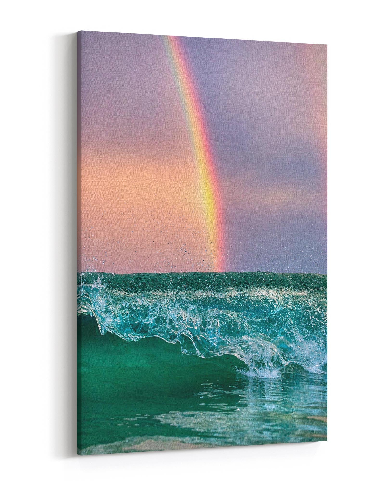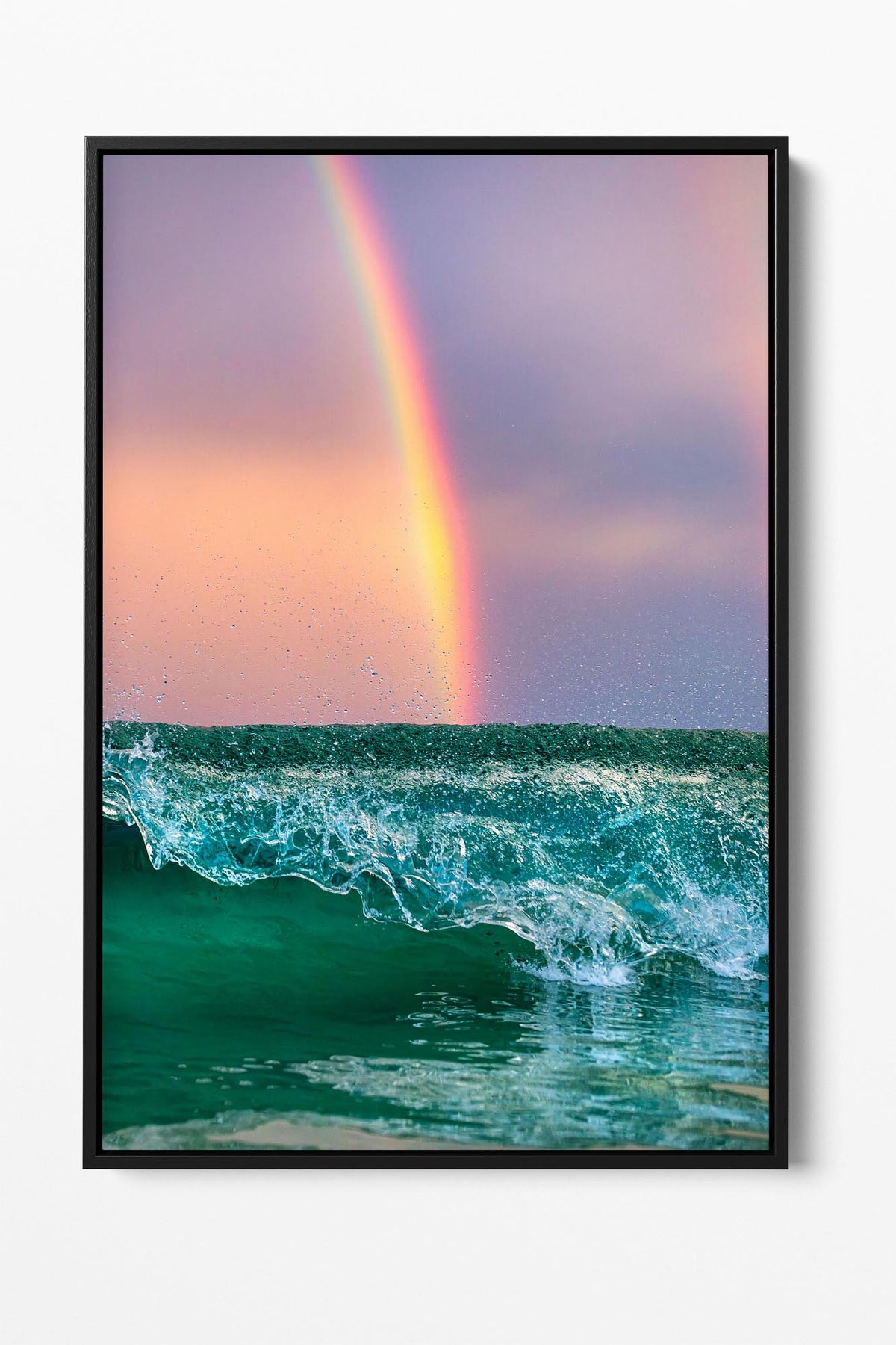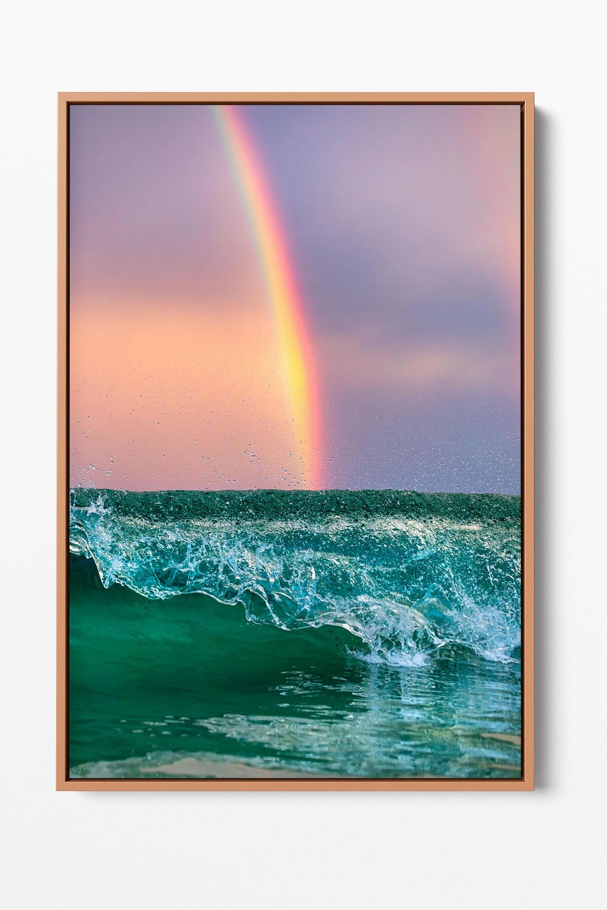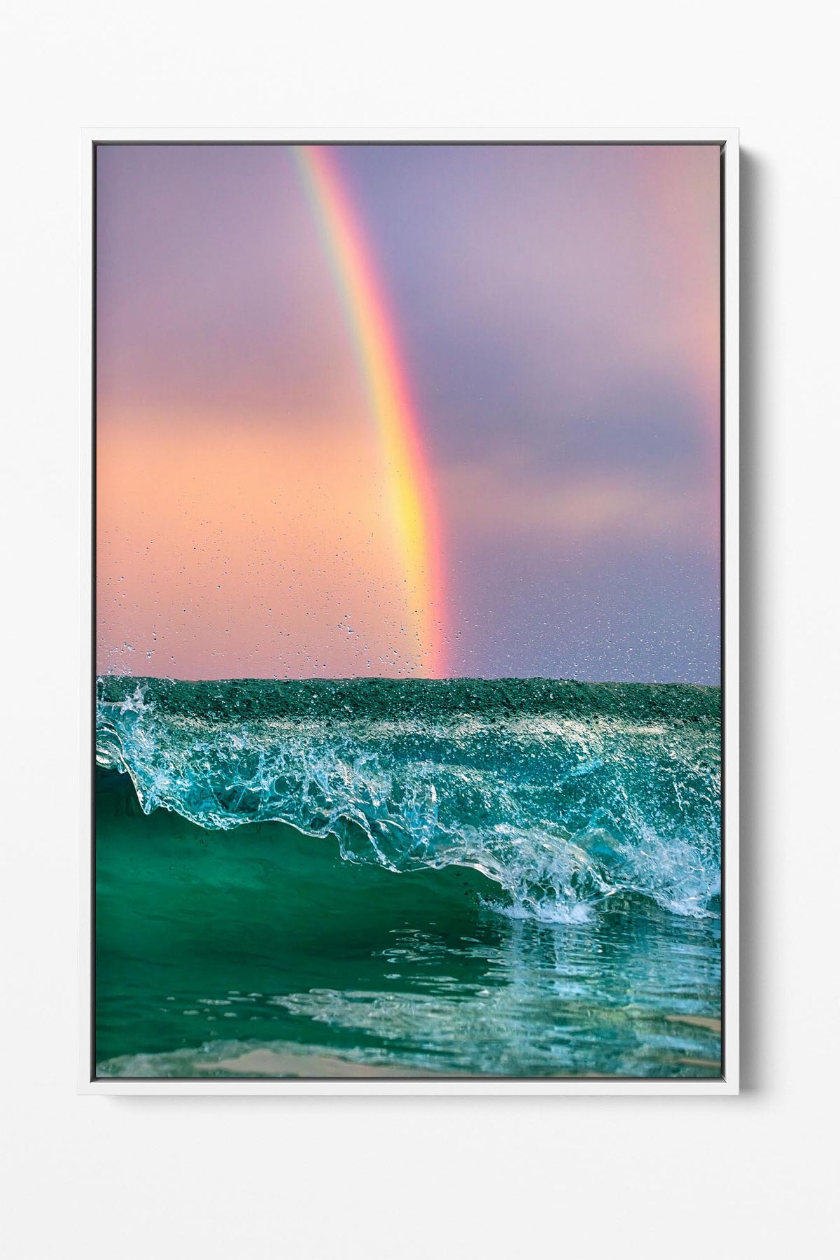 Photo print of waves crashing upon the shoreline at Huskisson Beach in Jervis Bay as a beautiful rainbow shines overhead.