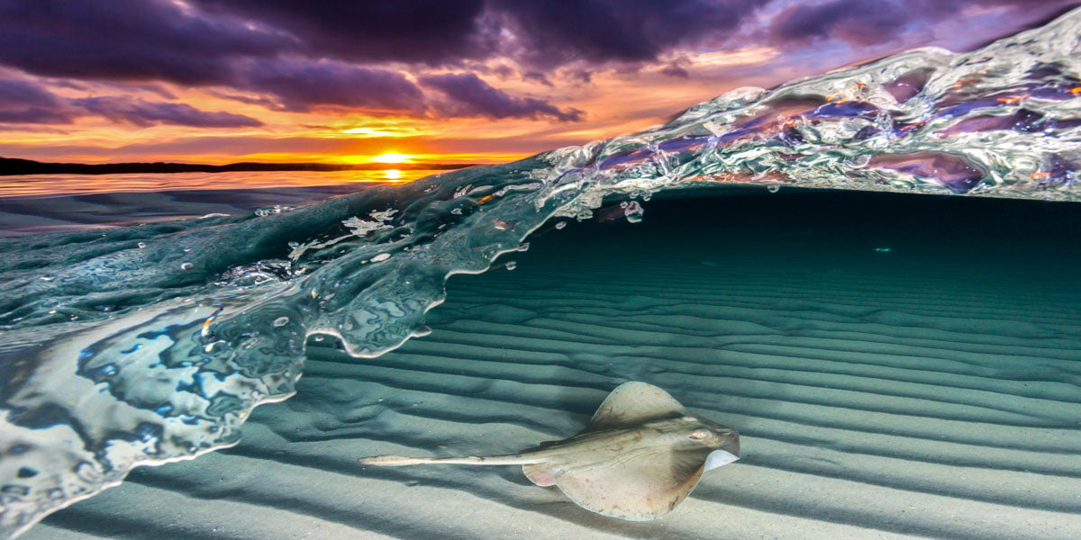 A Common Stingaree glides over the sand flats on sunset in Jervis Bay.