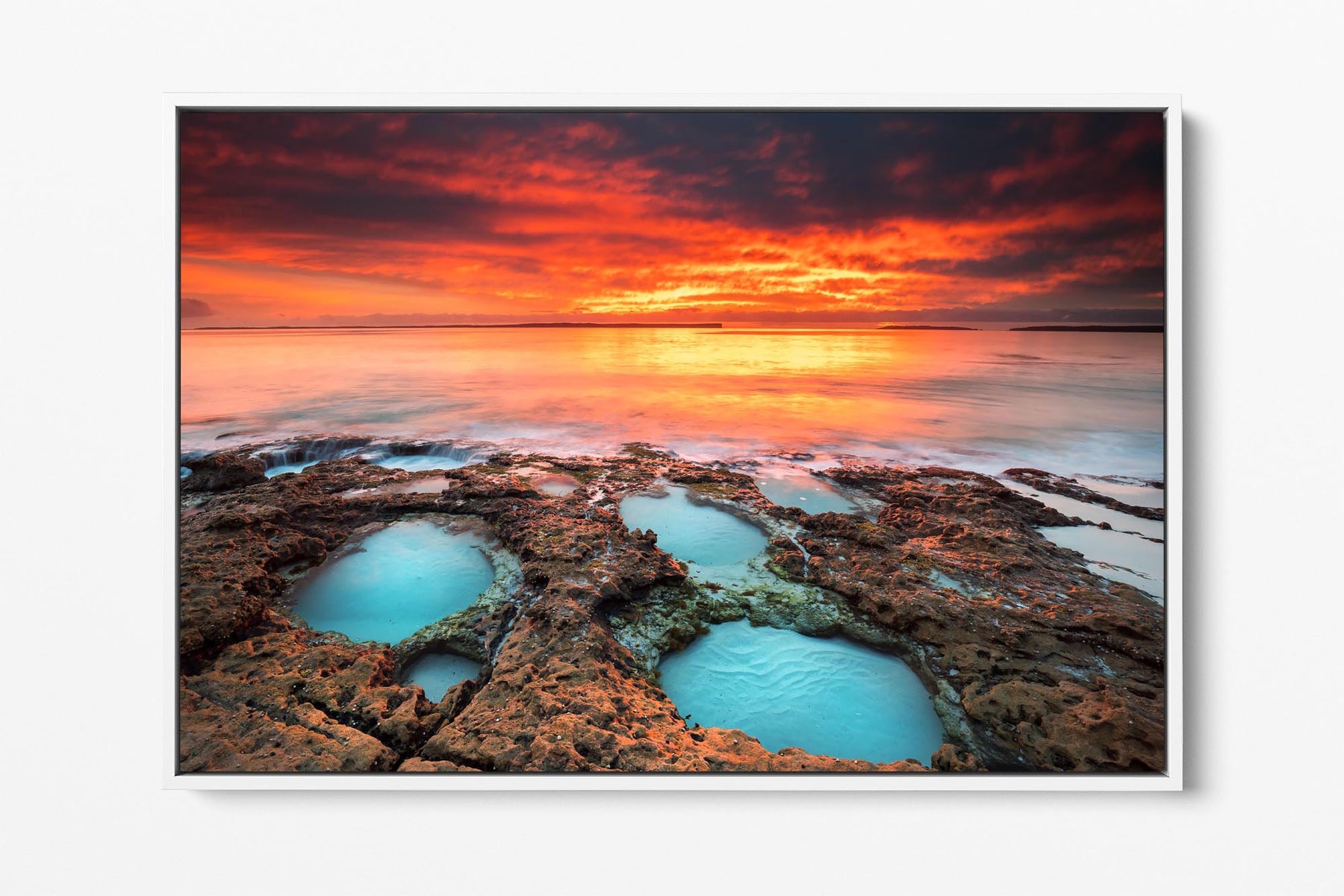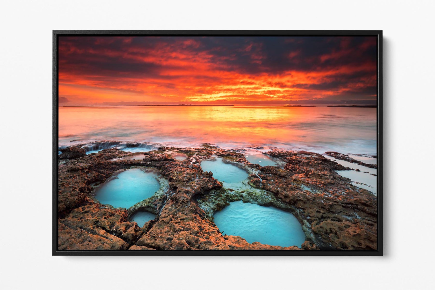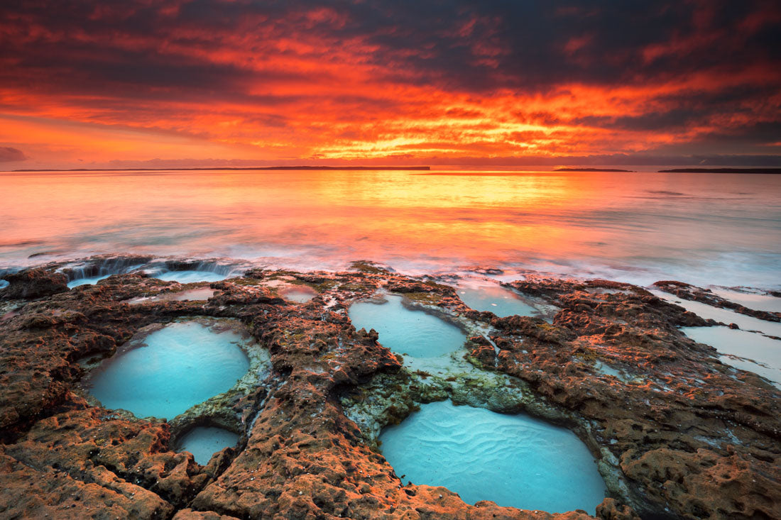A vivid sunrise at Chinamans Beach, looking out towards Point Perpendicular at the entrance of Jervis Bay,