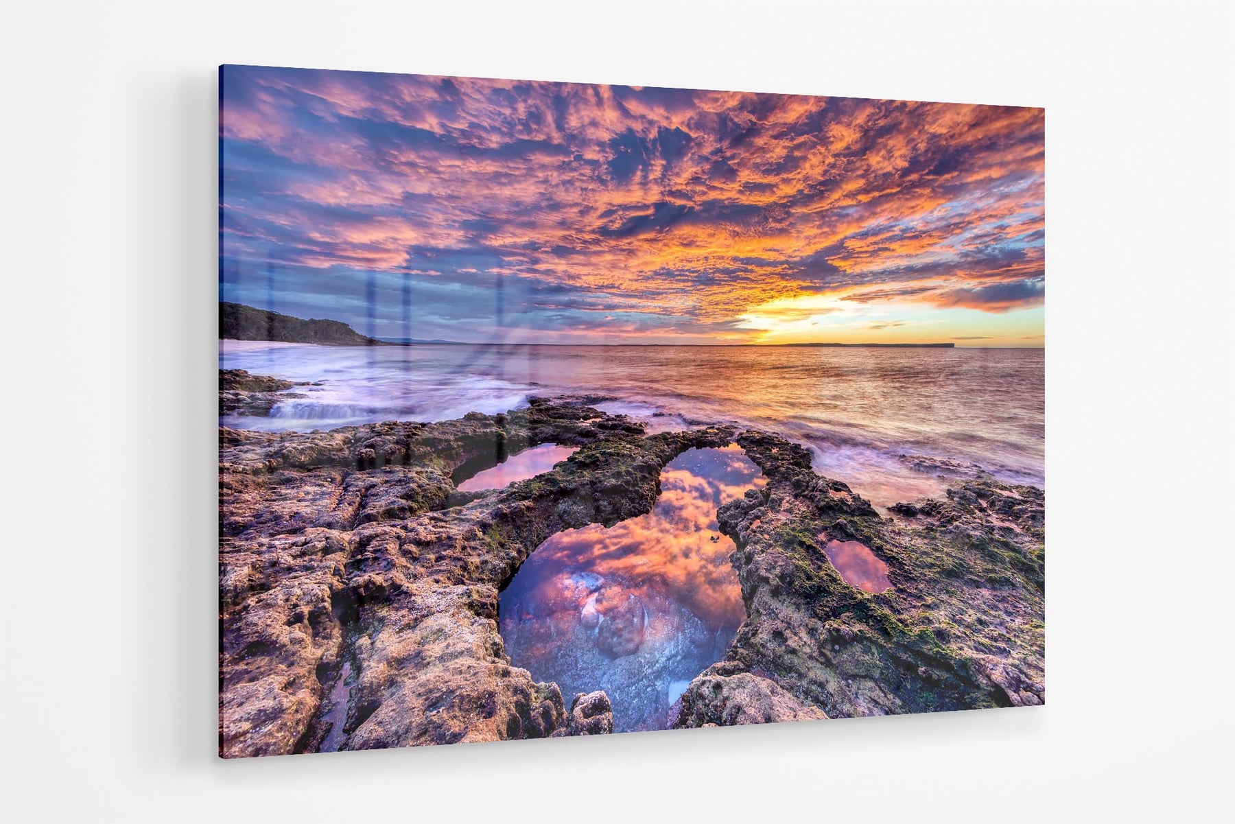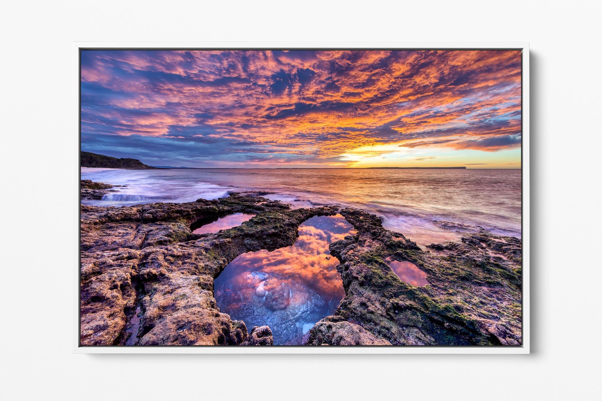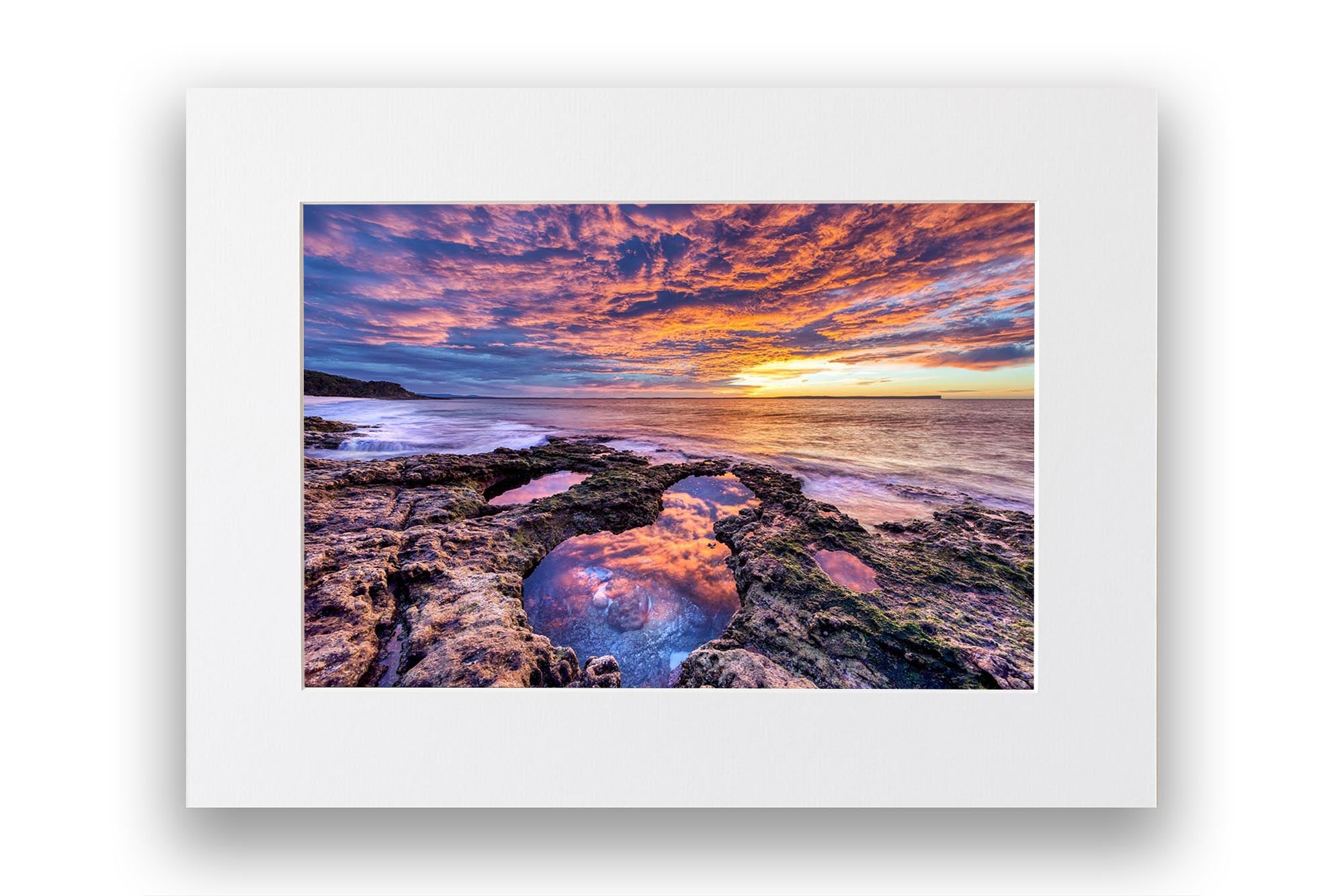 Experience the breathtaking beauty of a vivid sunrise on the rocky shoreline at Chinamans Beach, with this stunning photo print. Gazing out towards the iconic Point Perpendicular at the entrance of Jervis Bay, this image showcases the vibrant hues of the sunrise reflecting off the rugged rocks and tranquil waters.