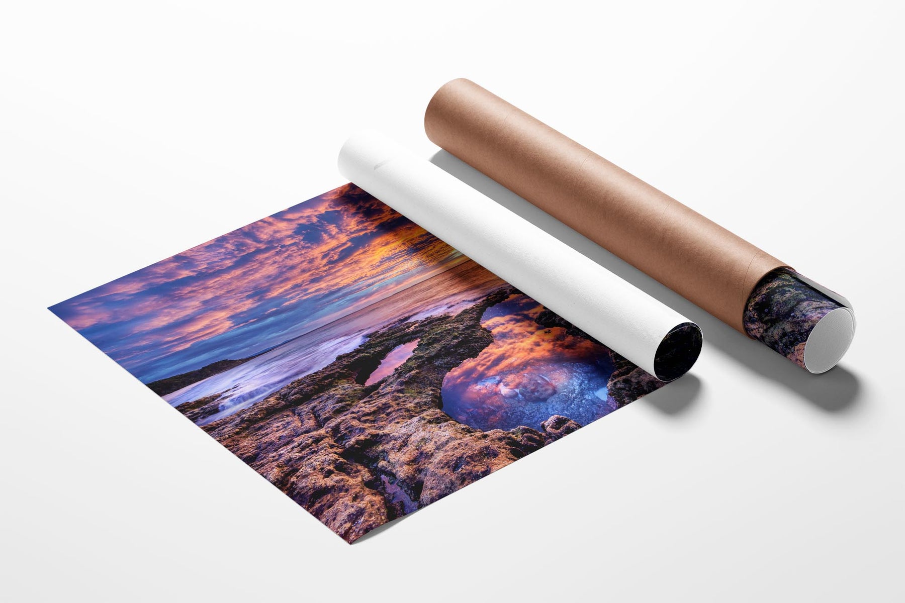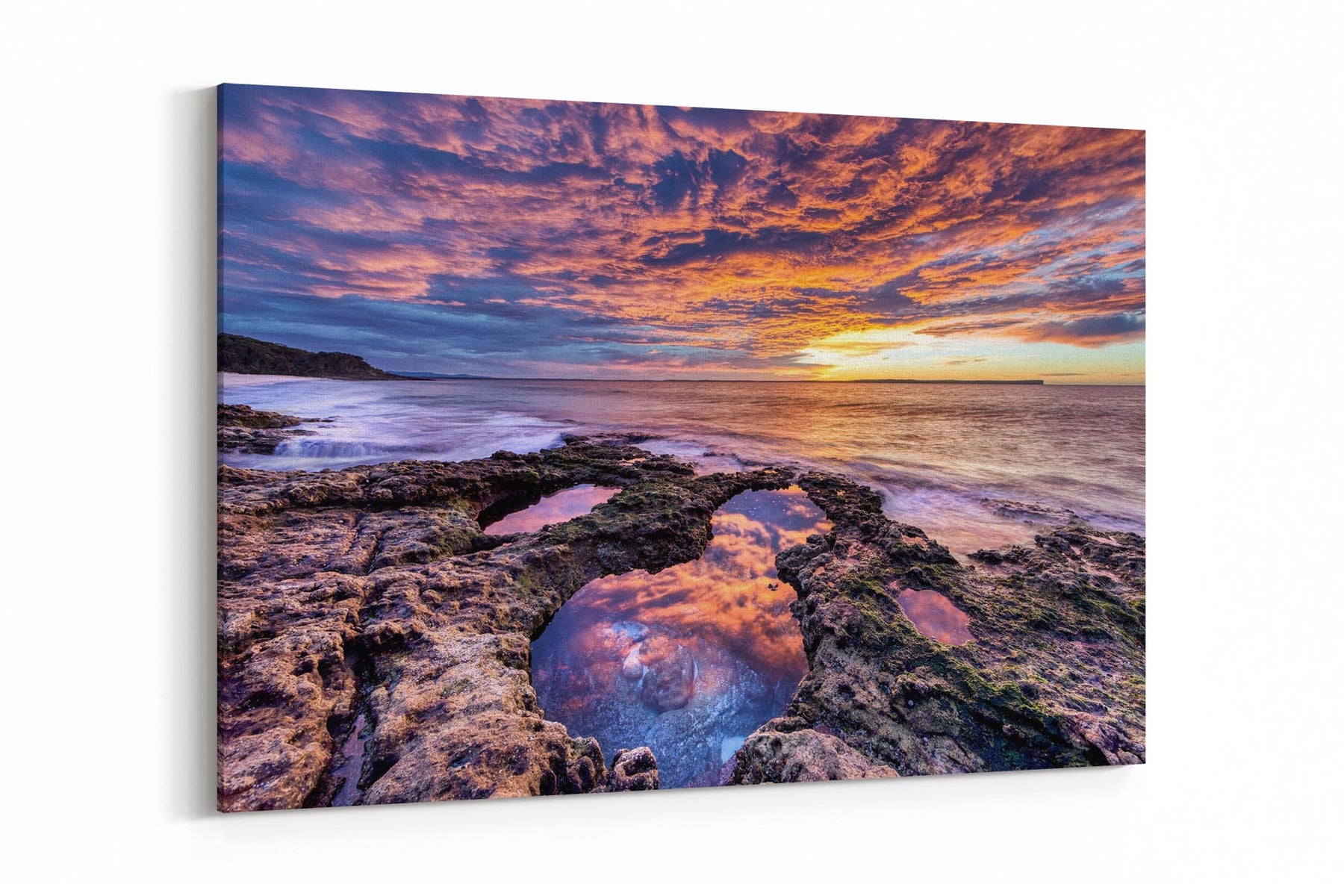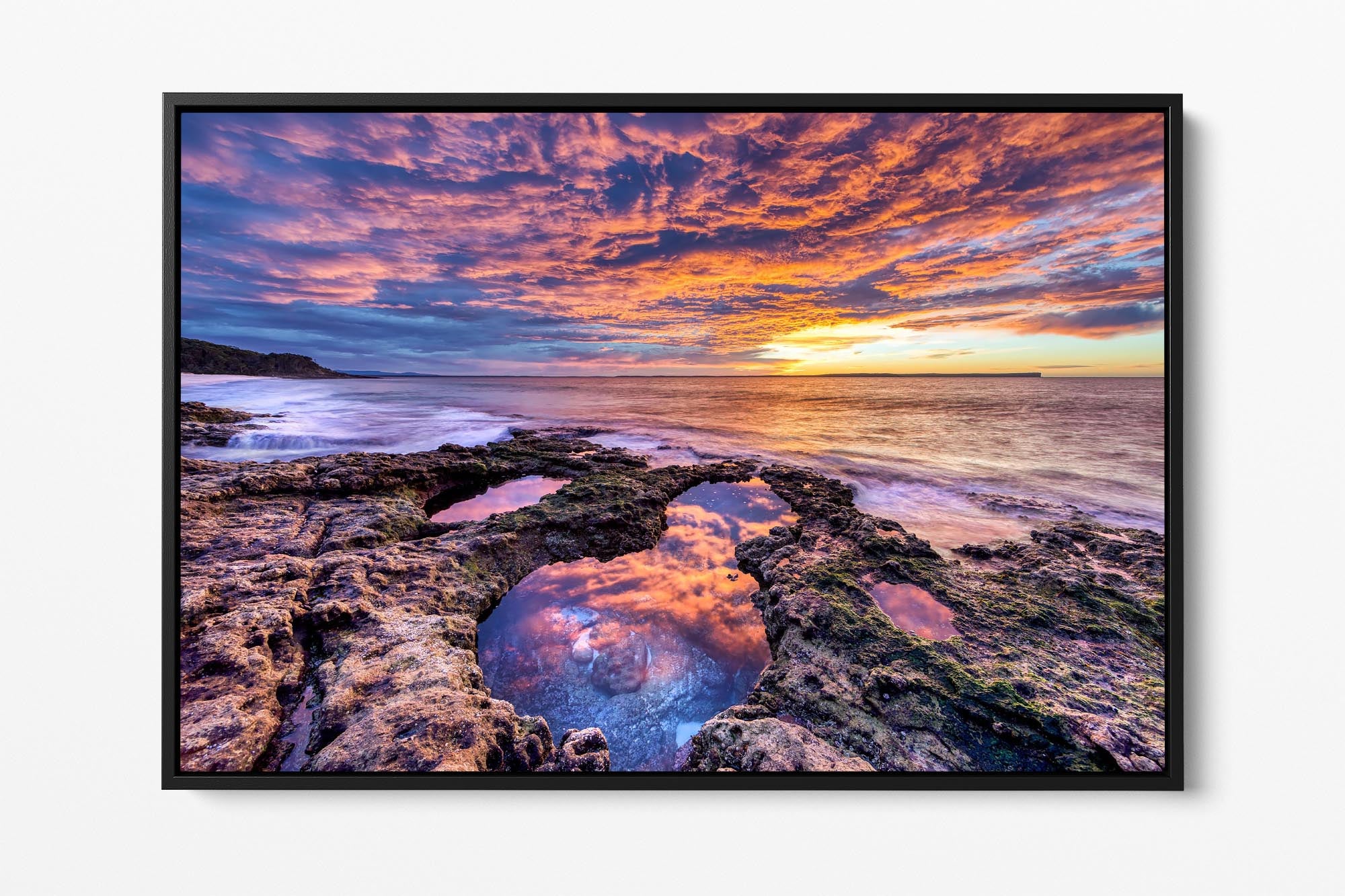 Experience the breathtaking beauty of a vivid sunrise on the rocky shoreline at Chinamans Beach, with this stunning photo print. Gazing out towards the iconic Point Perpendicular at the entrance of Jervis Bay, this image showcases the vibrant hues of the sunrise reflecting off the rugged rocks and tranquil waters.
