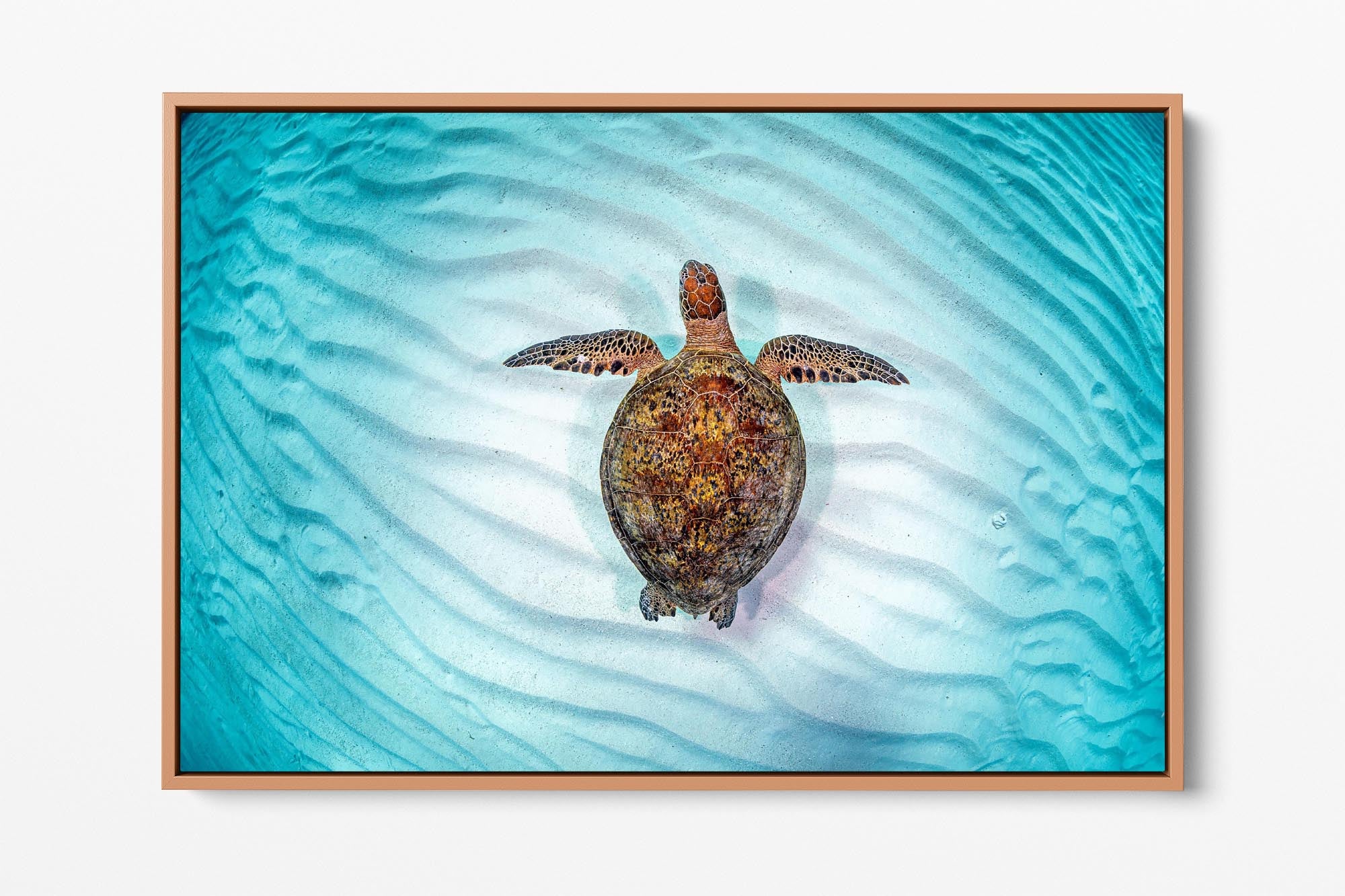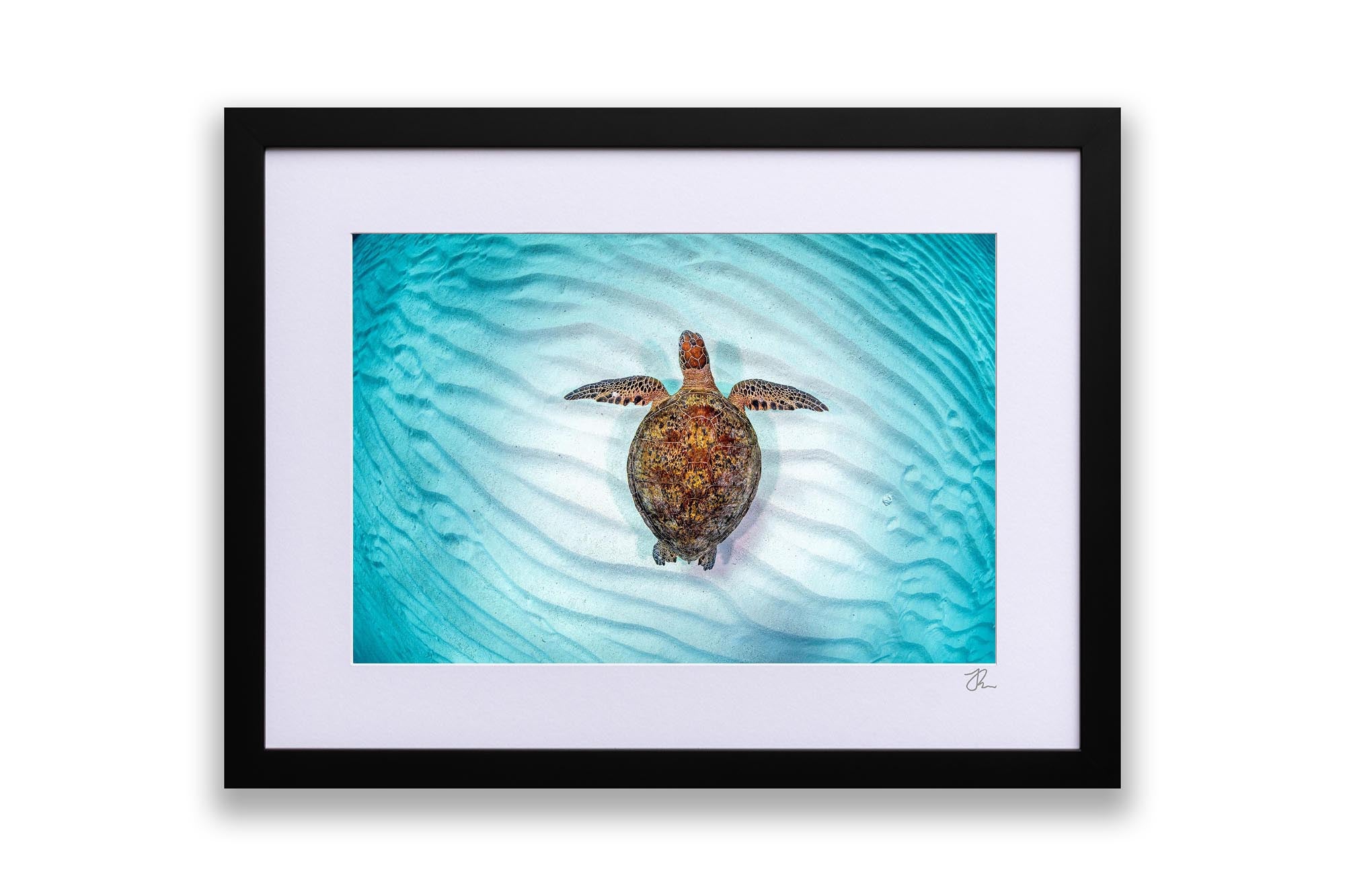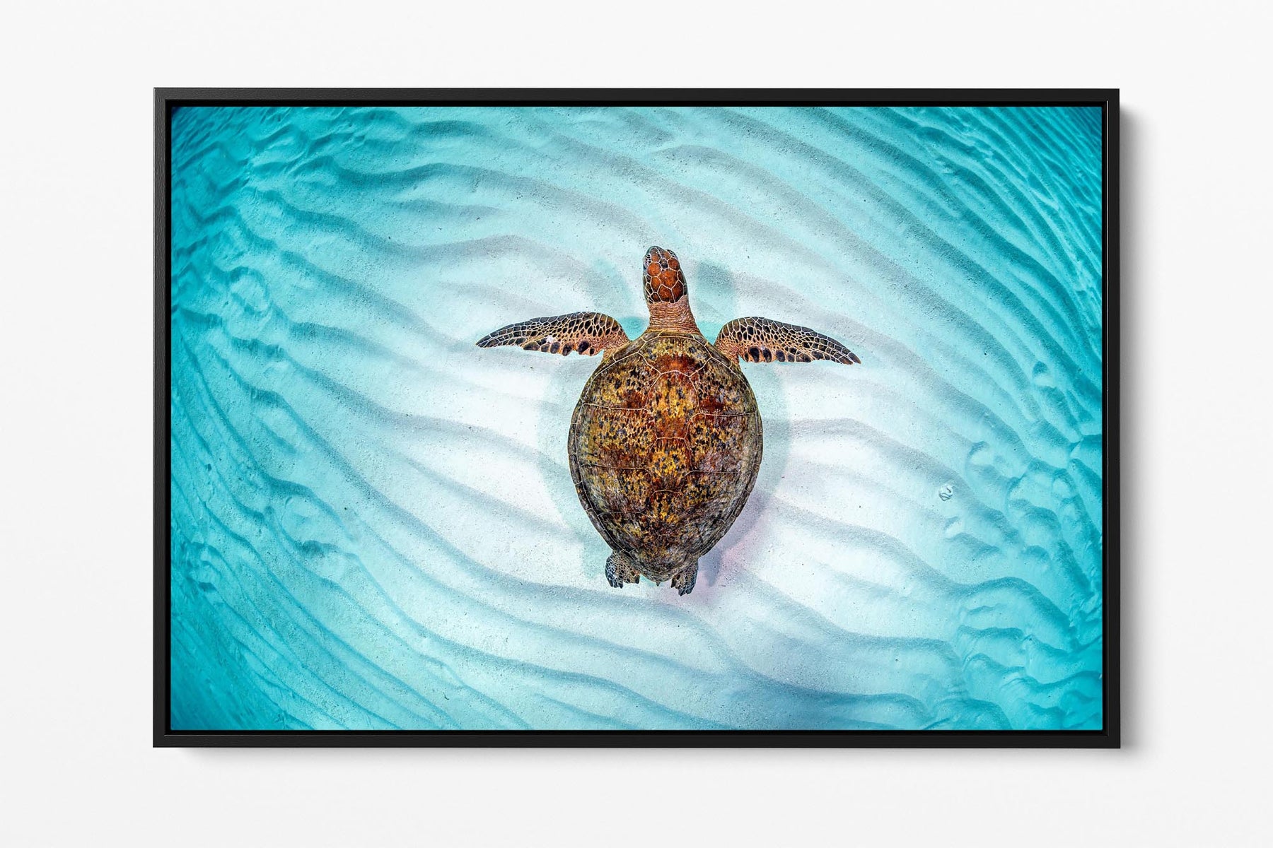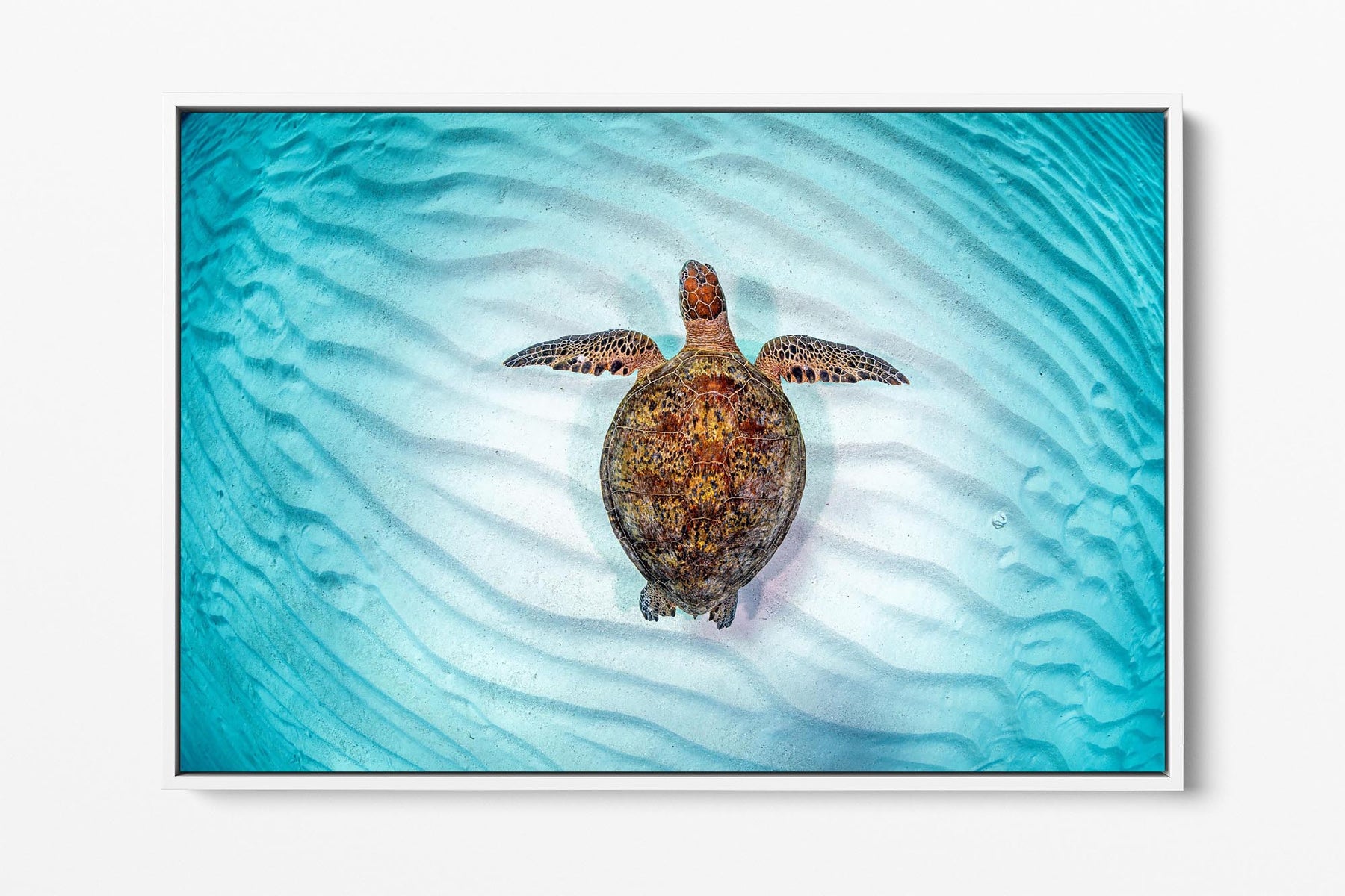 Marvel at the serene beauty of this underwater photograph capturing a graceful Green Sea Turtle effortlessly gliding over the textured sandy sea floor. Shot in the crystal-clear waters of Lady Elliot Island on Australia's Southern Great Barrier Reef, this artwork brings the peaceful majesty of marine life into your space with stunning clarity.
