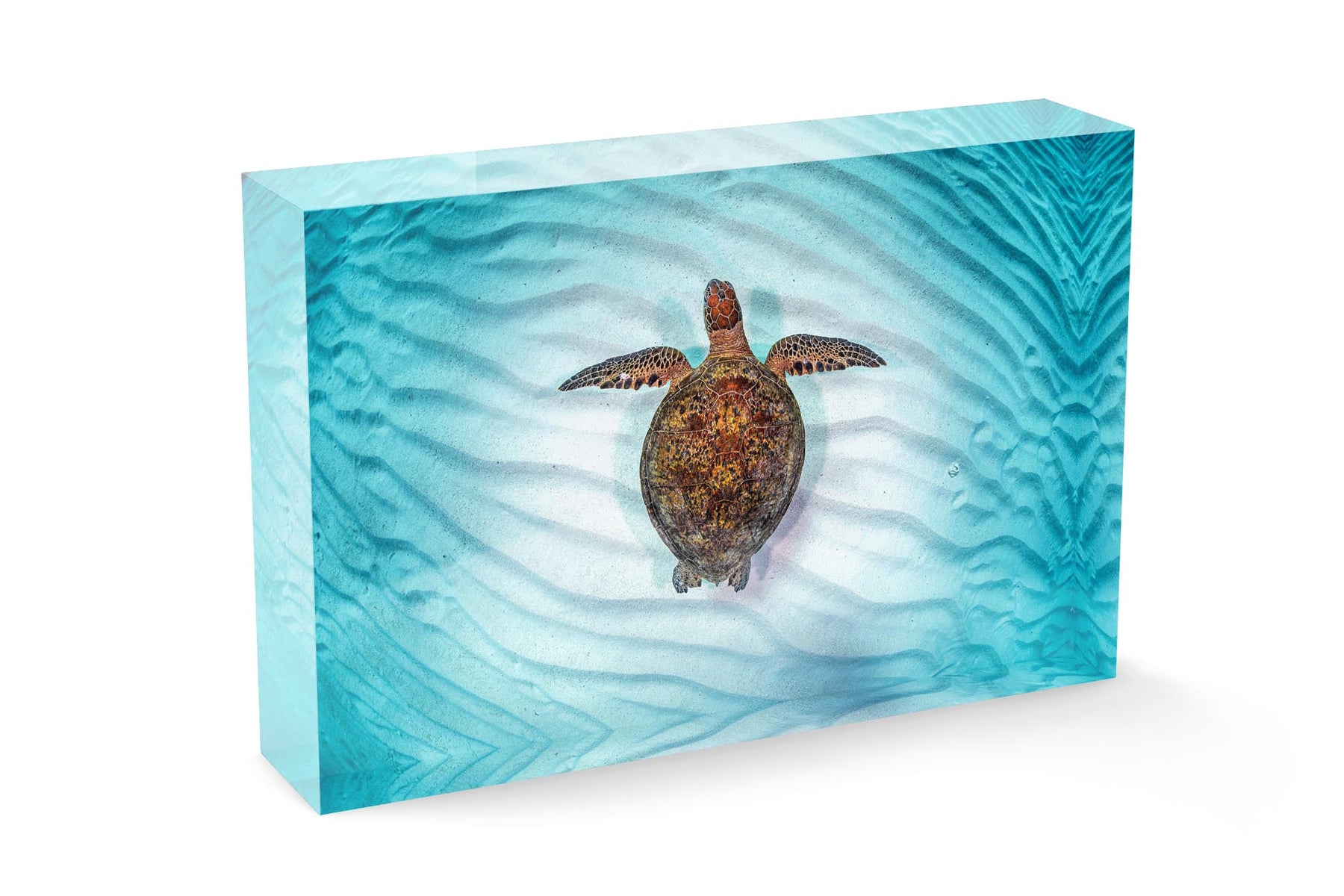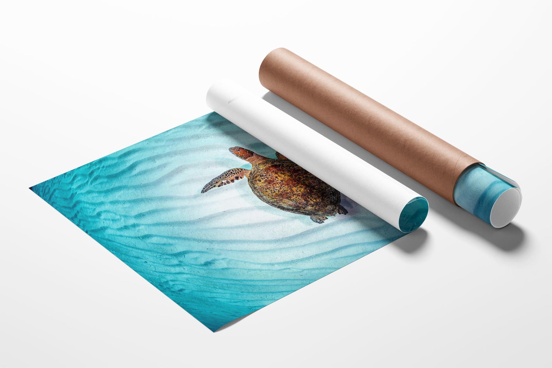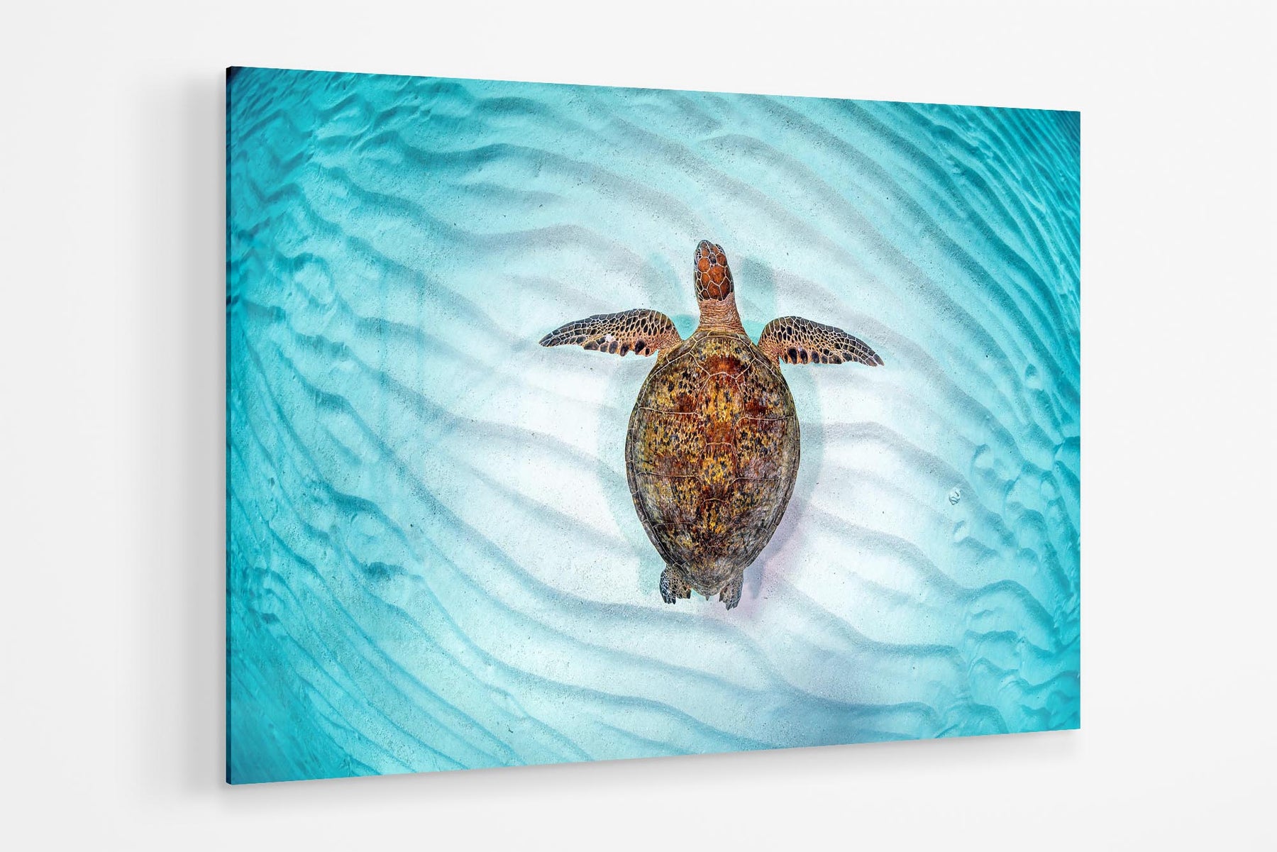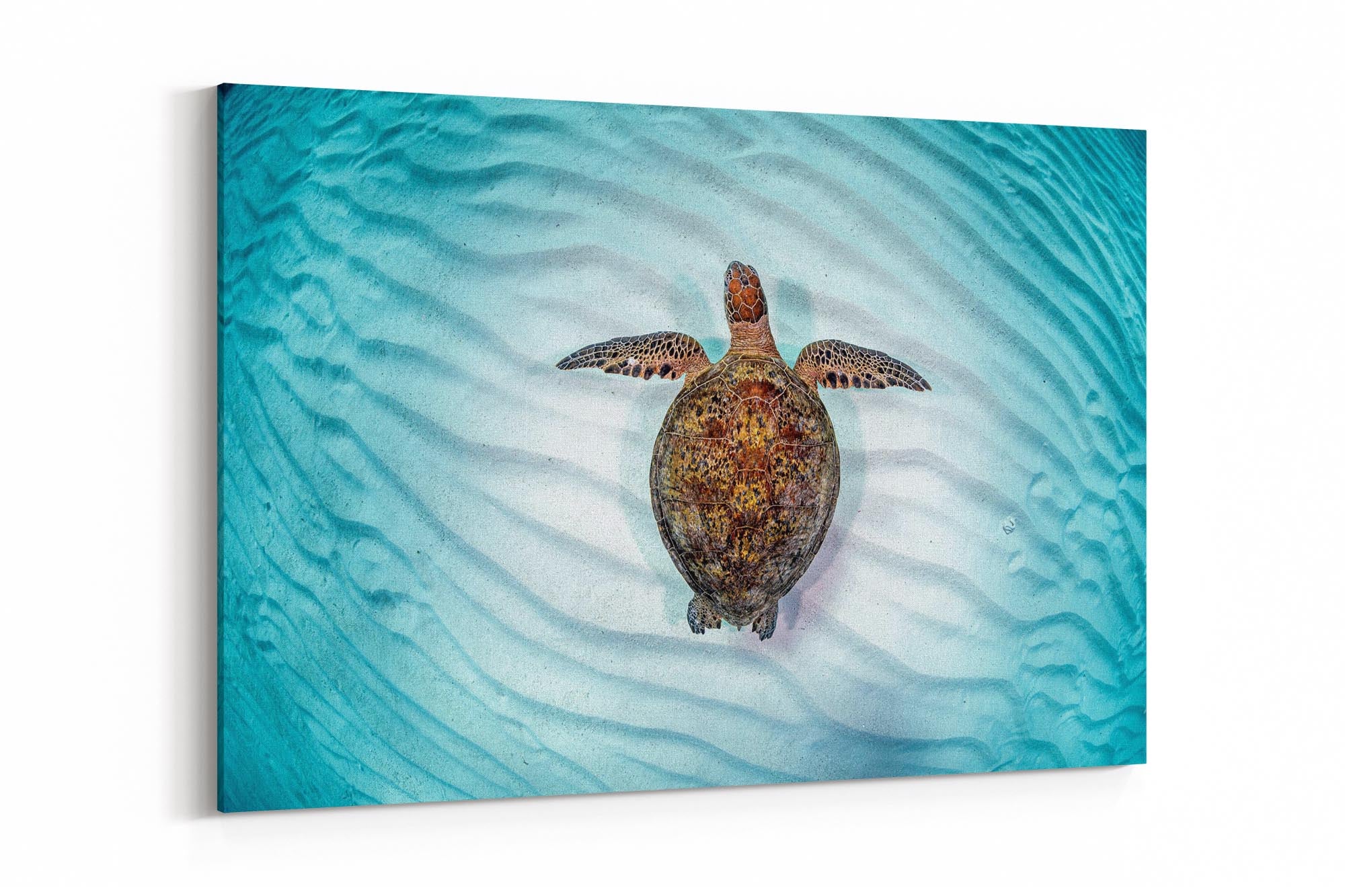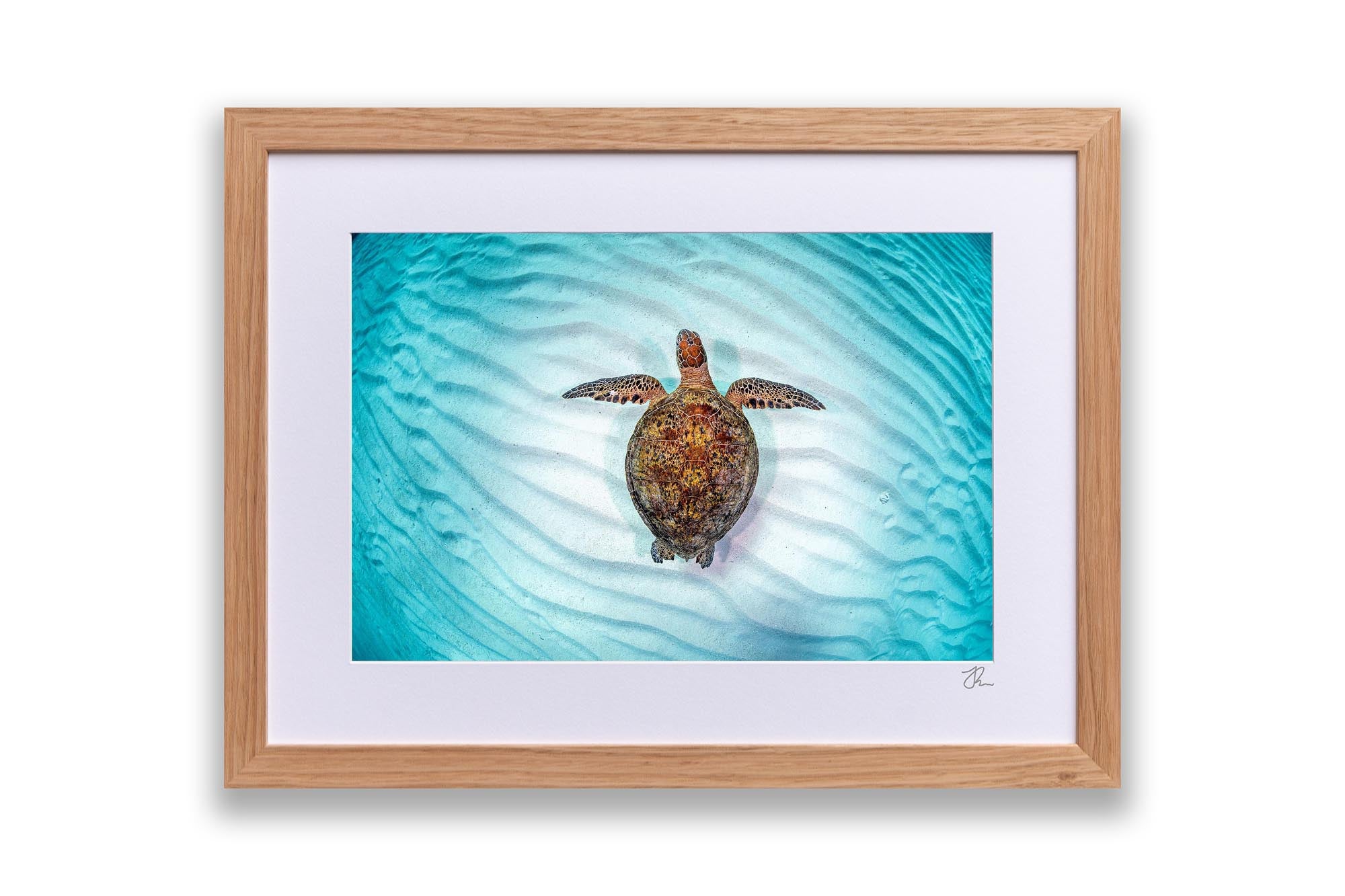Marvel at the serene beauty of this underwater photograph capturing a graceful Green Sea Turtle effortlessly gliding over the textured sandy sea floor. Shot in the crystal-clear waters of Lady Elliot Island on Australia's Southern Great Barrier Reef, this artwork brings the peaceful majesty of marine life into your space with stunning clarity.