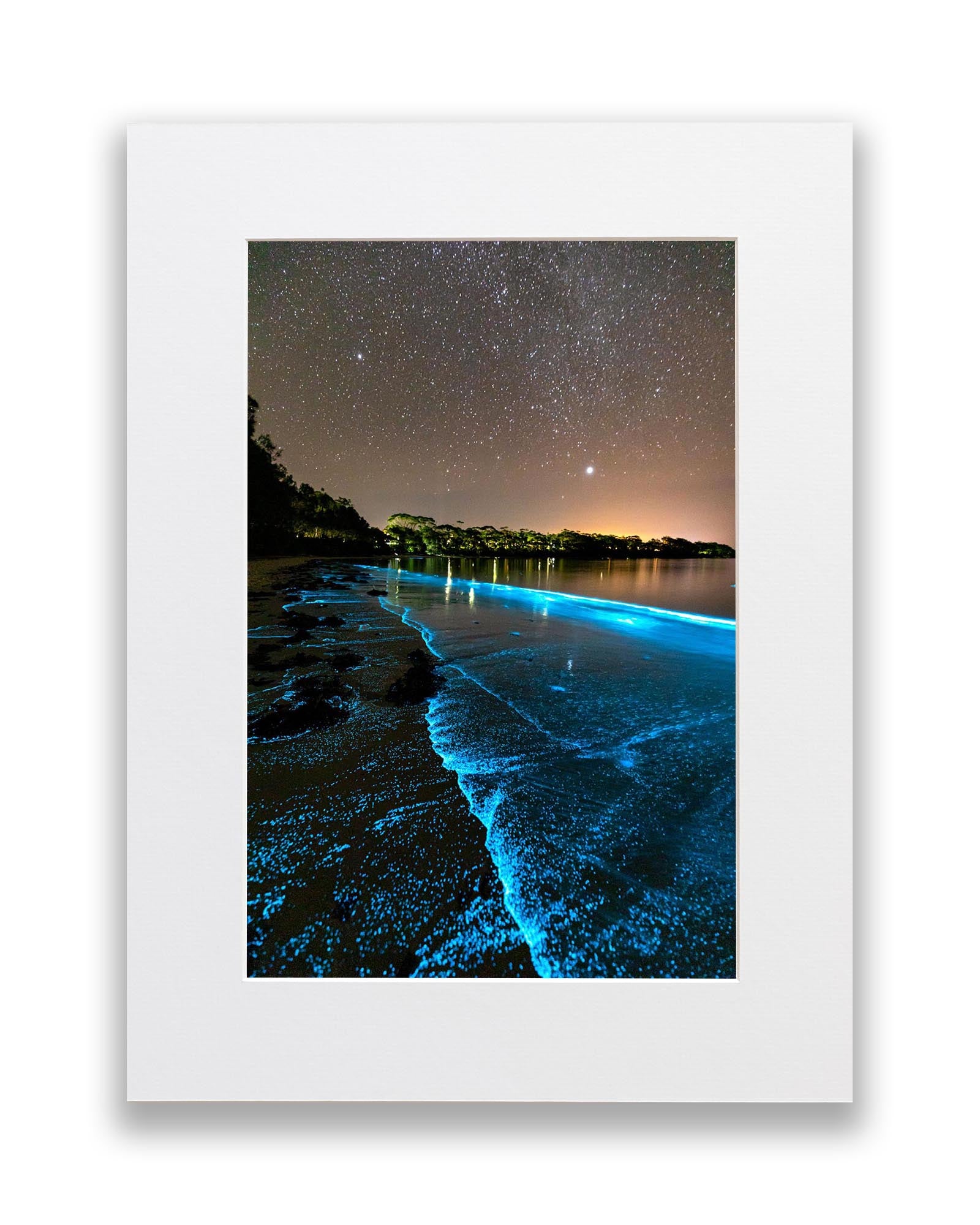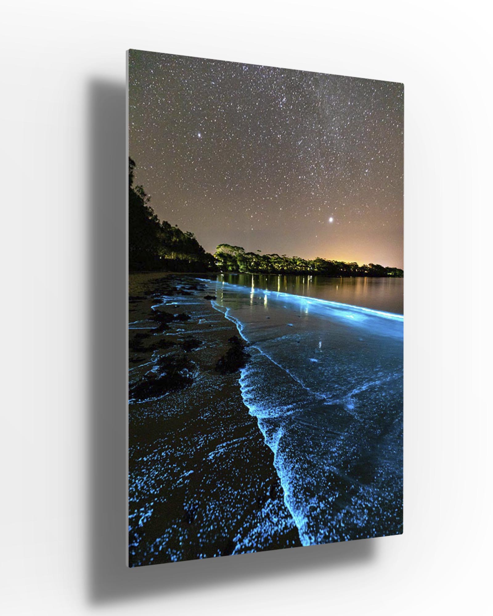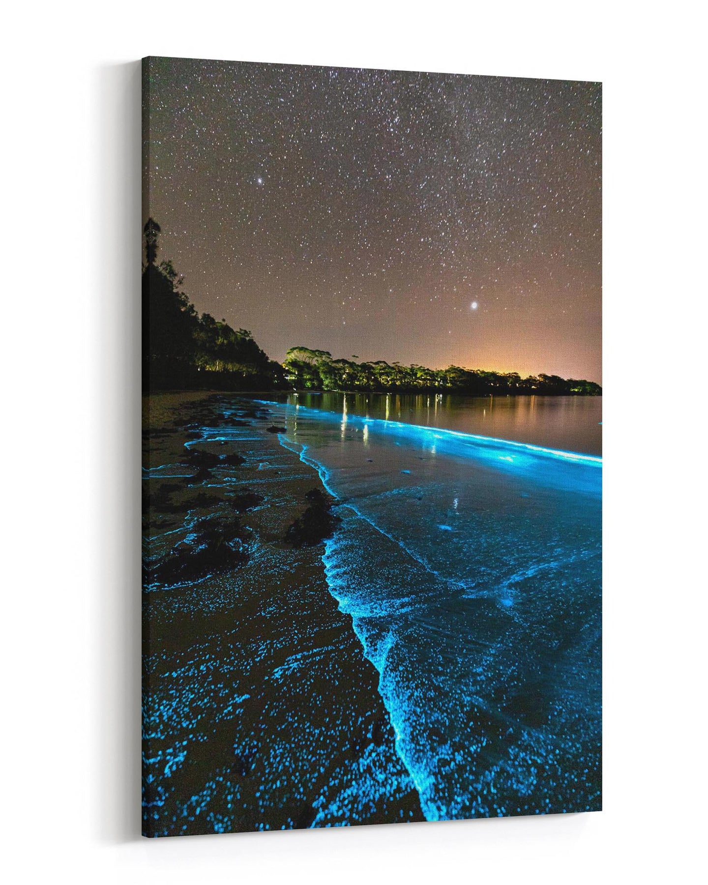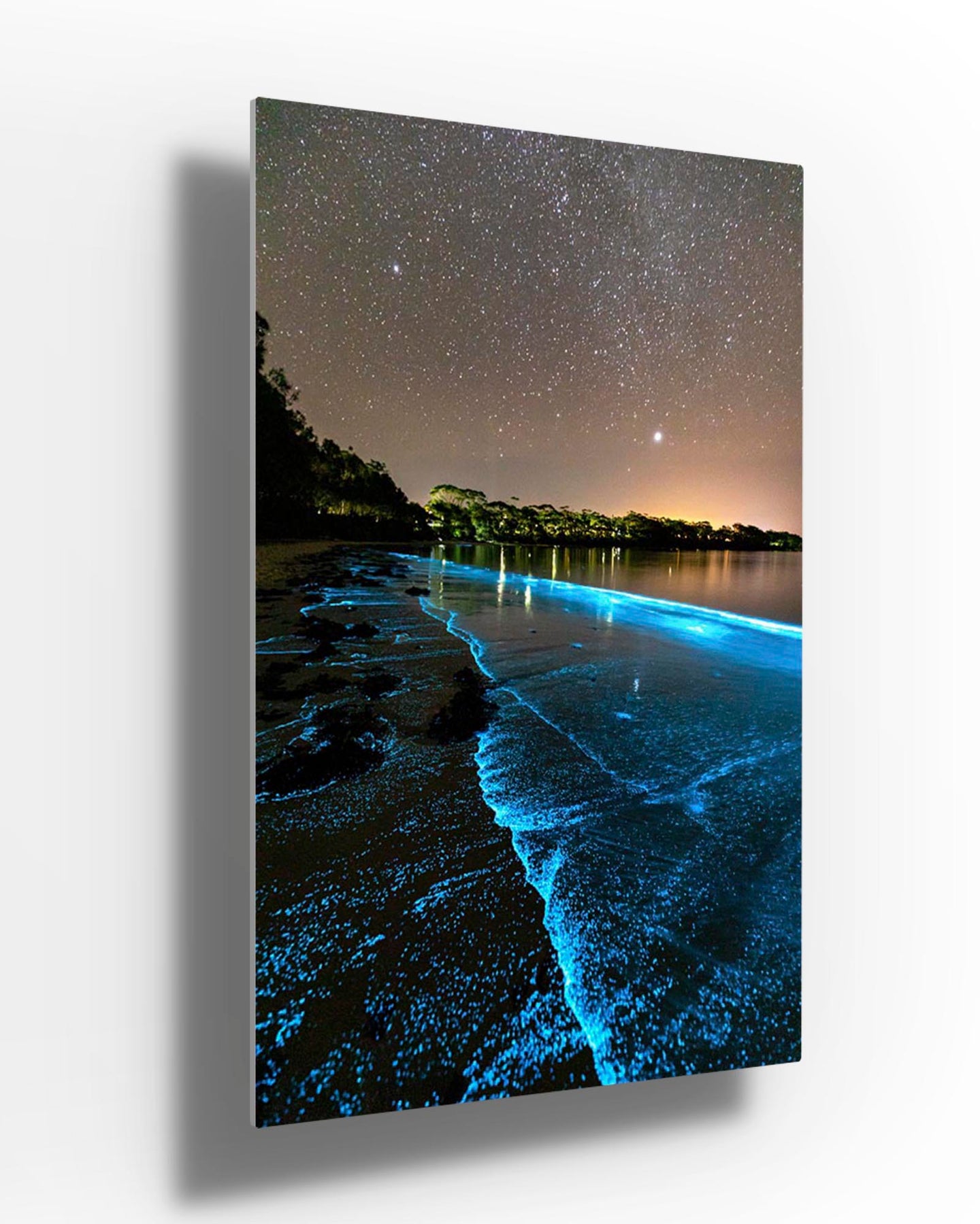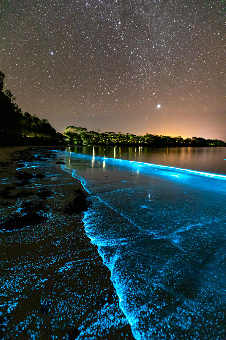 Bioluminescent algae lighting up the shoreline a bright blue in Jervis Bay.