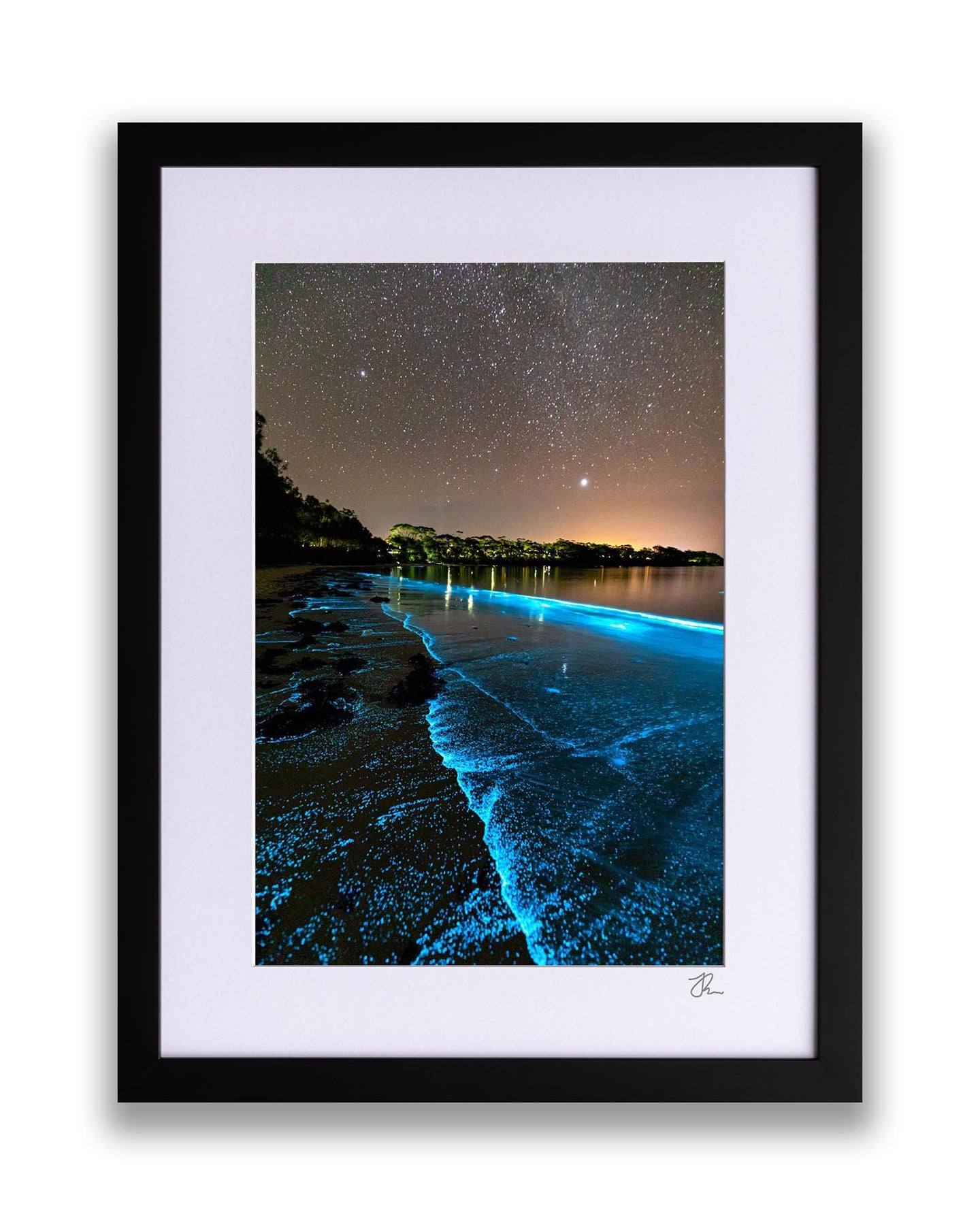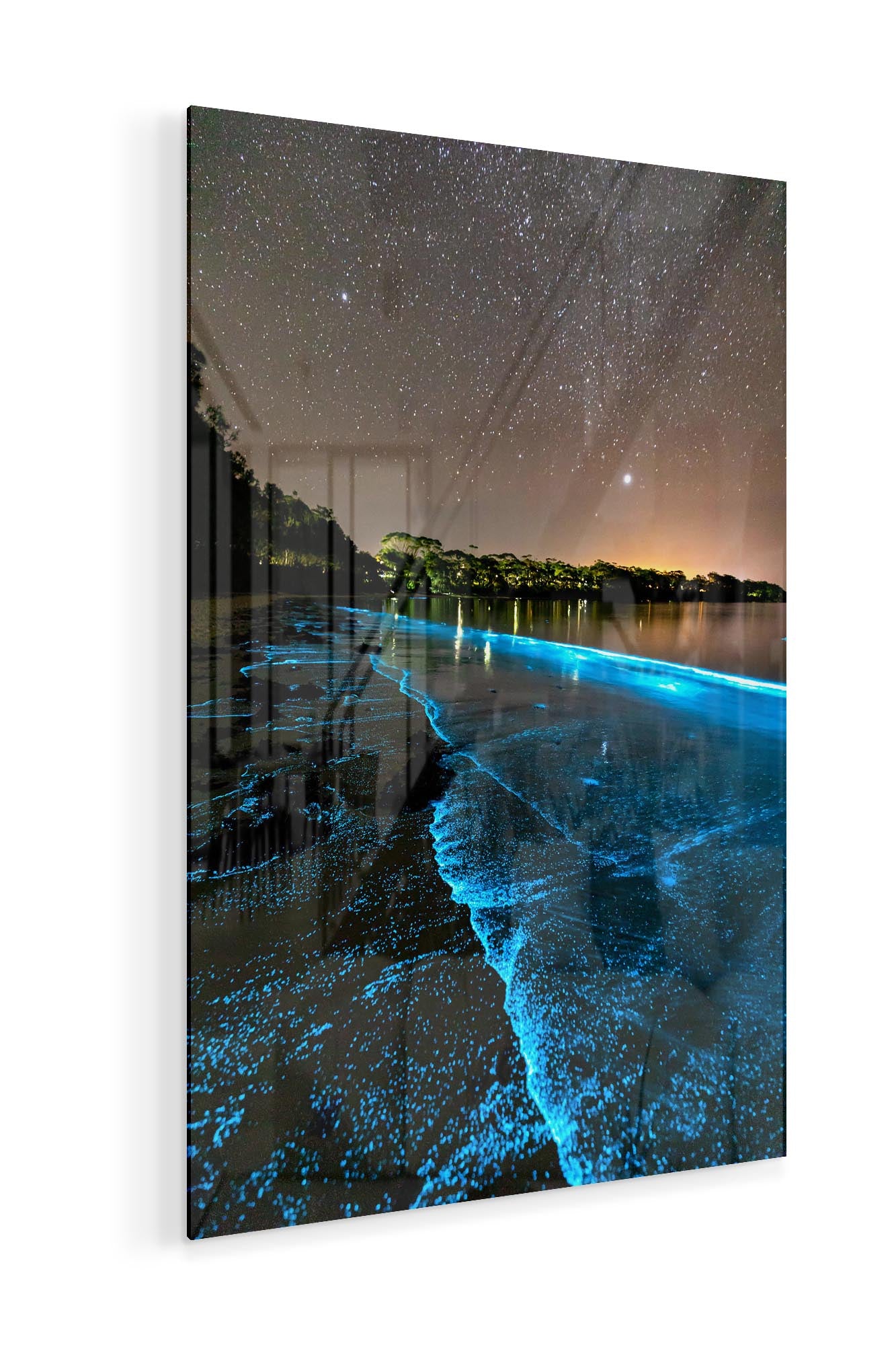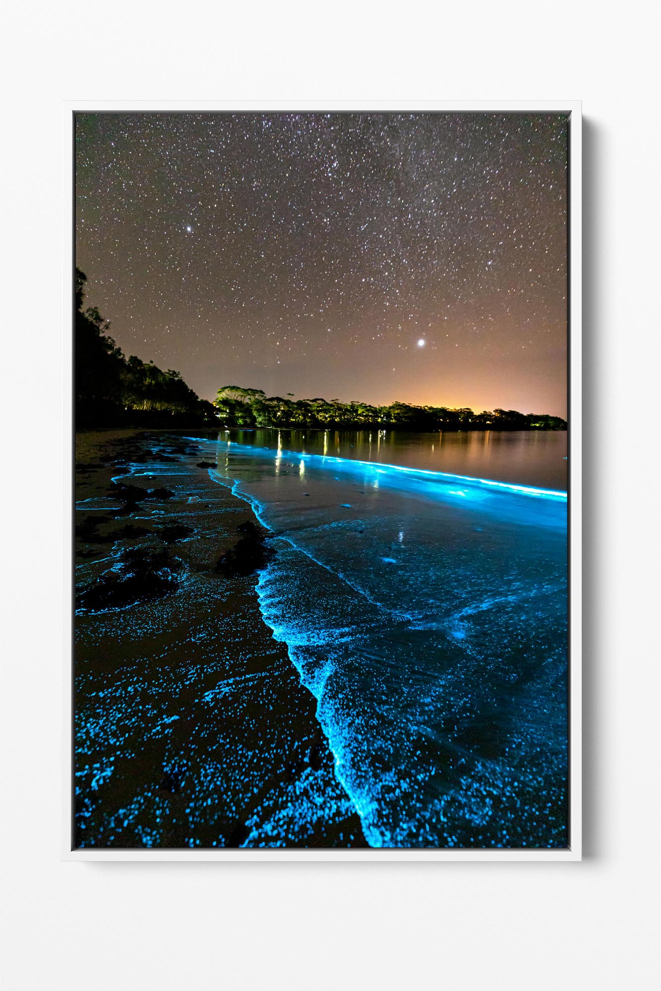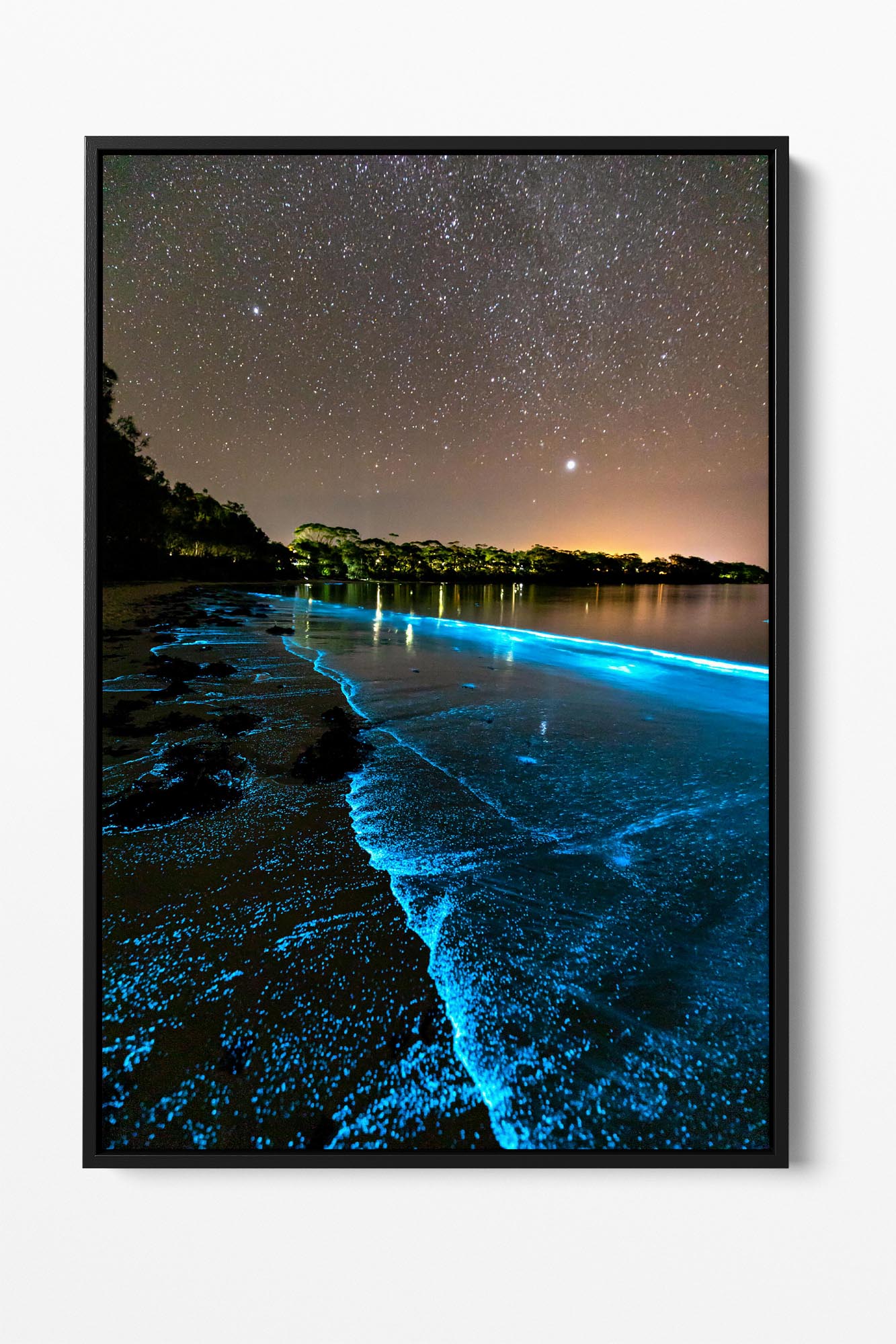 Bioluminescent algae lighting up the shoreline a bright blue in Jervis Bay.