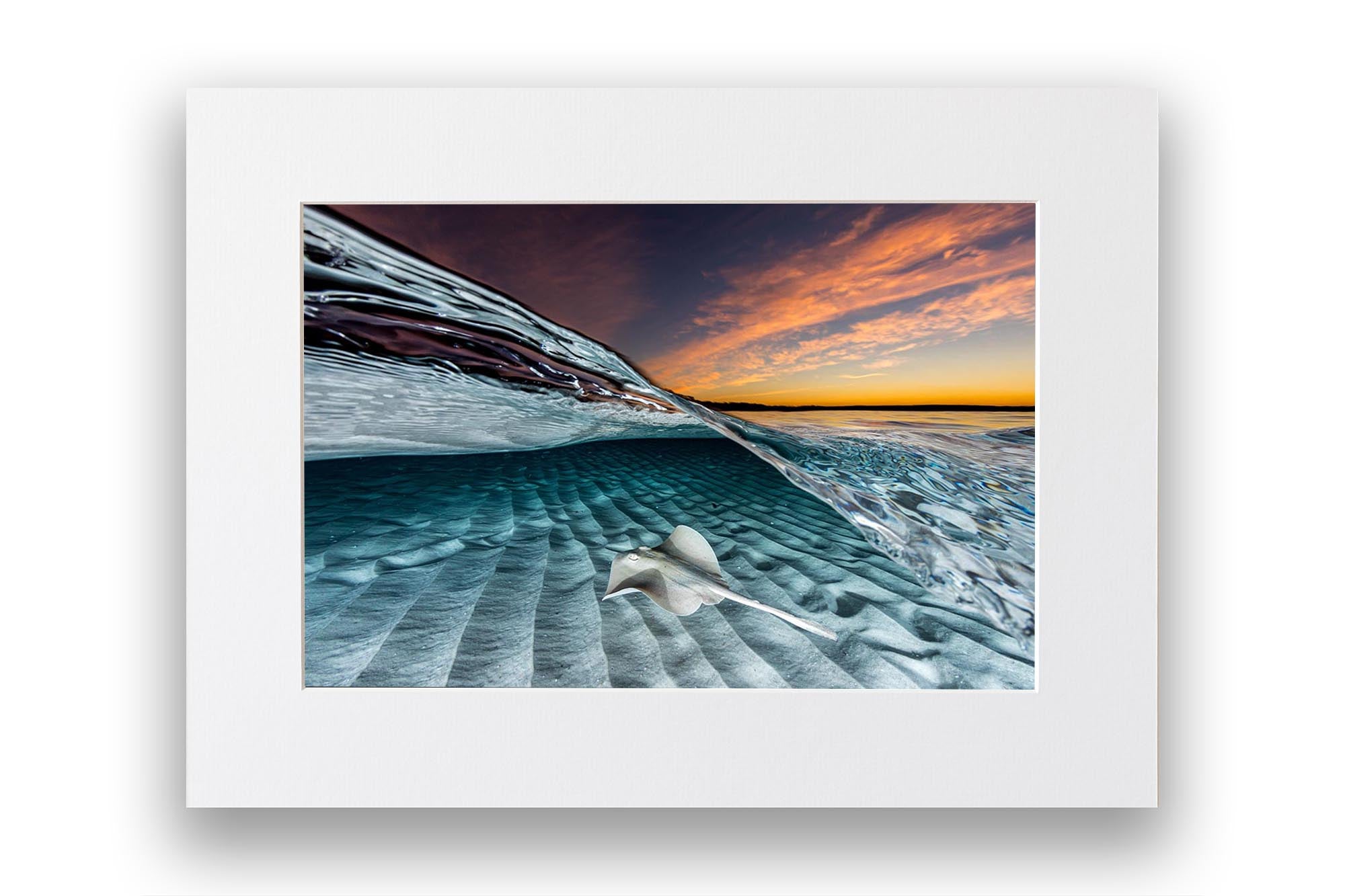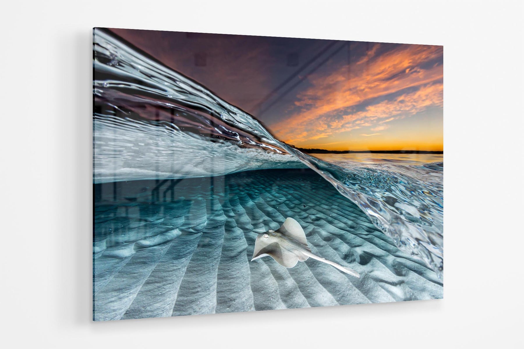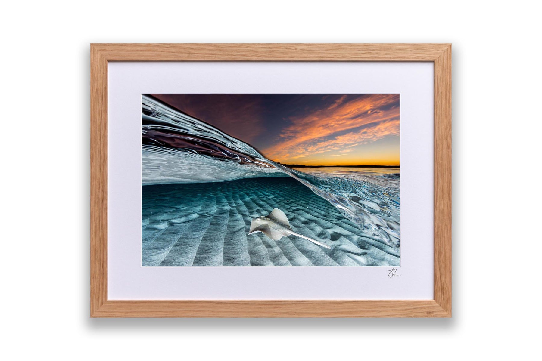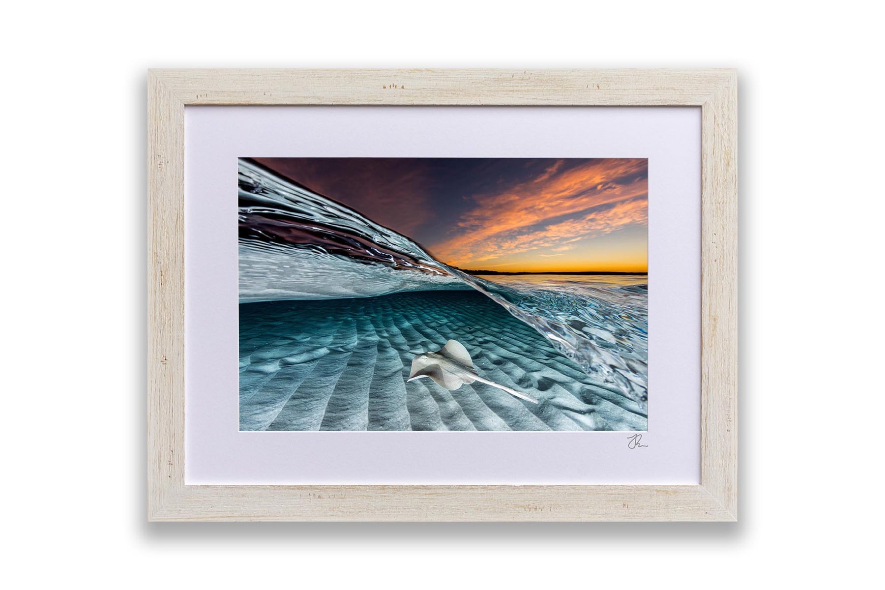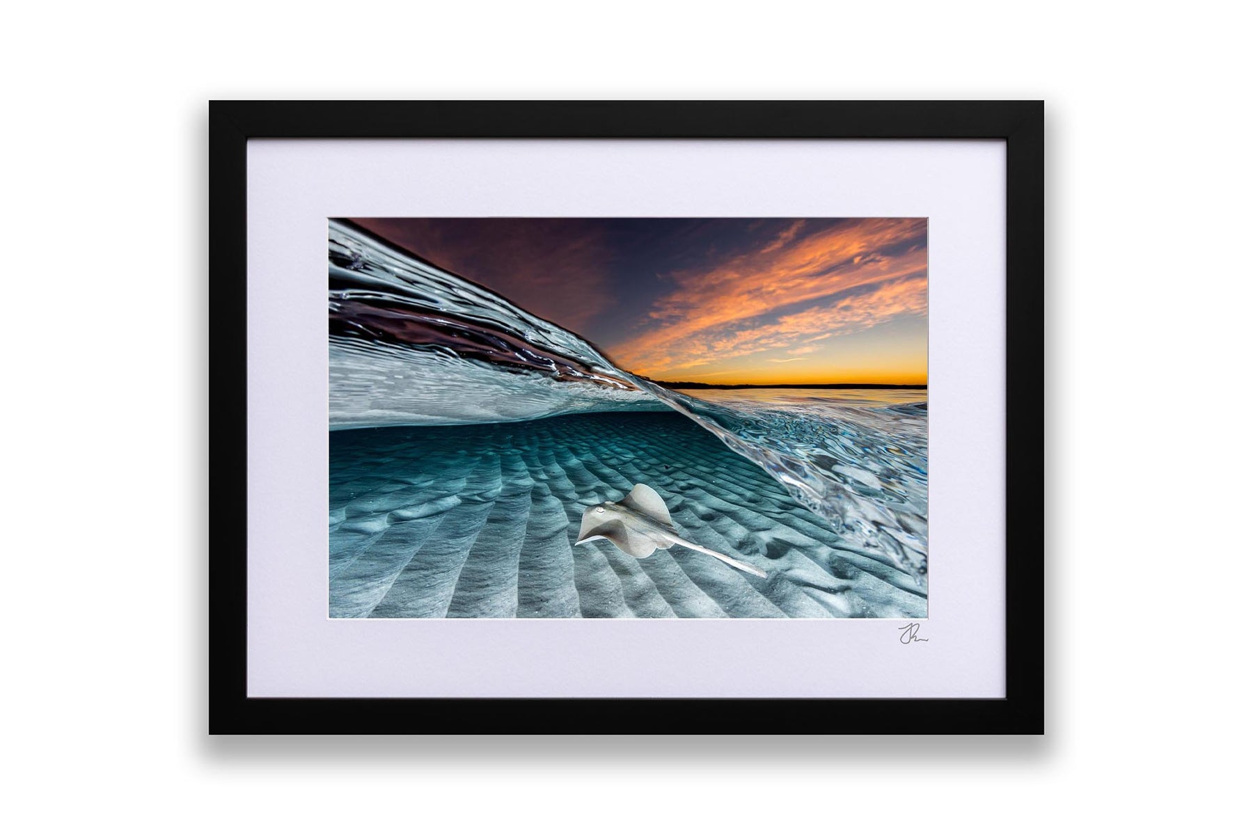 This mesmerising over-under photography print captures a Common Stingaree gliding effortlessly over Jervis Bay’s sunlit sand flats as the golden hues of sunset melt into the tranquil turquoise shallows.