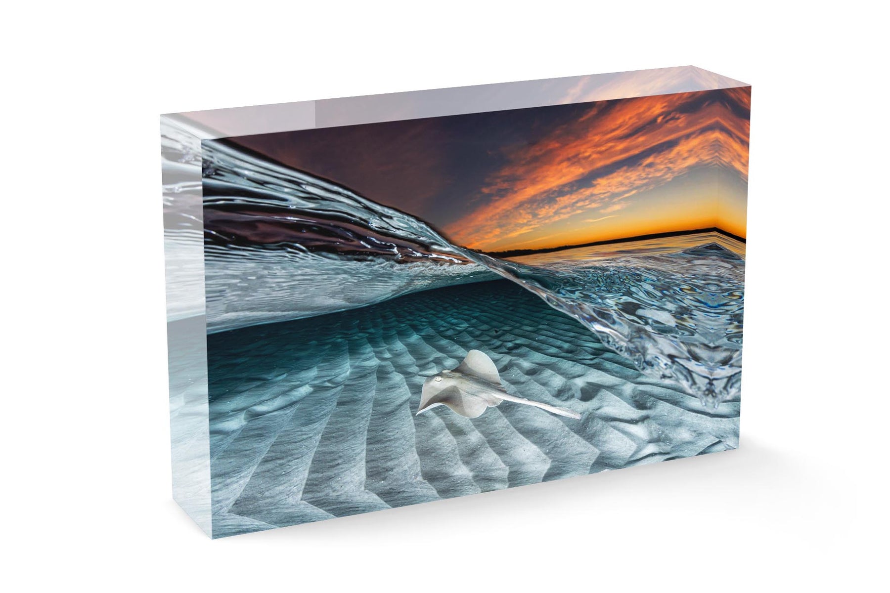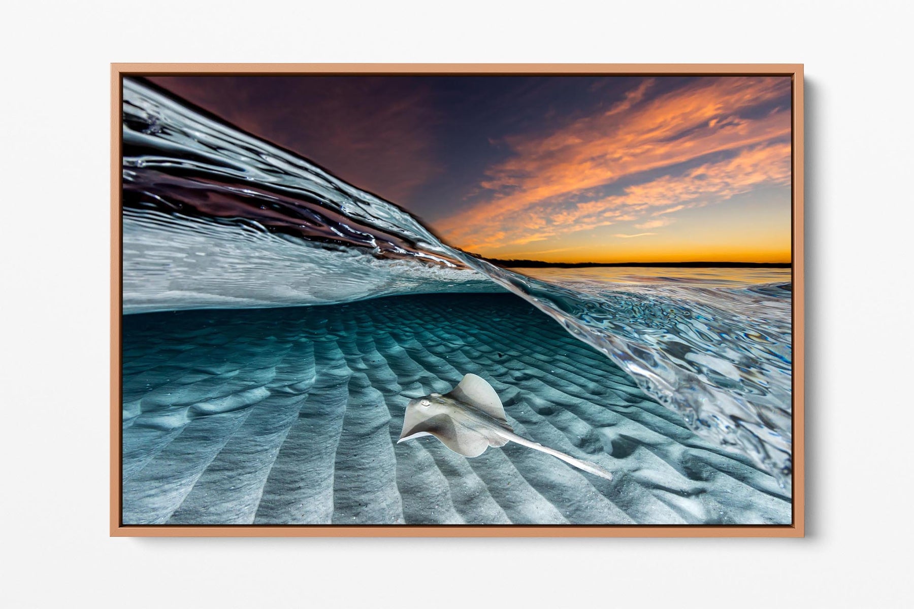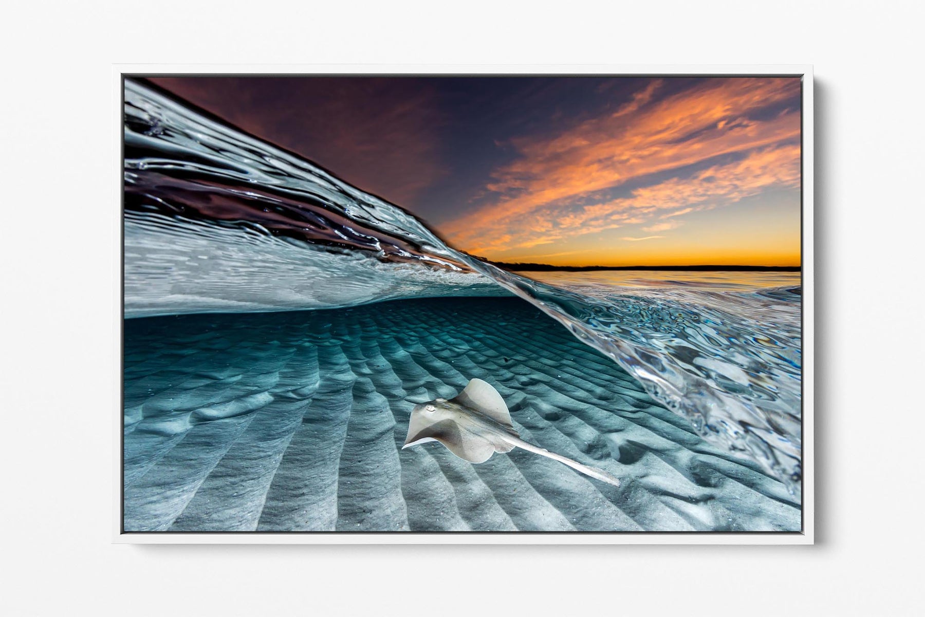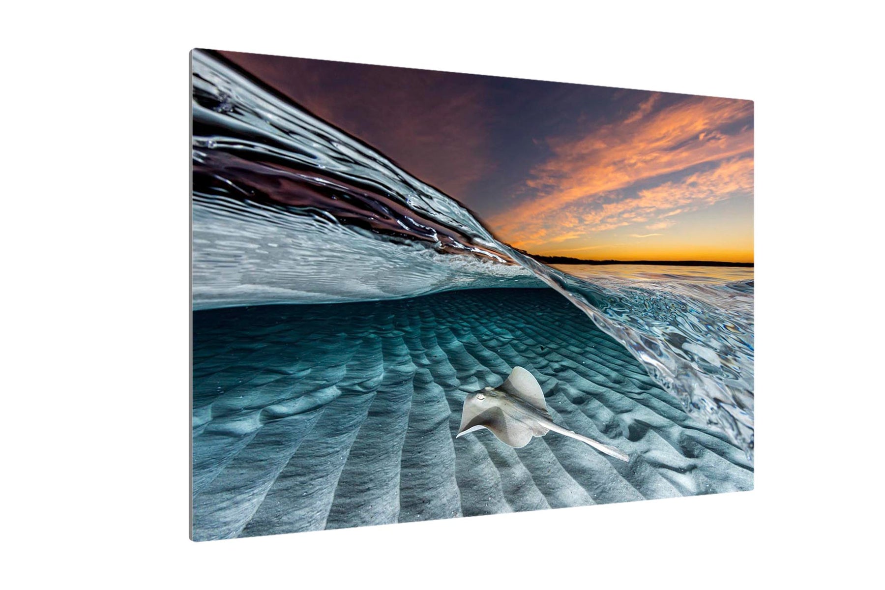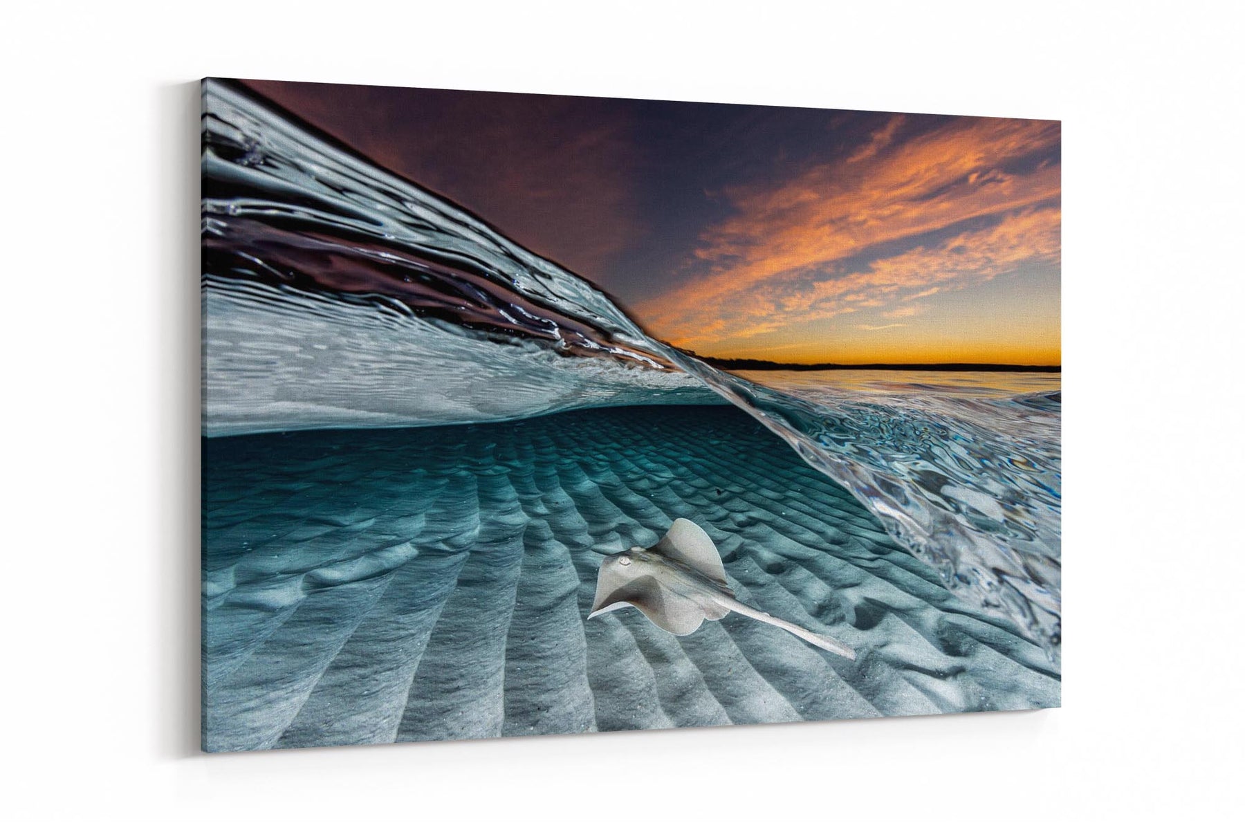 This mesmerising over-under photography print captures a Common Stingaree gliding effortlessly over Jervis Bay’s sunlit sand flats as the golden hues of sunset melt into the tranquil turquoise shallows.