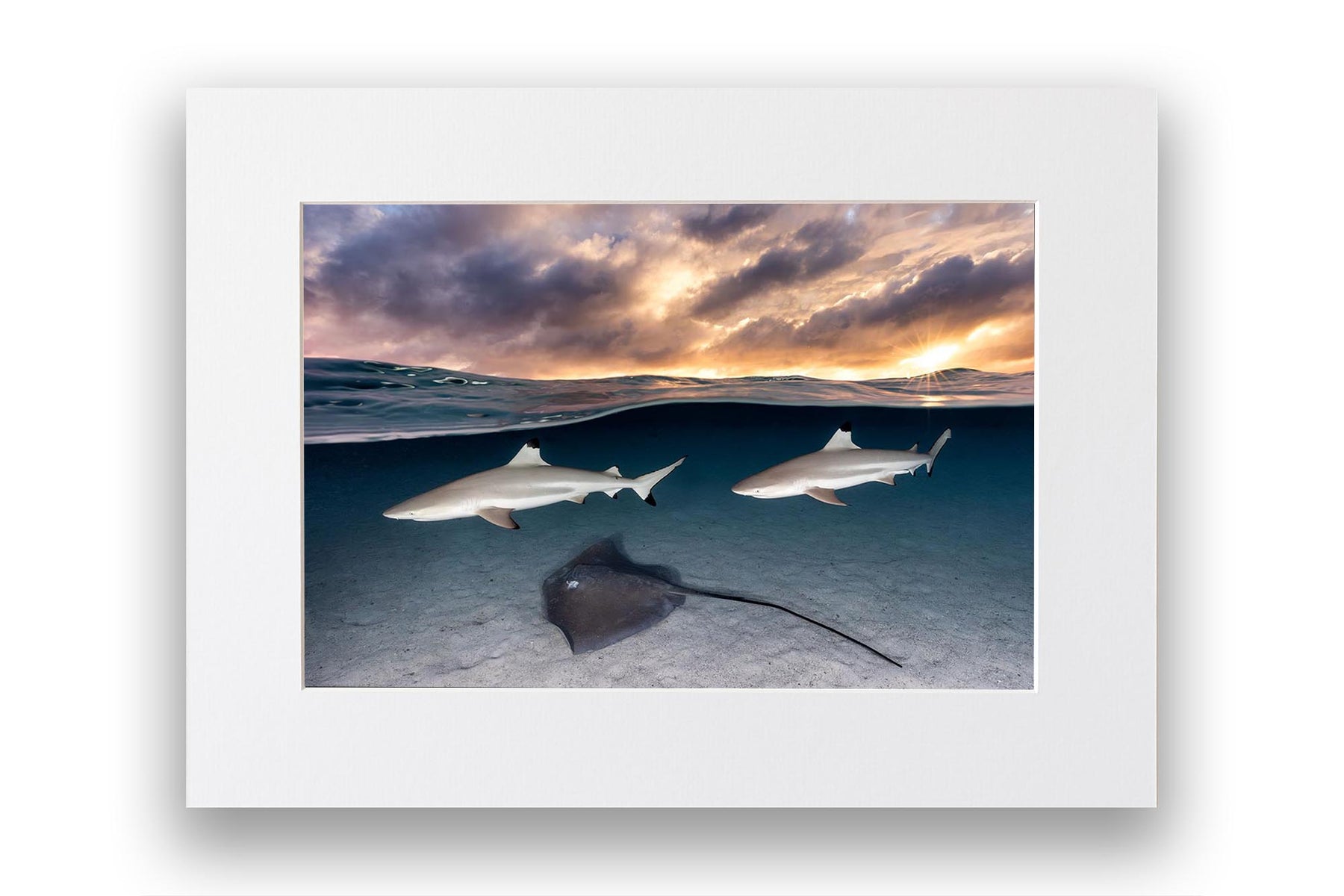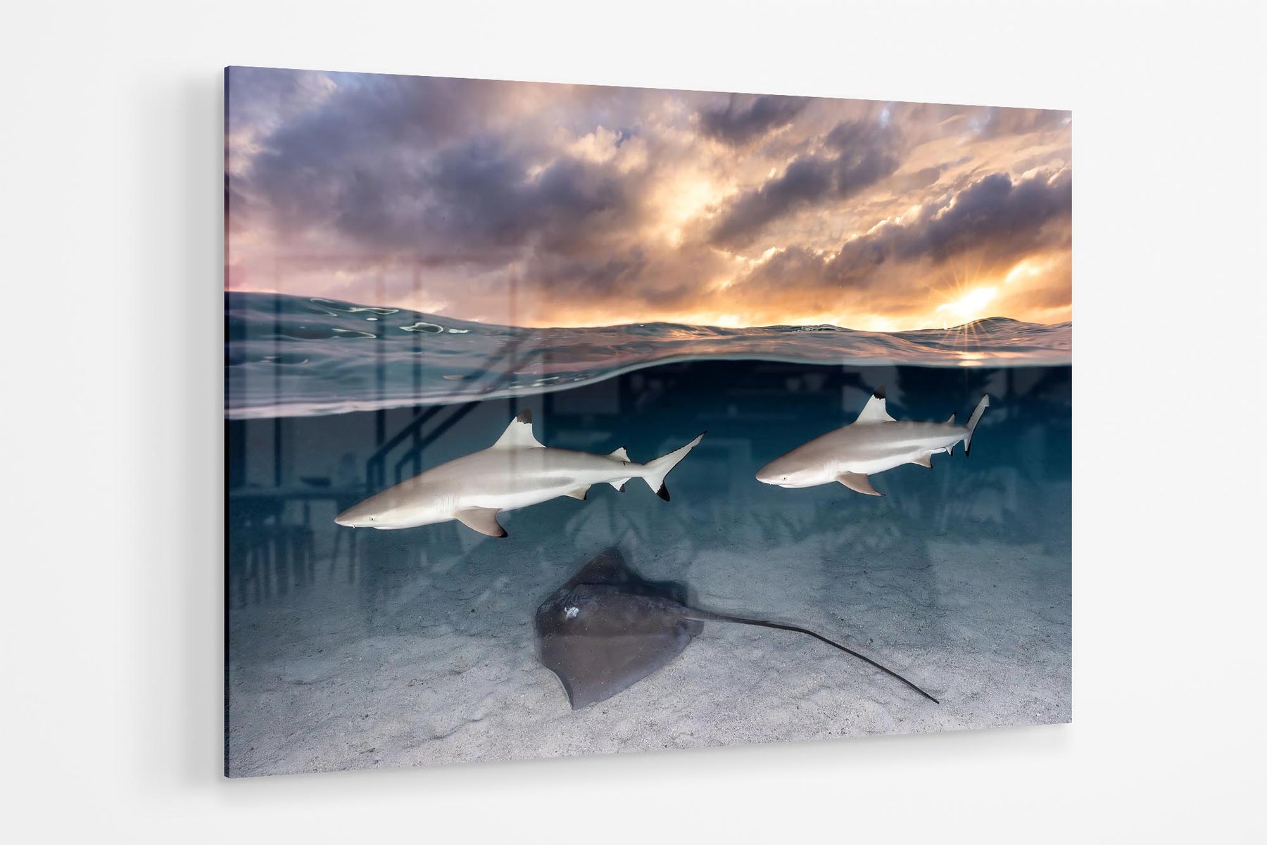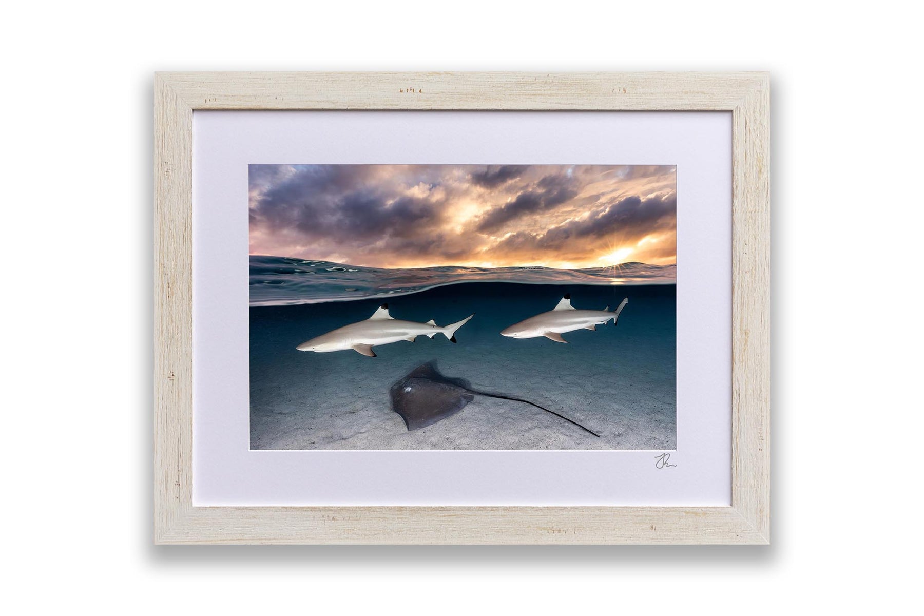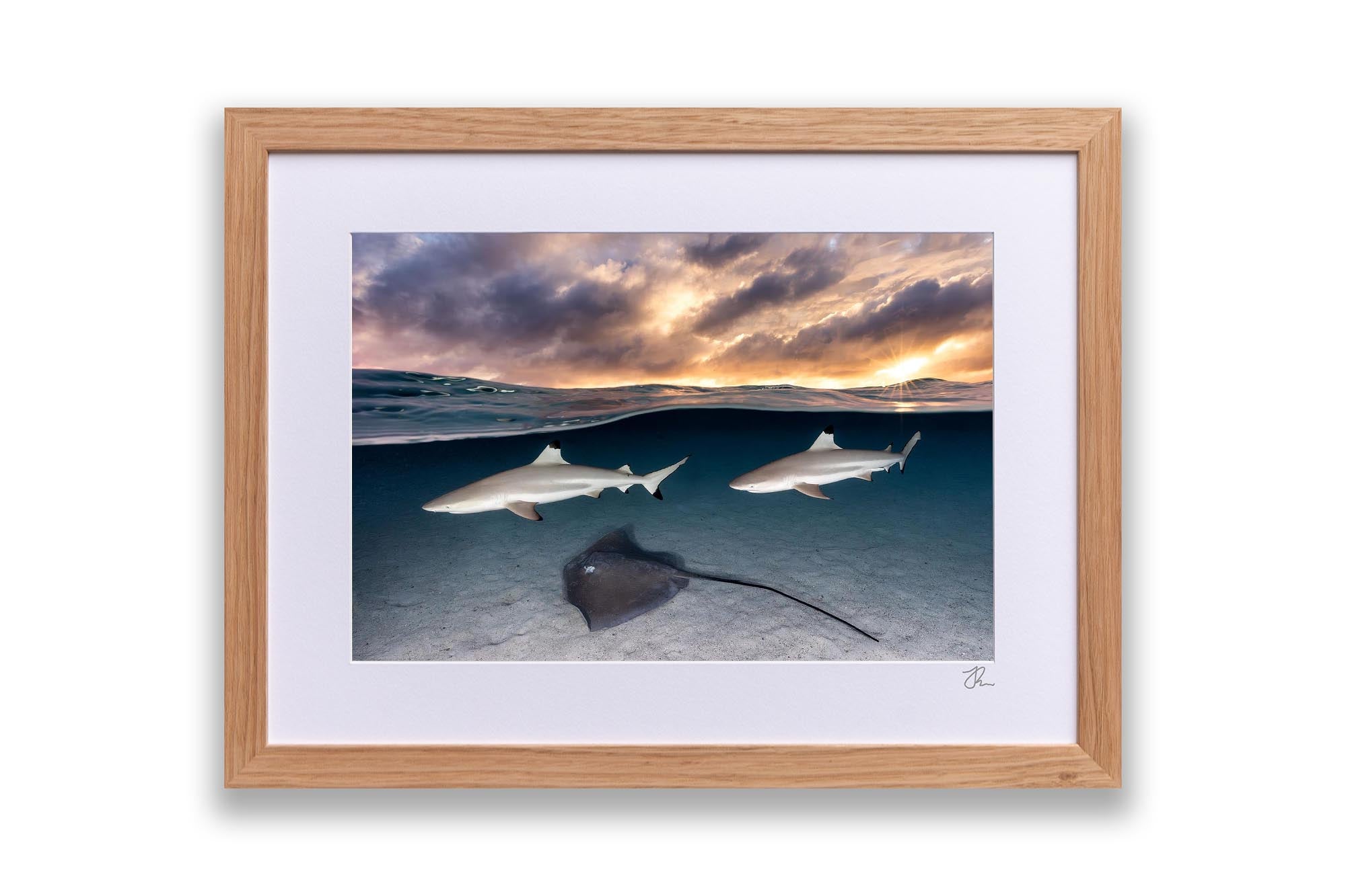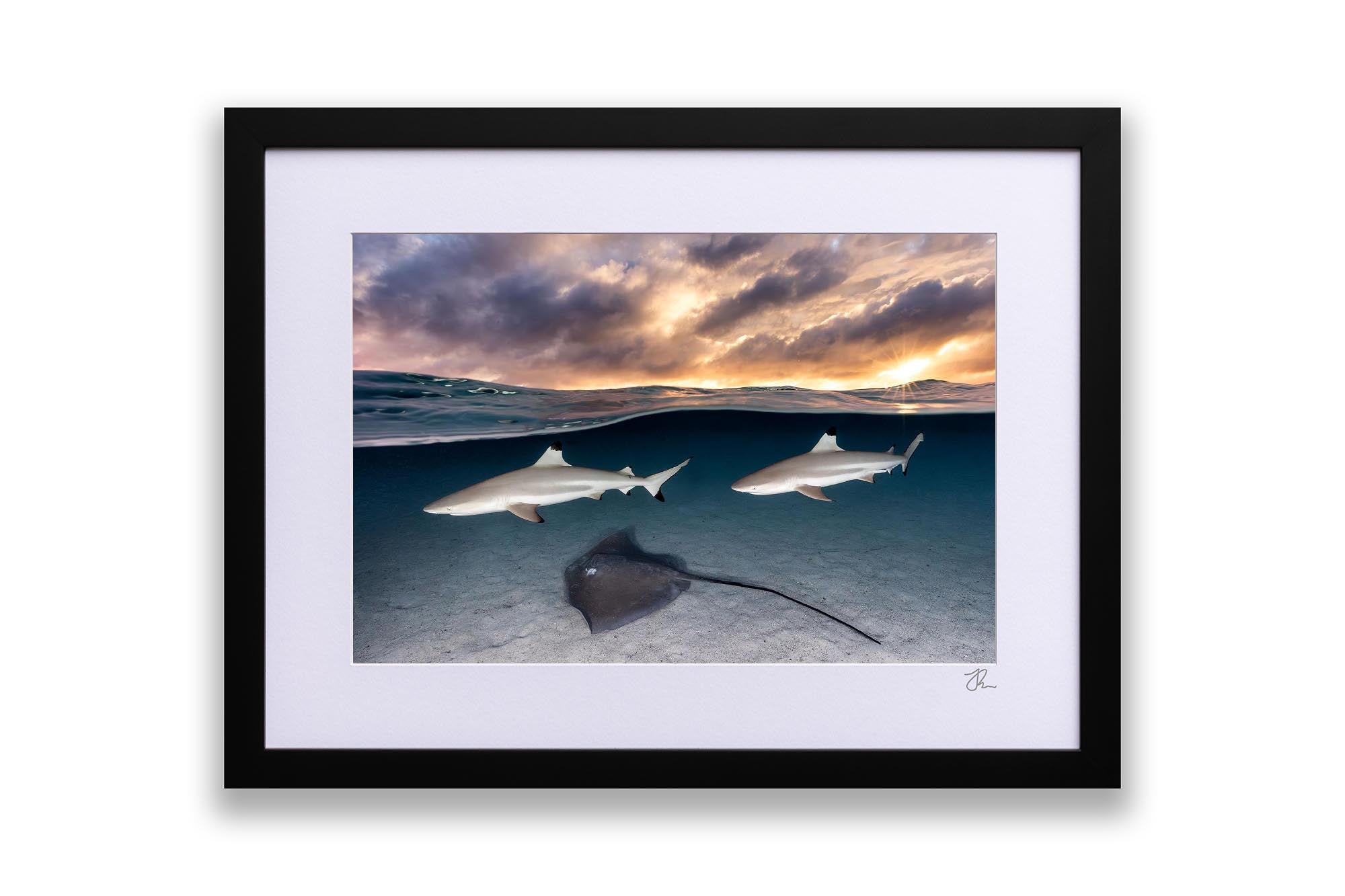 This captivating over-under photography print captures Blacktip Reef Sharks alongside a Whiptail Stingray gliding over Mo’orea’s sunlit sand flats at sunrise. The split-shot composition artfully merges the sharks’ sleek silhouettes and the stingray’s elegant motion beneath the water with the golden hues of dawn reflecting on the surface.