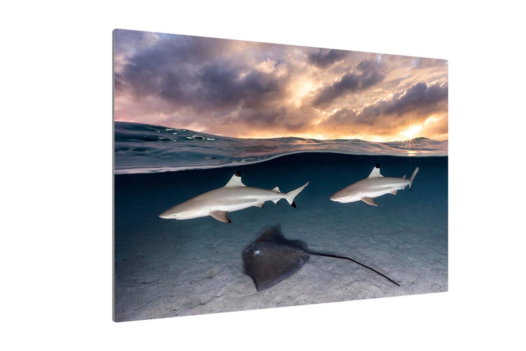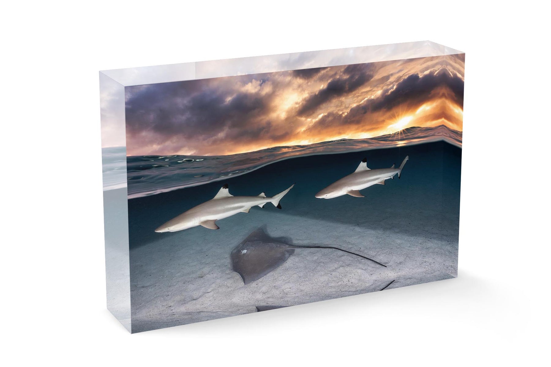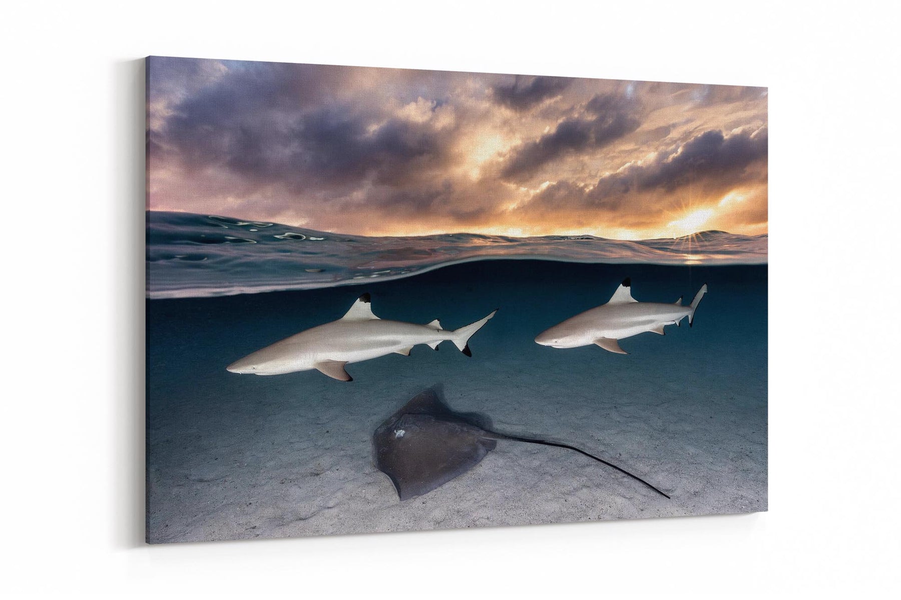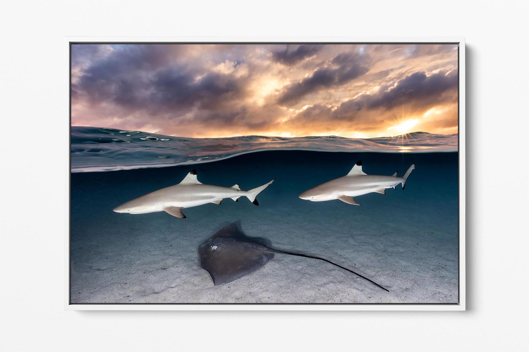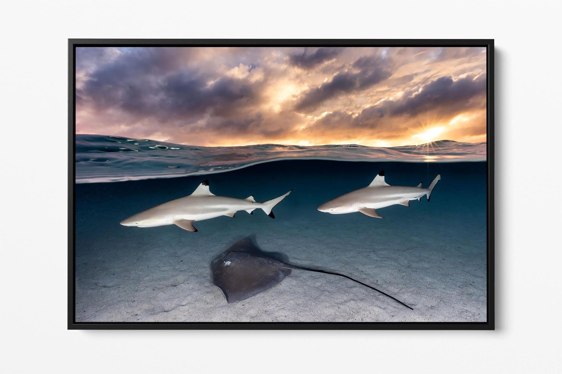 This captivating over-under photography print captures Blacktip Reef Sharks alongside a Whiptail Stingray gliding over Mo’orea’s sunlit sand flats at sunrise. The split-shot composition artfully merges the sharks’ sleek silhouettes and the stingray’s elegant motion beneath the water with the golden hues of dawn reflecting on the surface.